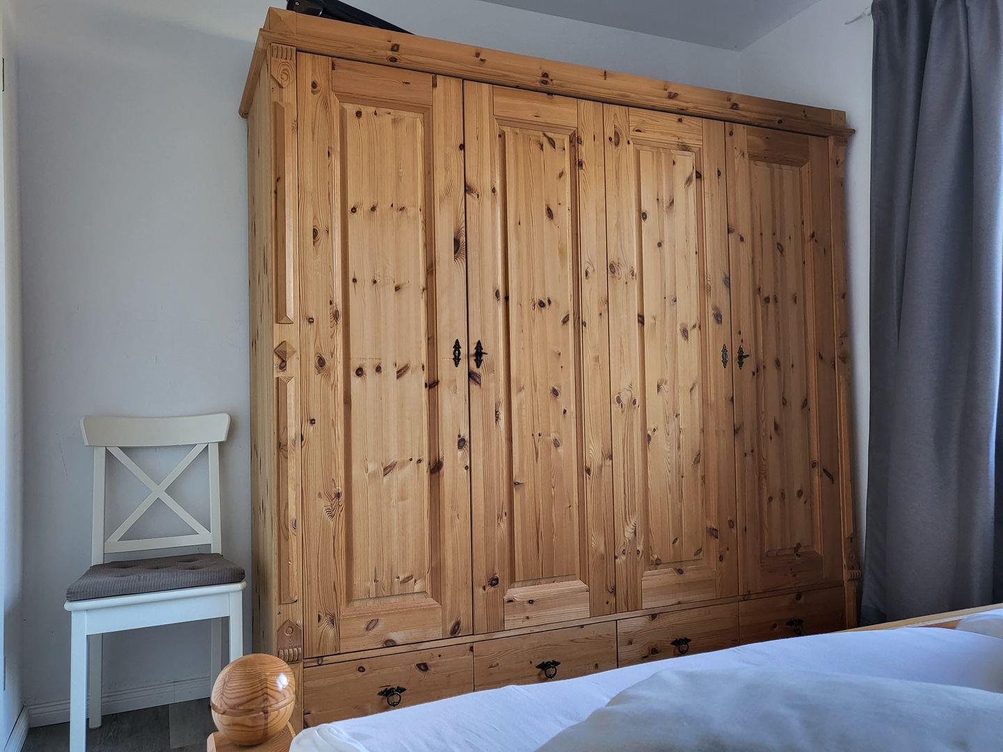 Das Wohnzimmer ist ausgestattet mit einem hochwertigen Schlafsofa und gemütlichen Sitzgelegenheiten. Für gemütliche Abende und Unterhaltung sorgen ein großer Flachbild-TV und kostenfreies W-LAN. Helle Farben, moderne Einrichtung und Panoramafenster sorgen für eine wohnliche Atmosphäre im Wohnraum. Die integrierte Küchenzeile ist sehr gut ausgestattet und bietet neben einem Induktionkochfeld und Backofen noch Kühlschrank mit Gefrierfach und Spülmaschine. Das Schlafzimmer ist ausgestattet mit komfortablem 180x200cm Doppelbett und einem großen Kleiderschrank. Ein Babyreisebett und ein Kinderhochstuhl stehen kostenfrei zur Verfügung. Zur Ferienwohnung gehört ein modern gestaltetes Badezimmer mit Dusche, Waschbecken und WC.