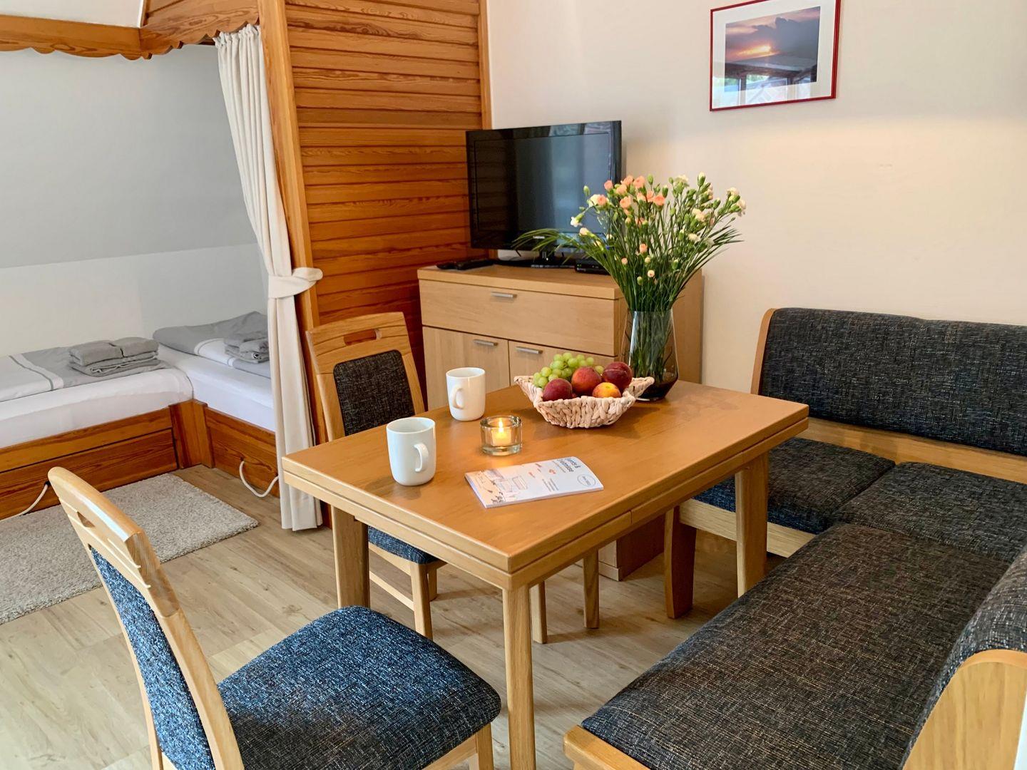 Das Wohnzimmer ist ausgestattet mit einem gemütlichen Essbereich sowie einer komfortablen Sitzecke mit Couch und Sessel. Weiterhin stehen zwei Kojenbetten zur Verfügung.