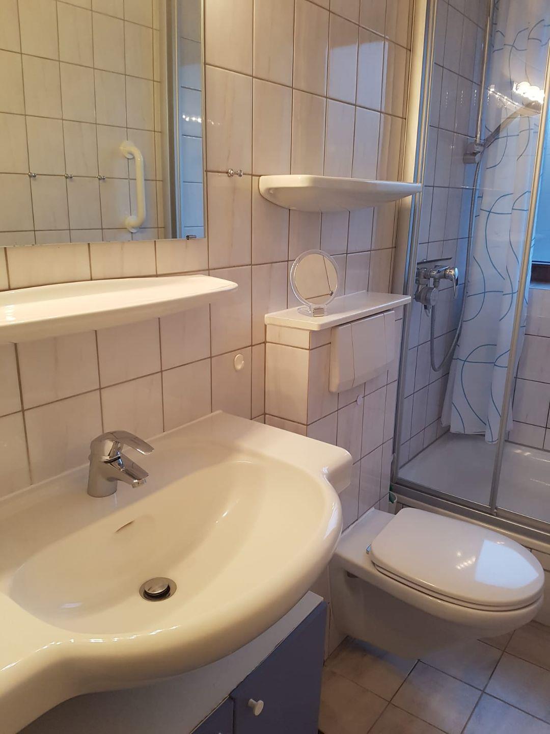 Zur Ferienwohnung gehört ein Duschbad mit WC, im Keller steht eine gemeinschaftlich nutzbare Münzwaschmaschine bereit.