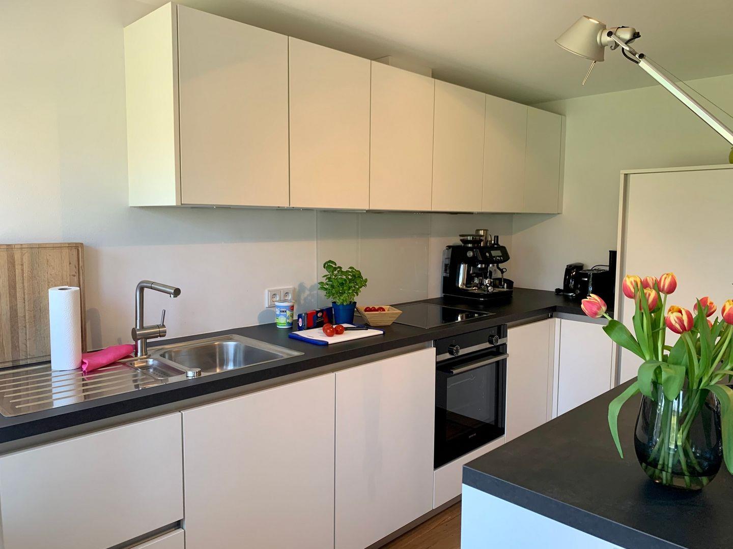 In den Raum integriert liegt die Komfort-Küche der Ferienwohnung. Dort bietet ein edler Tresen mit Barhockern einen gesonderten Sitz- und Essbereich. Zur hochwertigen Ausstattung der Küche gehören unter anderem Induktionskochfeld und Backofen, Kühlschrank mit Gefrierfach, Geschirrspüler und eine Kaffeemaschine. Eine hochwertige Espressomaschine mit Siebträger ist ebenfalls vorhanden. Im Erdgeschoss ist weiterhin ein Gäste-WC vorhanden, dort sind Waschmaschine und Trockner vorhanden.