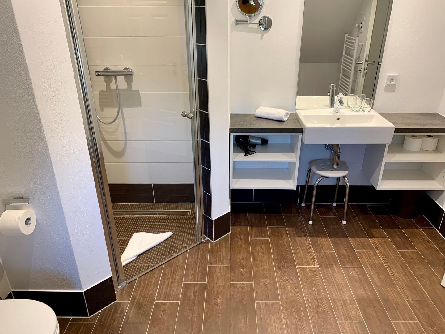 Im Obergeschoss sind 2 Schlafzimmer untergebracht. Beide sind ausgestattet mit großem 180x200cm Doppelbett, in einem steht ein weiterer Flachbild-TV zur Verfügung. Zwei gut ausgestattete Luxusduschbäder sind ebenfalls auf der Etage vorhanden, dort sind bodengleiche Duschen verbaut. Mit offener Galerie im Dachgeschoss ist ein weiteres Doppelbett untergebracht, dort steht auch ein Babybett zur Verfügung. Auch hier steht ein Flachbild-TV zur Verfügung.