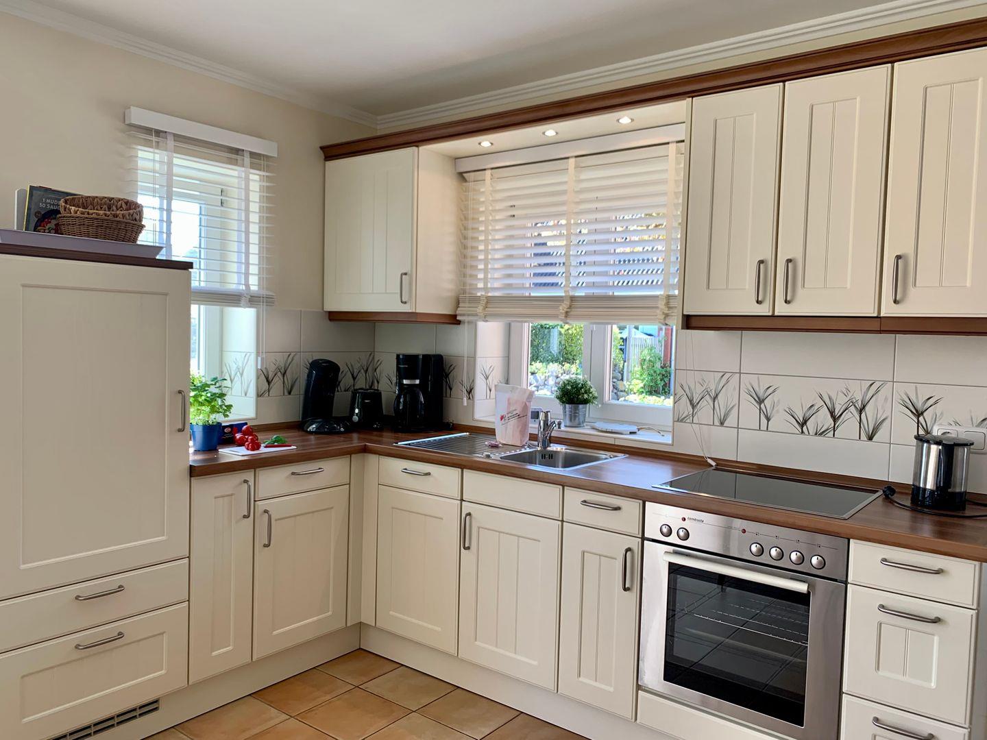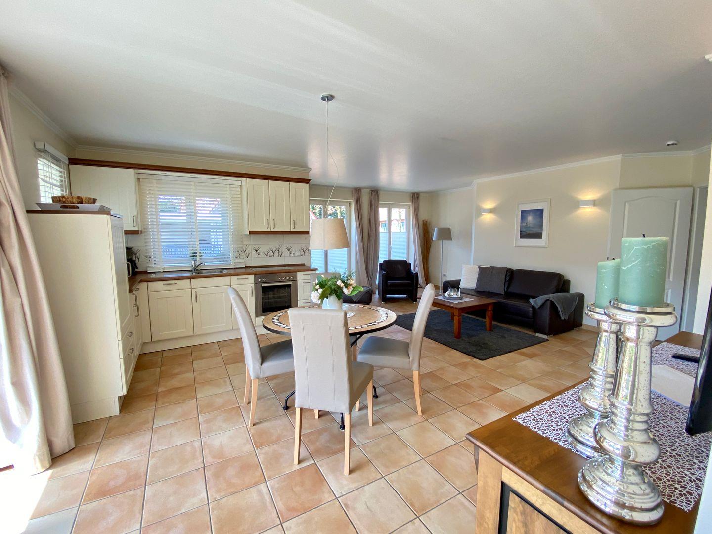 Die integrierte Küche ist modern und umfangreich ausgestattet, unter anderem sind Cerankochfeld und Backofen, Kühlschrank mit Gefrierfach sowie Geschirrspüler und Kaffeemaschine vorhanden.