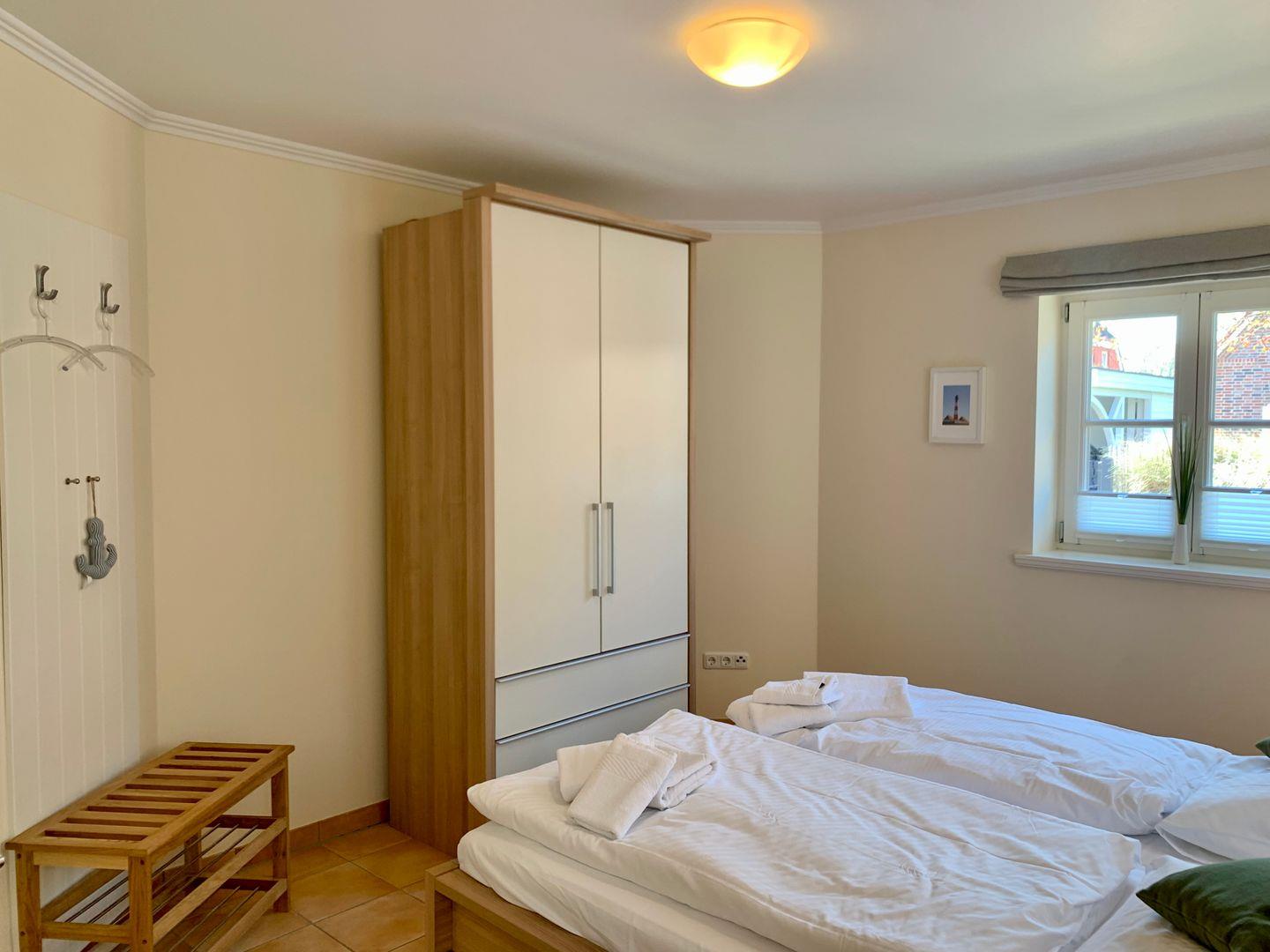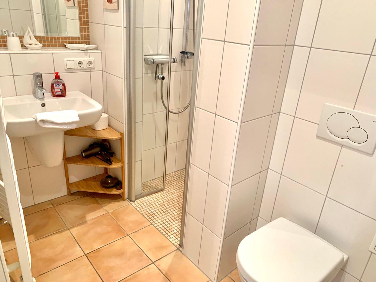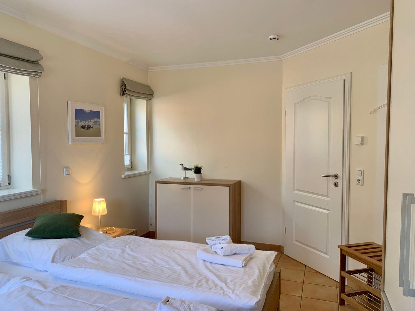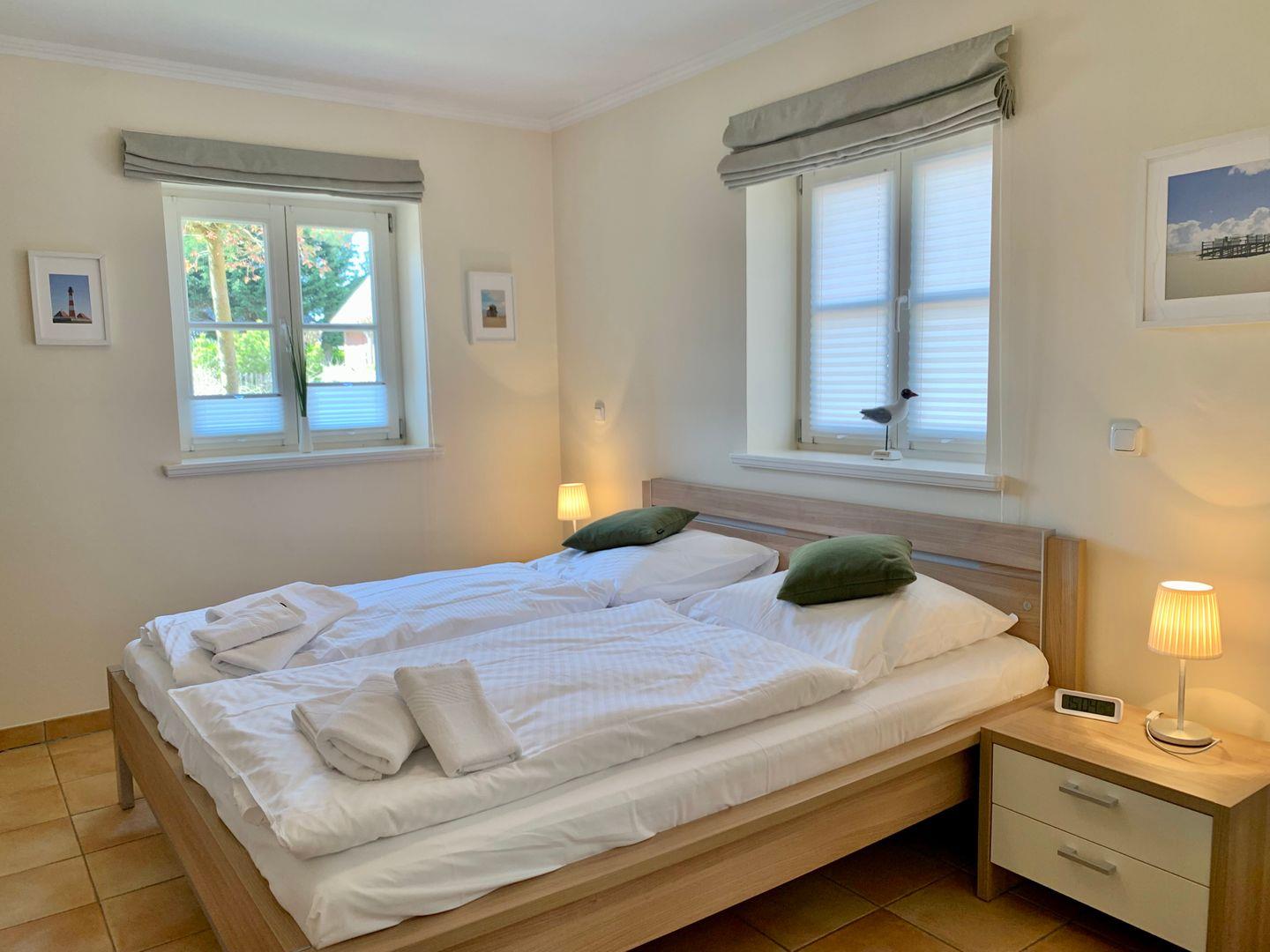 Zur Ferienwohnung gehören 2 Schlafzimmer. Eines ist ausgestattet mit großen 180x200cm Doppelbett, ein weiteres mit einem geräumigen 120x200cm Einzelbett. Ebenfalls gehört ein Badezimmer mit ebenerdiger Dusche und WC zur Ausstattung der Ferienwohnung, ein Handtuchtrockner ist ebenfalls vorhanden.
