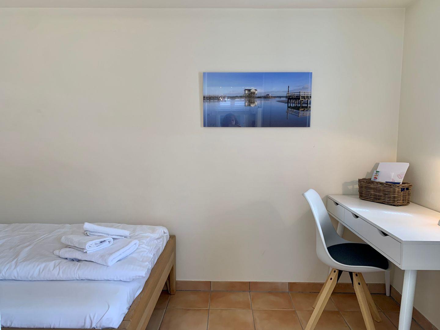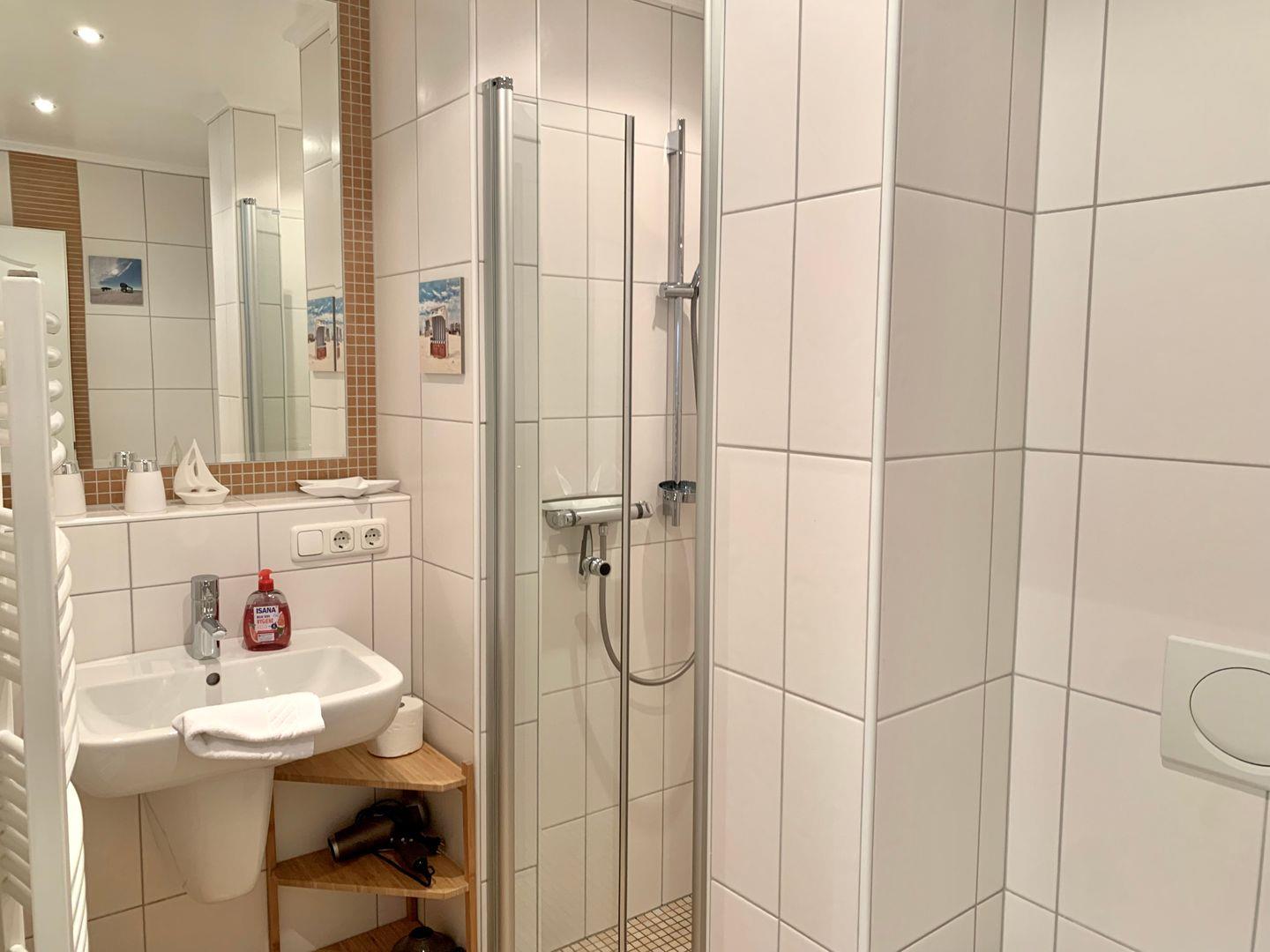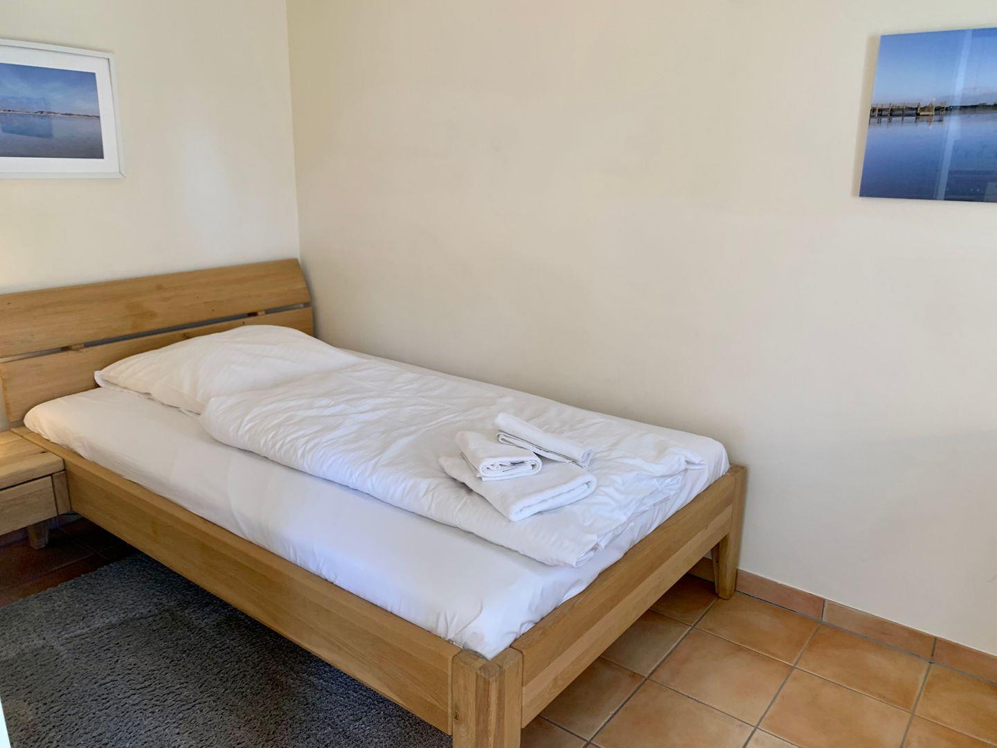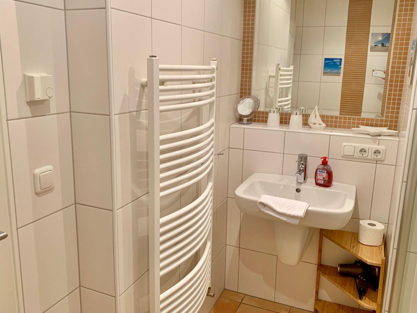 Zur Ferienwohnung gehören 2 Schlafzimmer. Eines ist ausgestattet mit großen 180x200cm Doppelbett, ein weiteres mit einem geräumigen 120x200cm Einzelbett. Ebenfalls gehört ein Badezimmer mit ebenerdiger Dusche und WC zur Ausstattung der Ferienwohnung, ein Handtuchtrockner ist ebenfalls vorhanden.