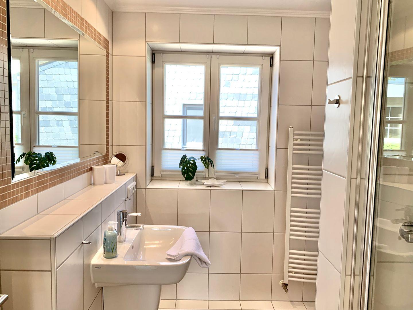 Das Schafzimmer im 1. OG ist ausgestattet mit einem komfortablen 160x190cm Doppelbett. Zur Ferienwohnung gehört ein Badezimmer mit ebenerdiger Dusche und WC, ein Handtuchtrockner ist vorhanden.