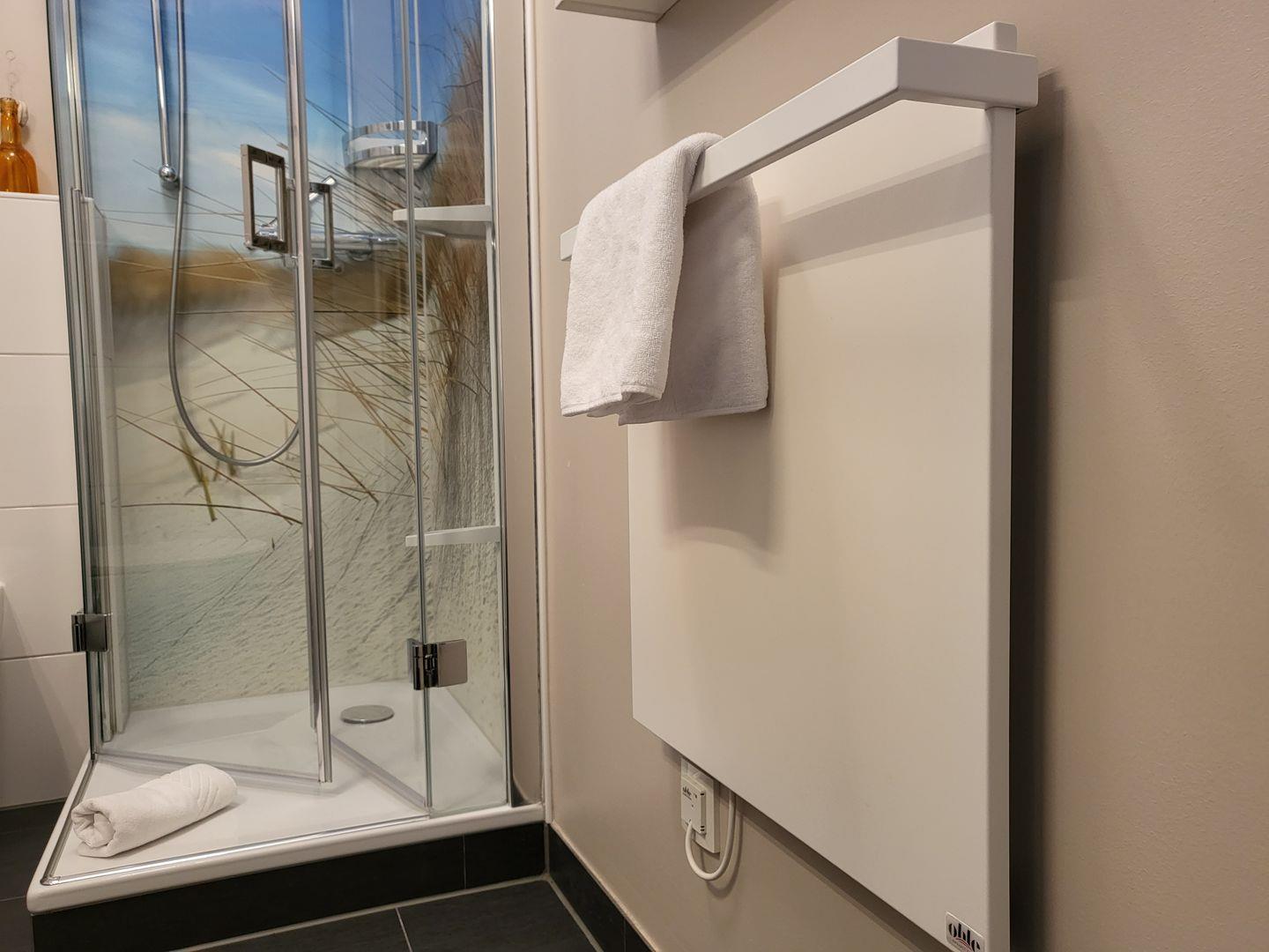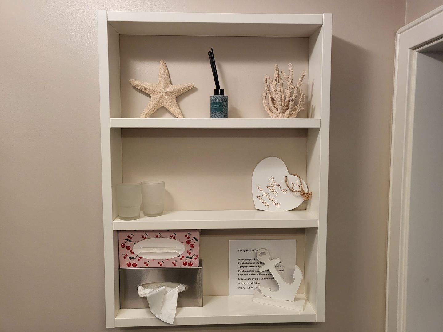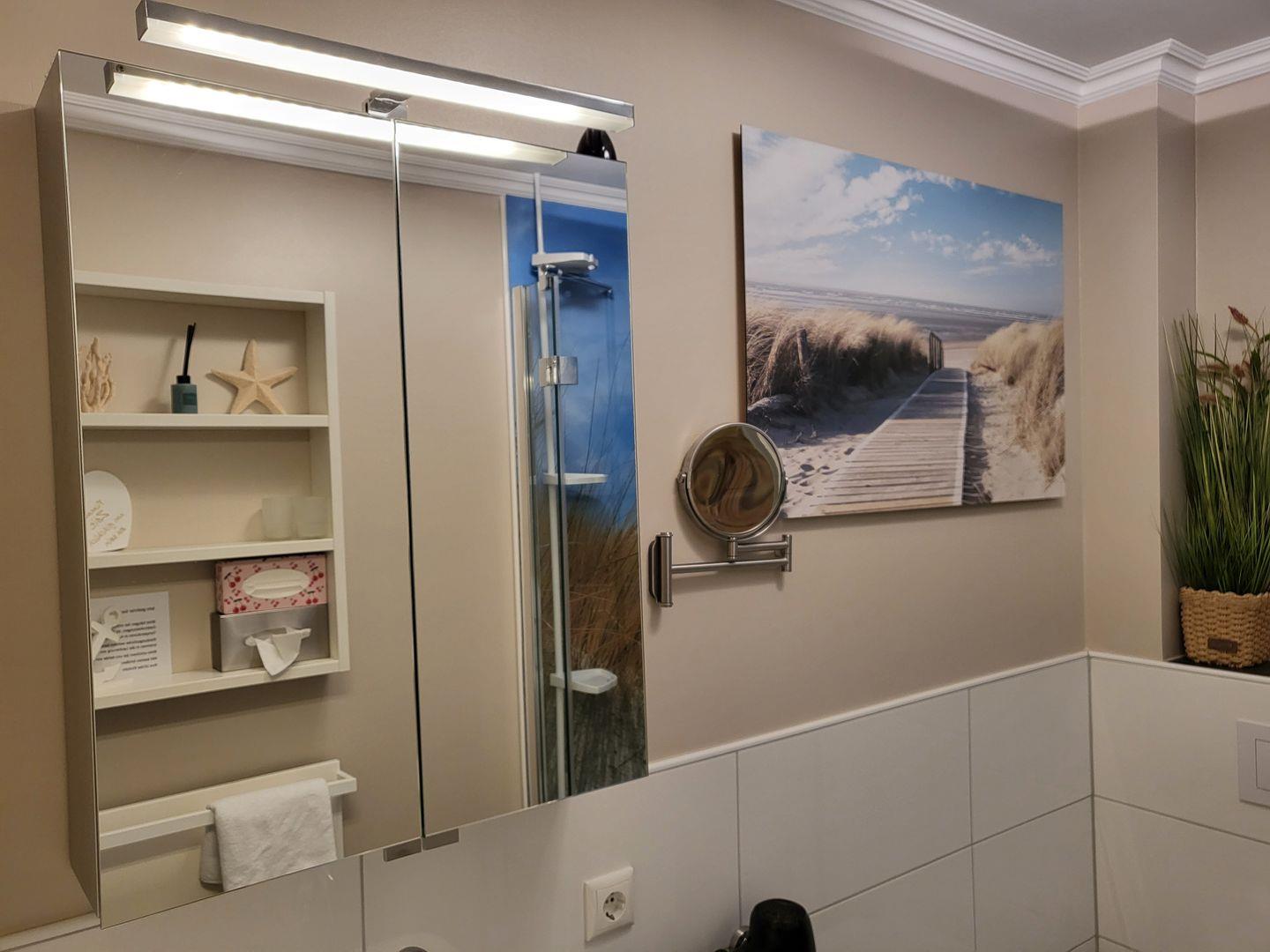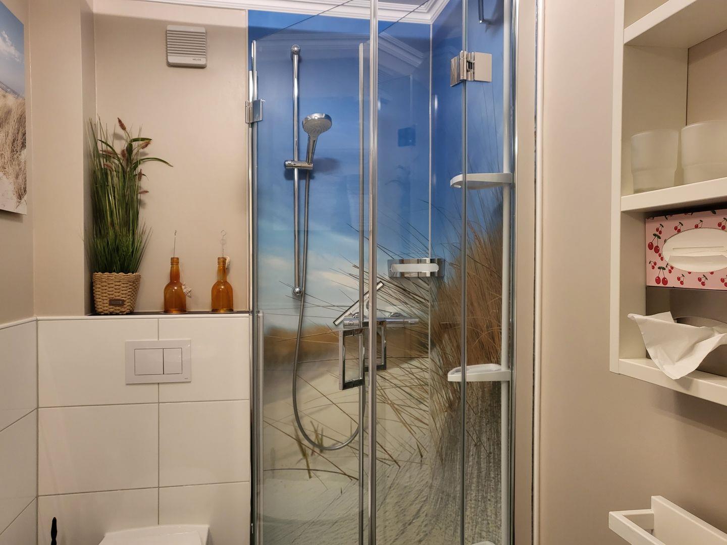 Das separate, maritim eingerichtete Schlafzimmer ist mit 2 Einzelbetten ausgestattet. Zur Ferienwohnung gehört ein modernes Duschbad mit WC.