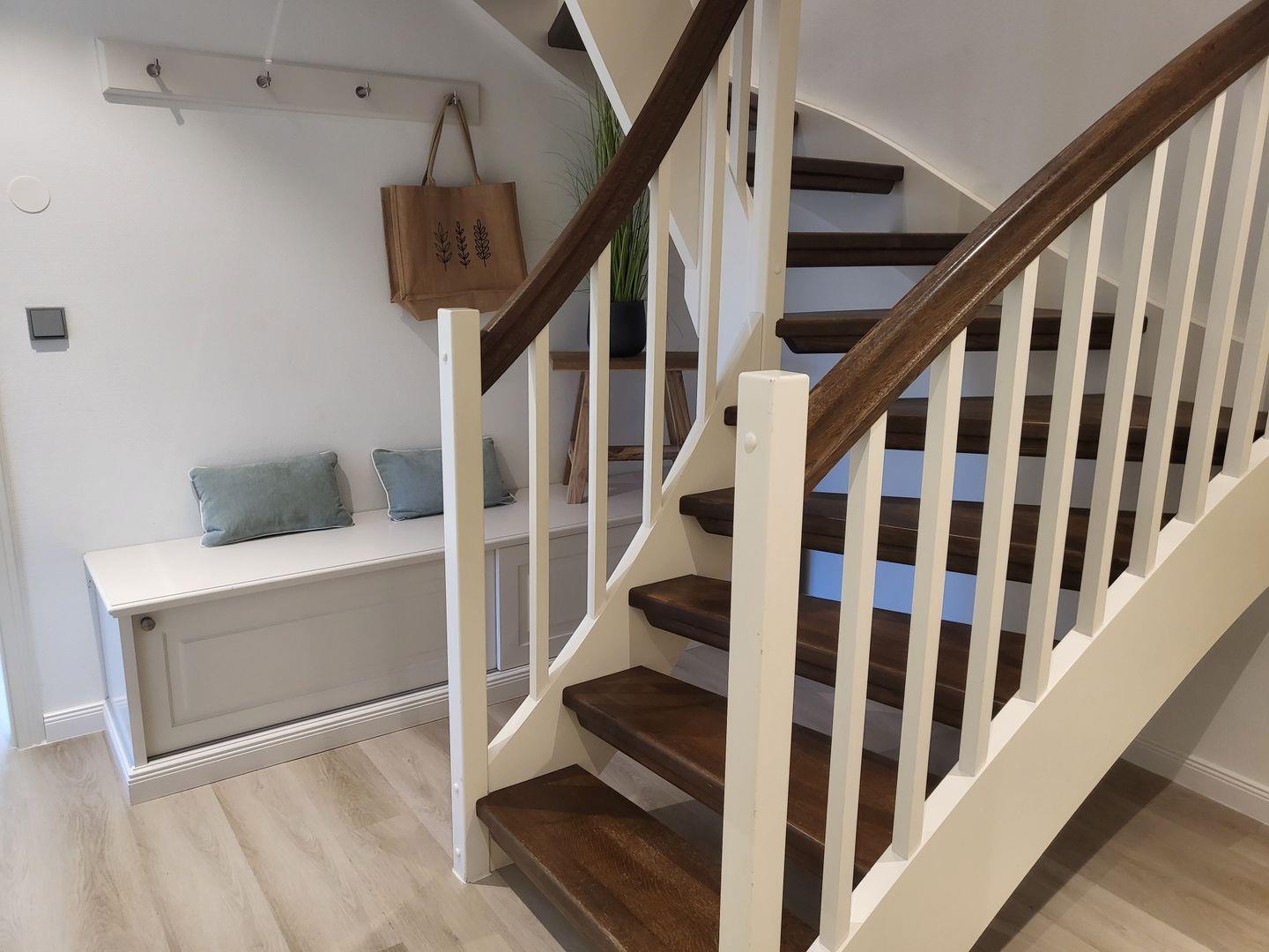 Die sehr moderne 3-Zimmer Ferienwohnung befindet sich im Obergeschoss und bietet auf 63m² Platz für bis zu 4 Personen und Kleinkind.