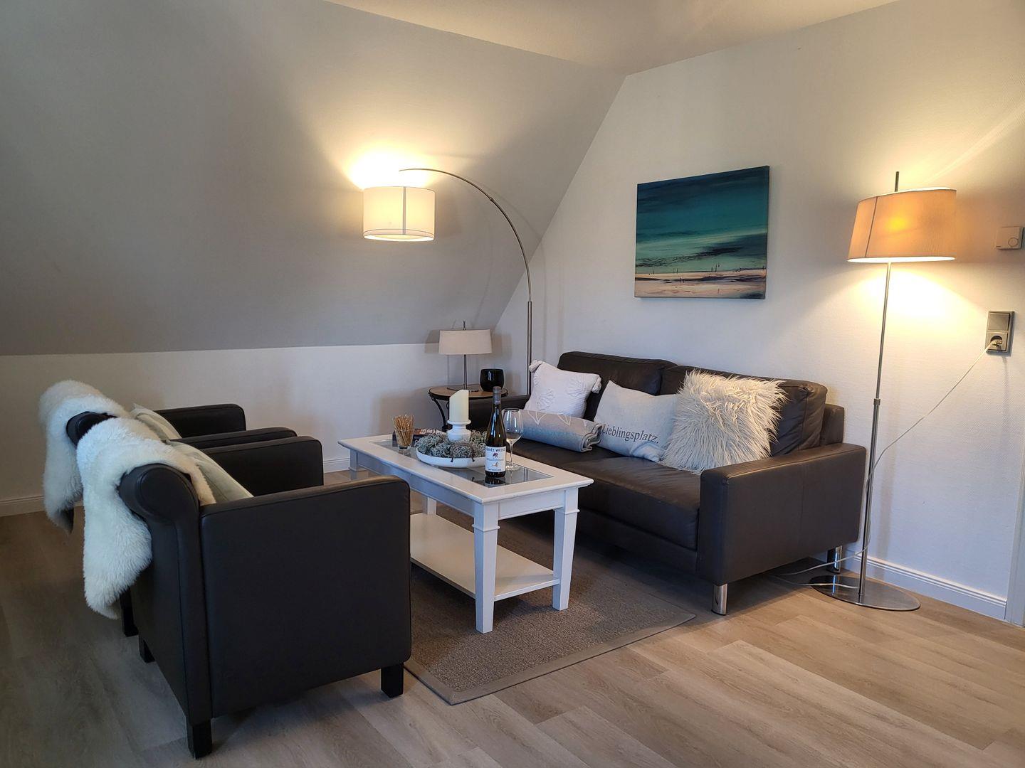 Zur Ausstattung gehört hier eine sehr komfortable Sitzgarnitur, bestehend aus einer Sofagarnitur aus Leder und zwei Ledersesseln.