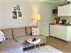 Der Wohnraum ist modern und hell gestaltet, er ist ausgestattet mit gemütlicher 120x200cm Schlafcouch, einer kleinen Essecke sowie einem Flachbild-TV. Kostenfreies W-LAN ist vorhanden. Die anliegende Küchenzeile ist gut ausgestattet und verfügt über ein kompaktes Cerankochfeld, Mikrowellenbackofen, Kühlschrank und Kaffeemaschine.