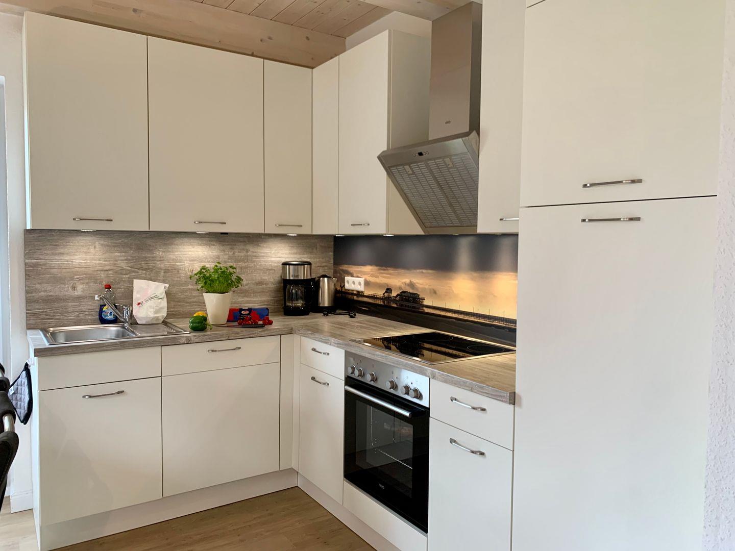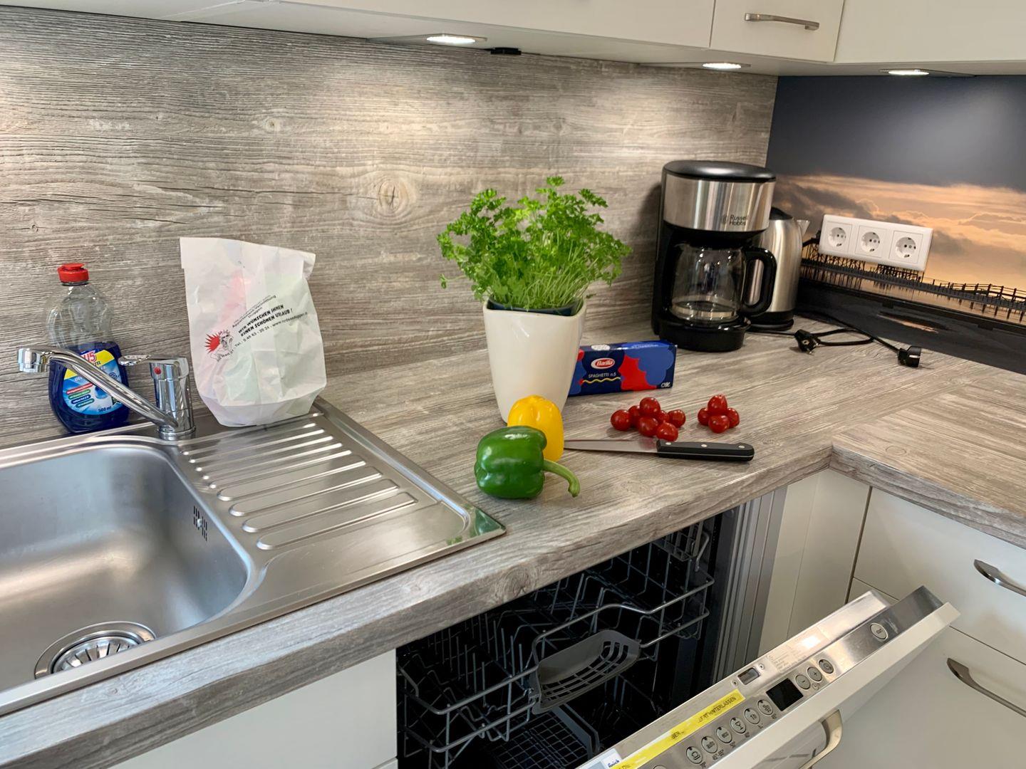 In den Raum integriert liegt die hochwertige Küche, zu deren Ausstattung unter anderem Cerankochfeld und Herd, ein Kühlschrank mit Gefrierfach sowie Geschirrspüler und Kaffeemaschine.