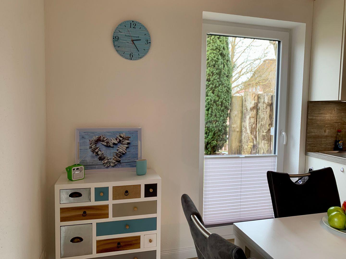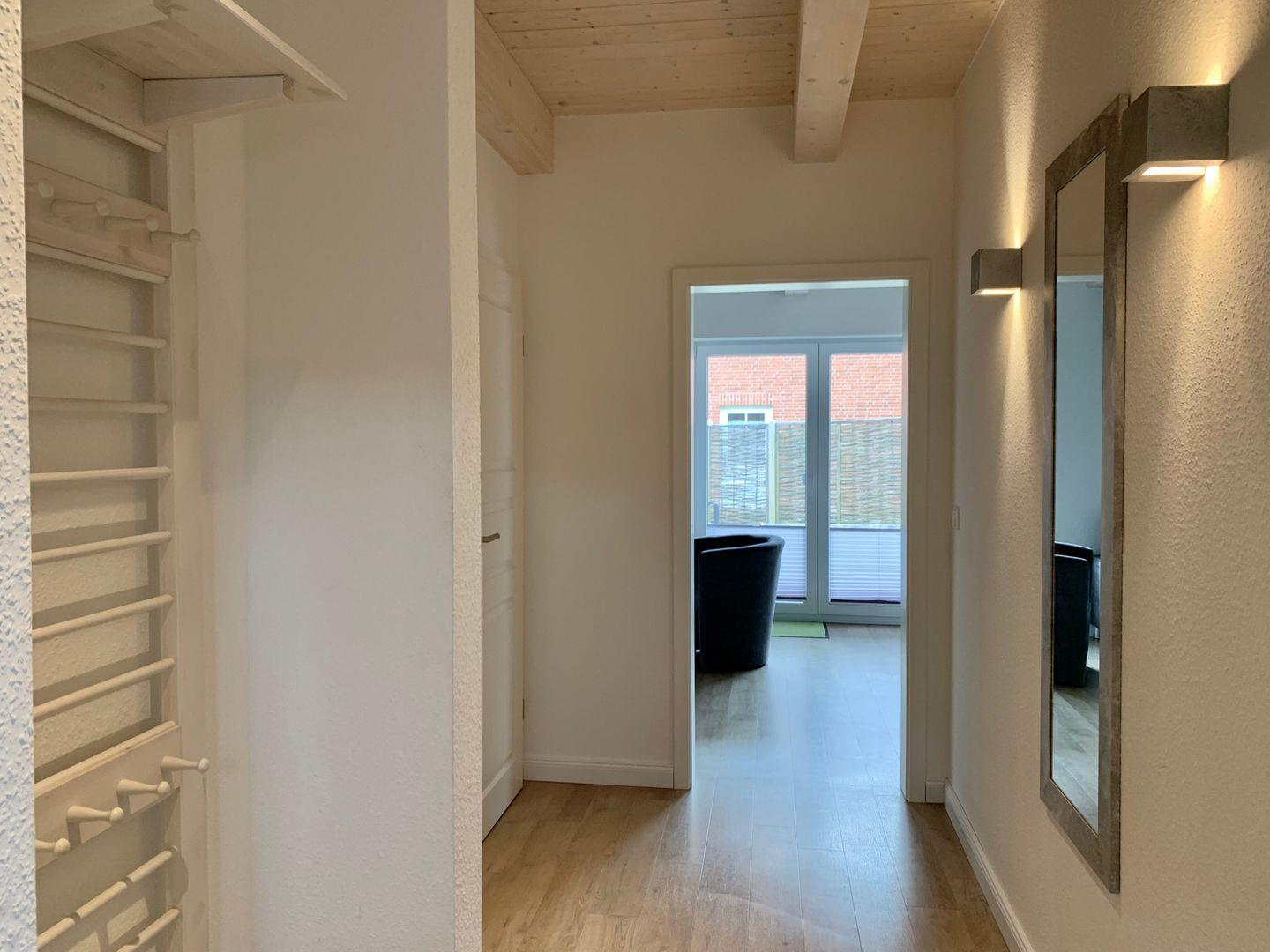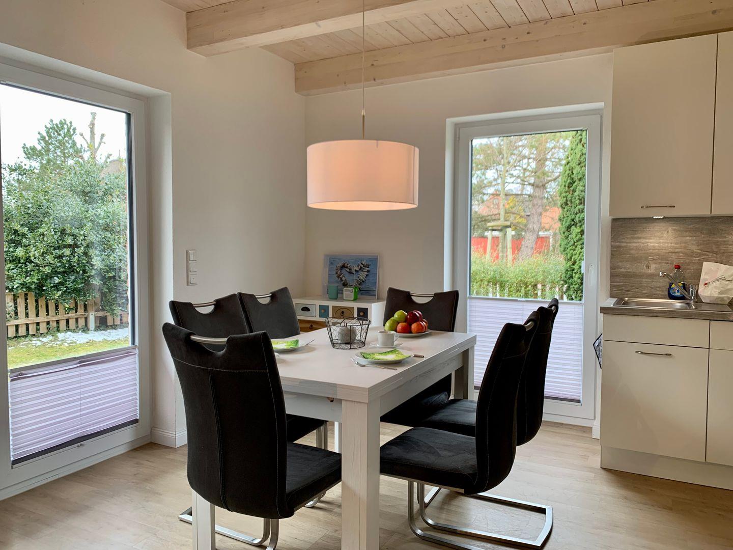Moderne Ferienhaus DHH mit Terrasse und Garten im Dorfzentrum. Kombinierter Wohn- und Essbereich, Gäste-WC mit Dusche,