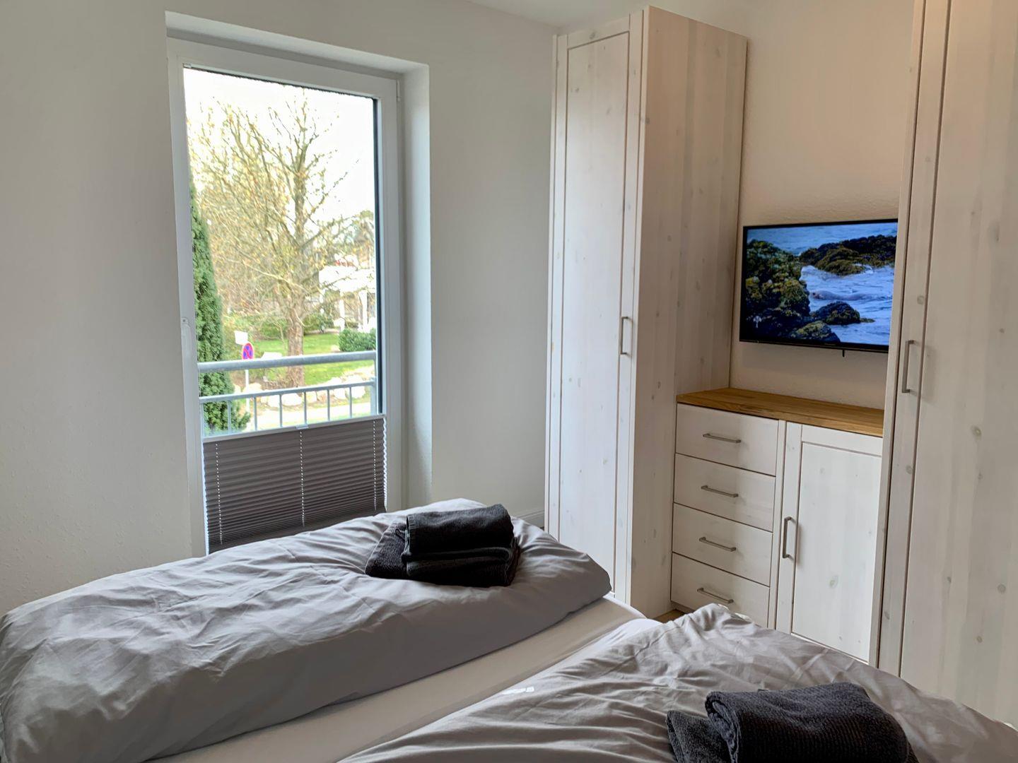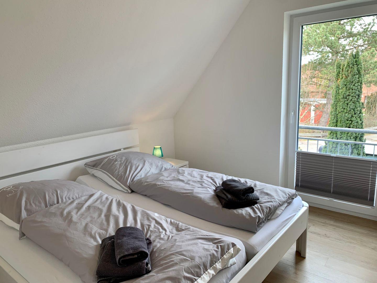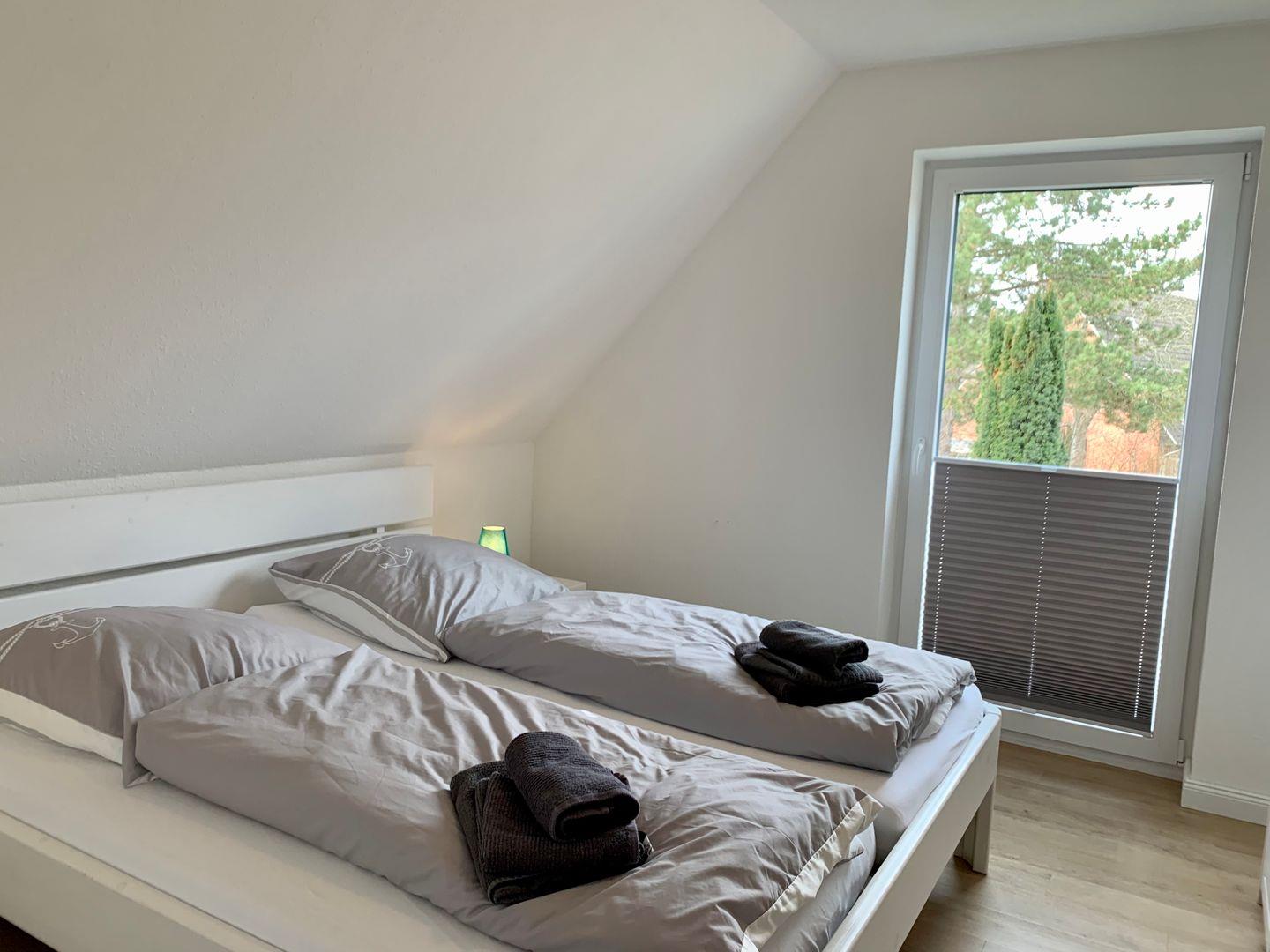 Ein Schlafzimmer mit Doppelbett im EG, im Obergeschoss 2 Schlafzimmer mit Doppelbetten sowie Sitzbereich mit TV und Duschbad mit WC.