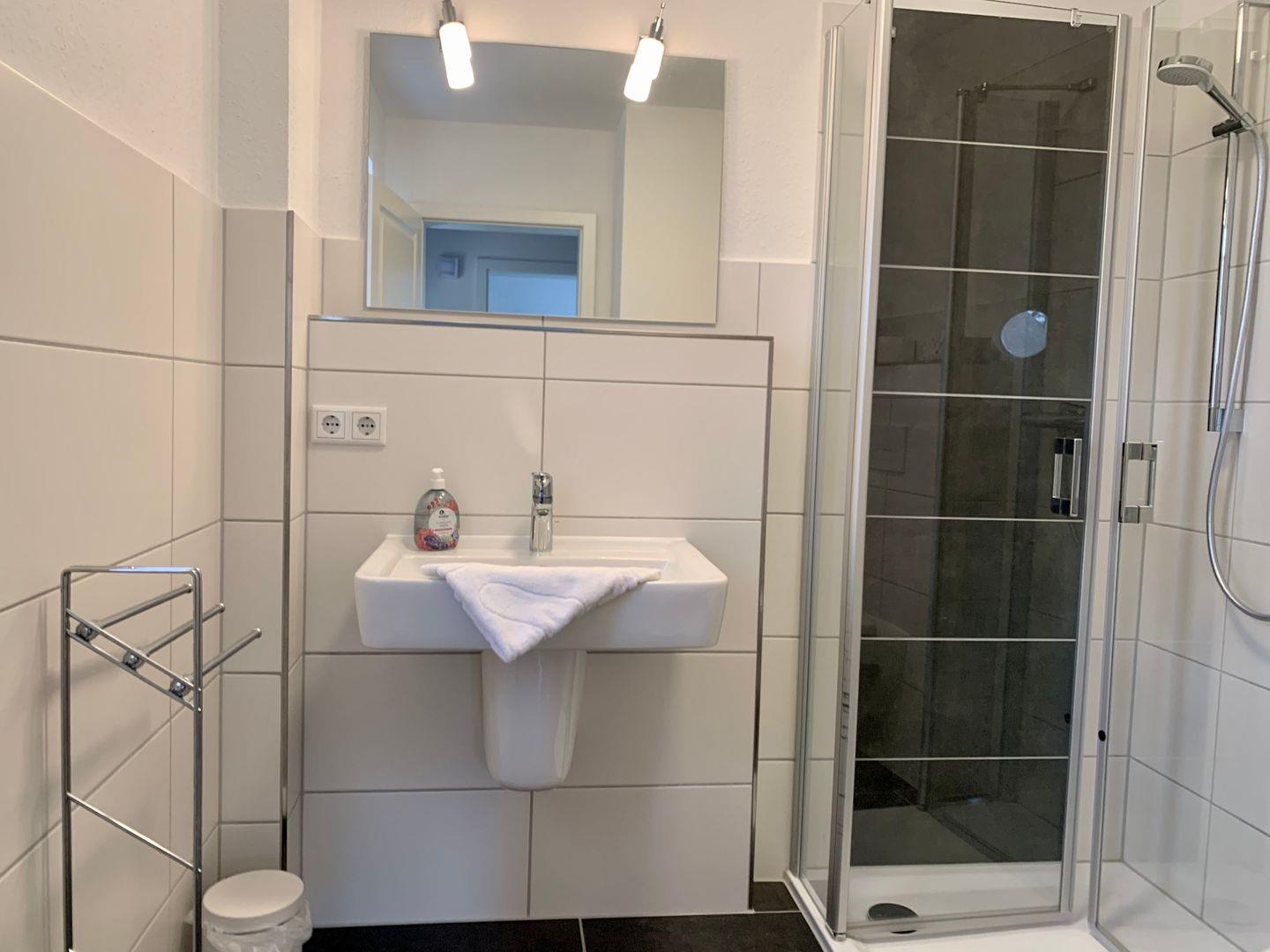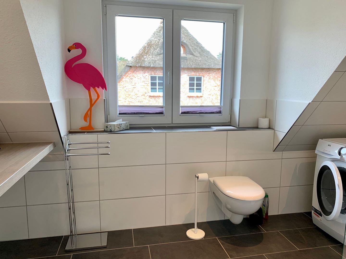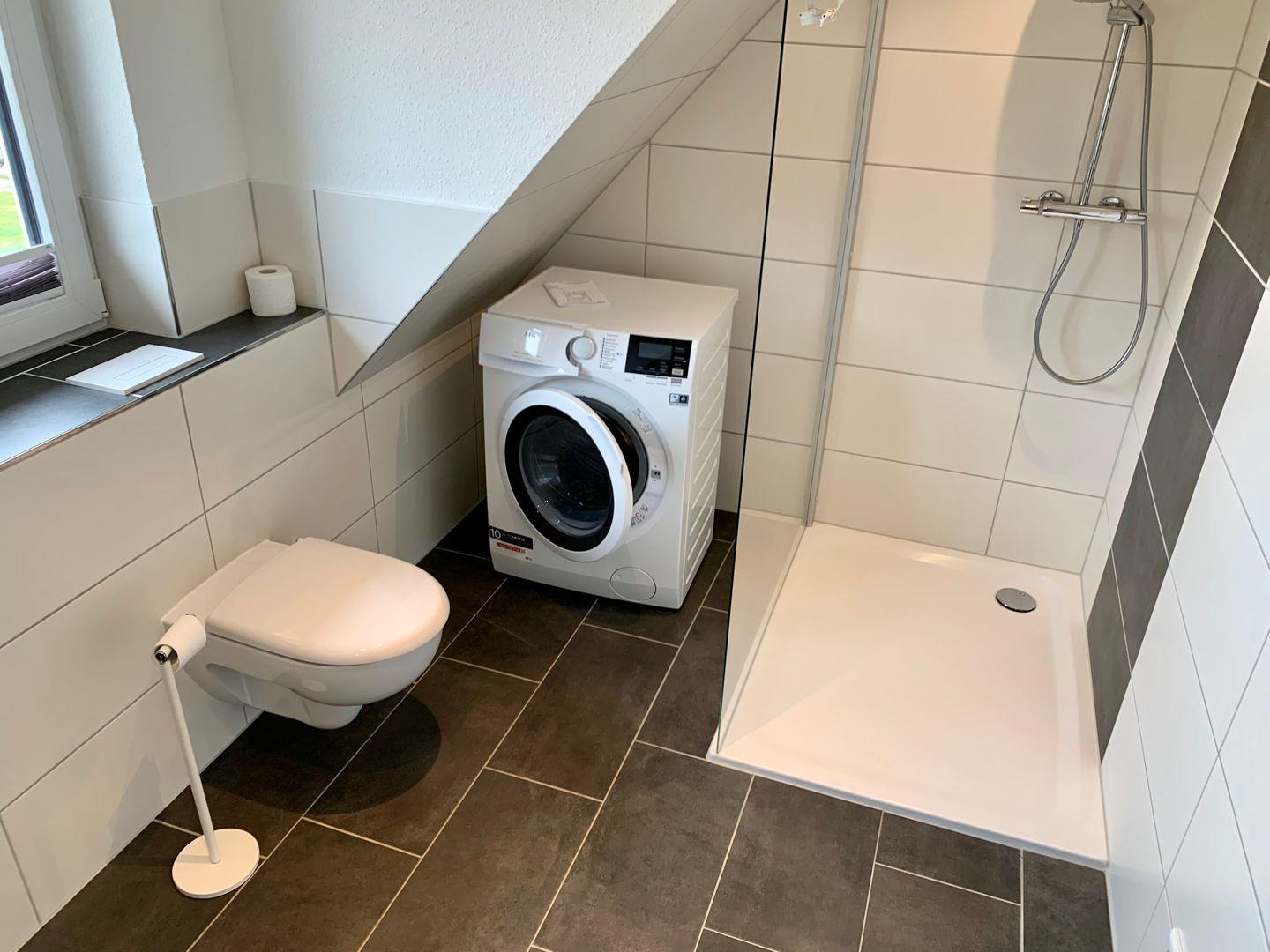Ein Badezimmer mit ebenerdiger Dusche und WC ist ebenfalls auf der Etage. Zur Ausstattung gehören hier unter anderem Waschtrockner und Fön.