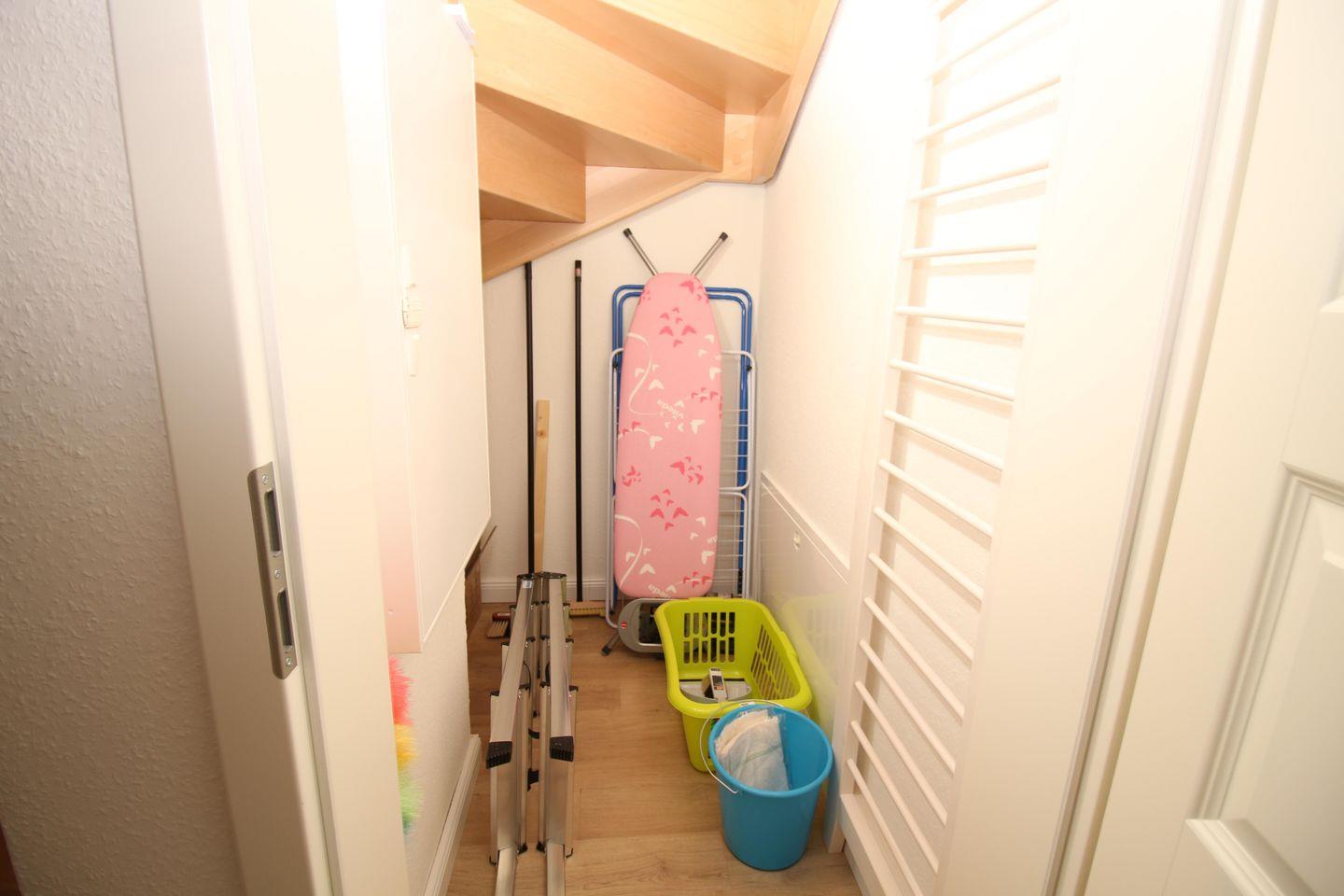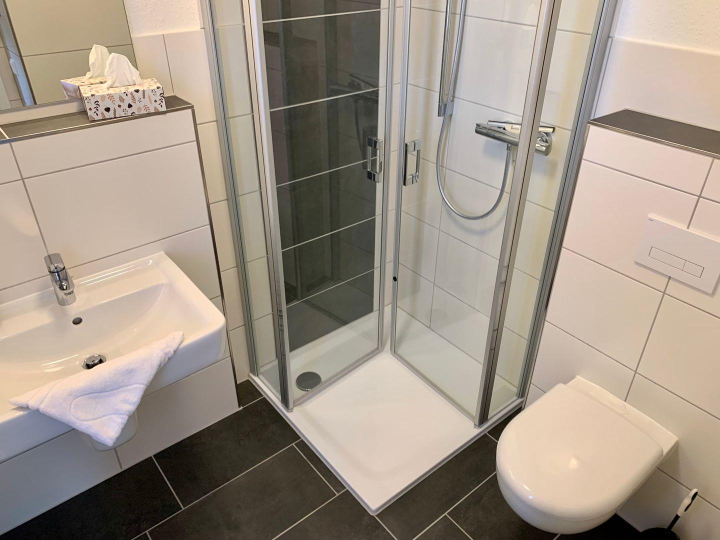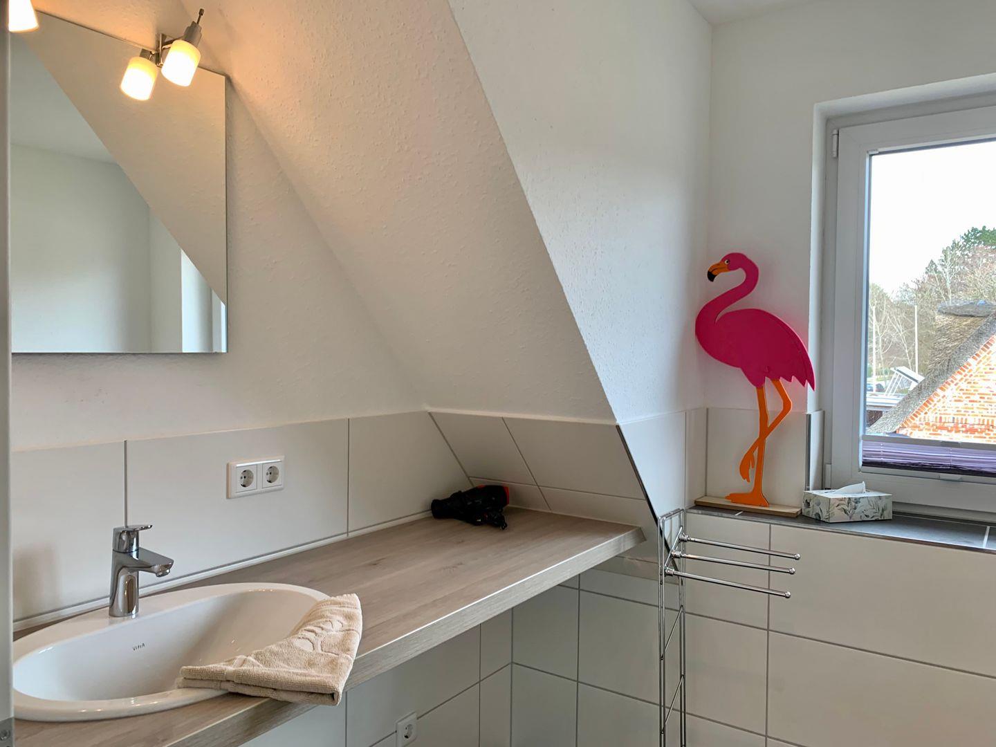 Ein Badezimmer mit ebenerdiger Dusche und WC ist ebenfalls auf der Etage. Zur Ausstattung gehören hier unter anderem Waschtrockner und Fön.
