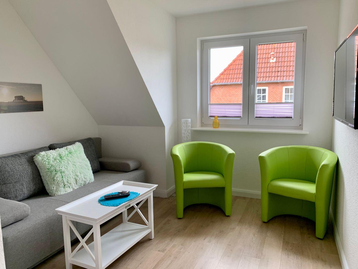 Auf der Diele stehen eine gemütliche Couch und zwei Sessel zur Verfügung.