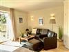 Durch den Übergang zur Terrasse wirkt das modern und einladend eingerichtete Wohnzimmer wunderbar hell. Hier gehört eine edle Sitzgruppe, bestehend aus edler Ledercouch und einem gemütlichen Ledersessel, zur Ausstattung.