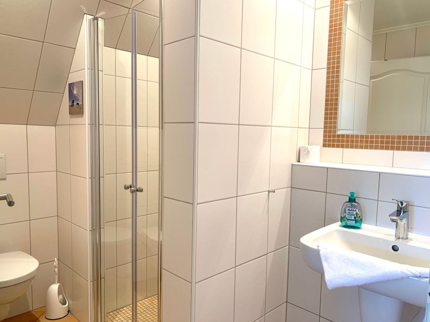 Zum Obergeschoss gehört ebenfalls ein Badezimmer mit ebenerdiger Dusche und WC, ein Handtuchtrockner ist vorhanden.