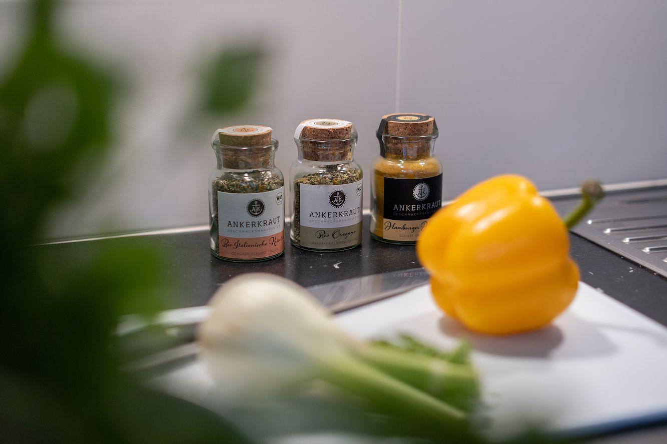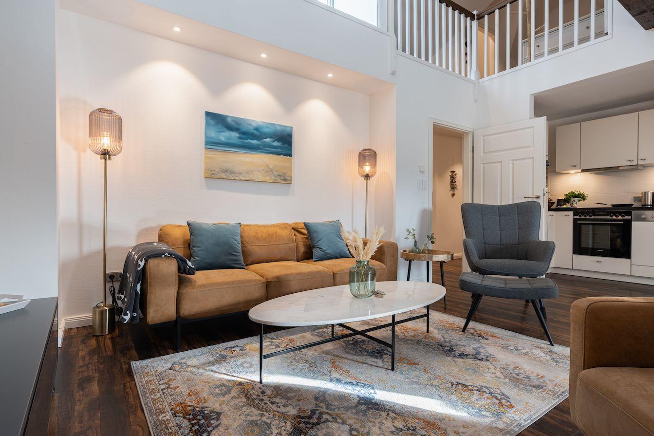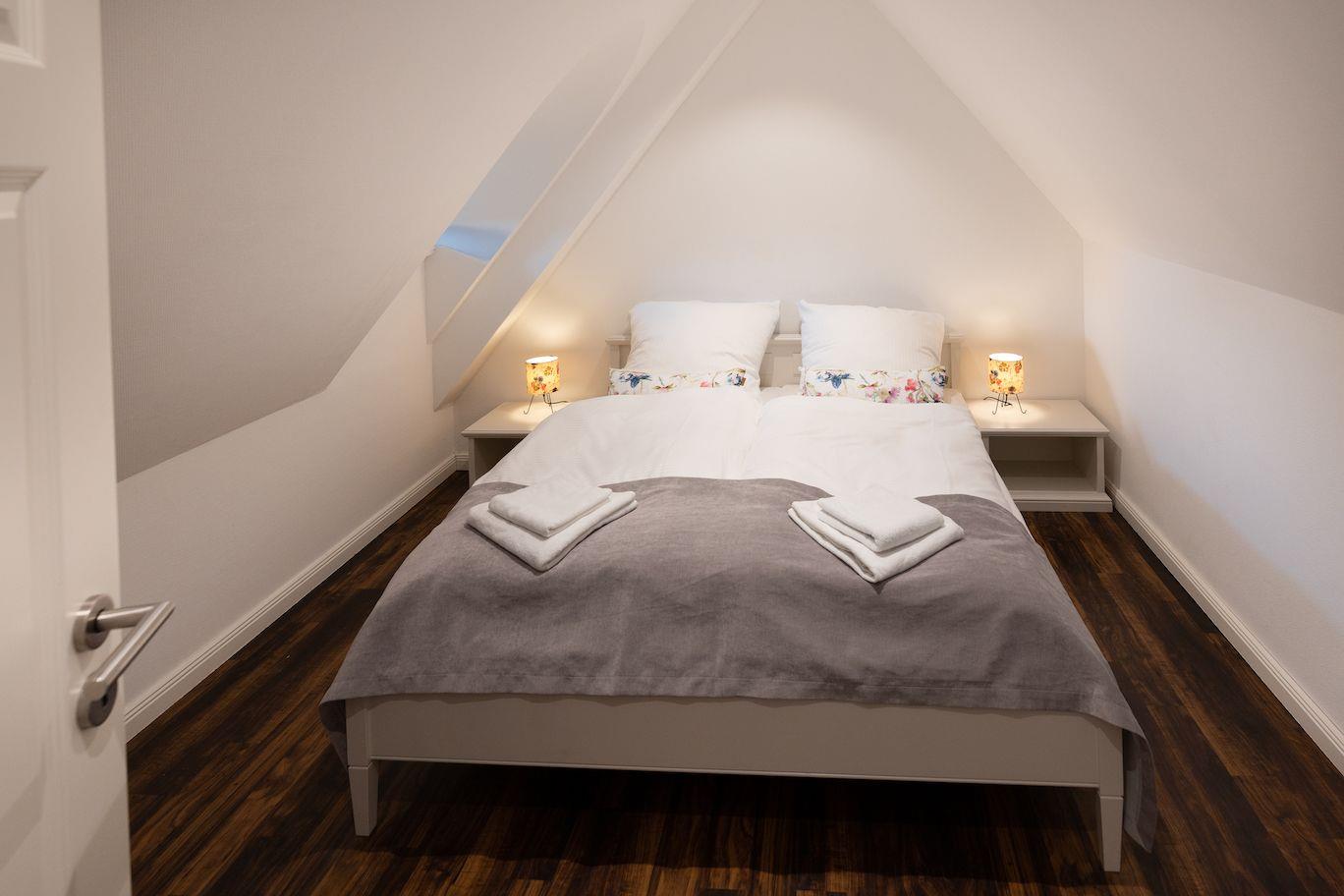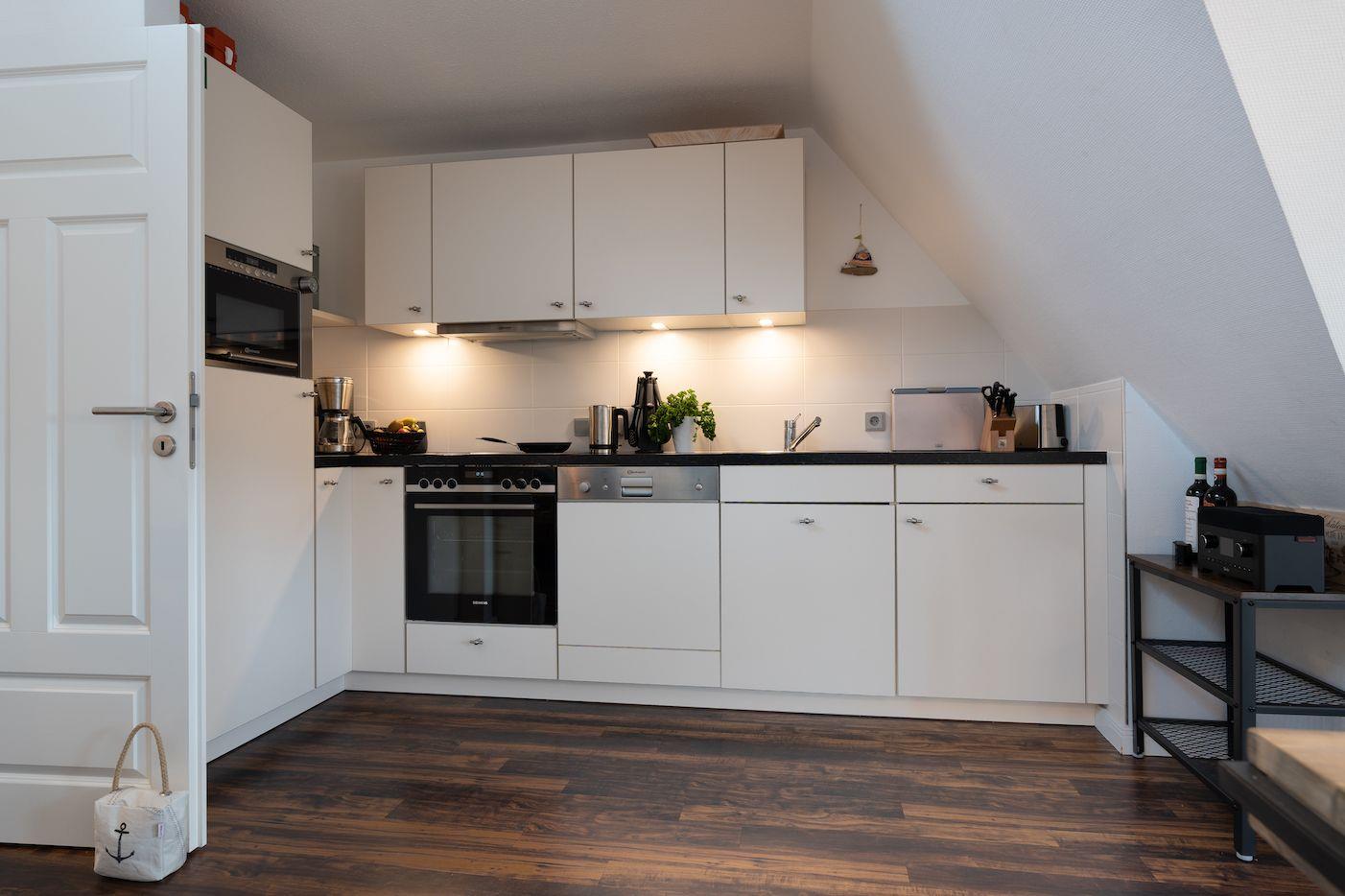 In den Raum integriert liegt die sehr gut ausgestattete Küche, dort gehören unter anderem ein hochwertiges Induktionskochfeld und Herd, ein Kühlschrank mit Gefrierfach, ein Geschirrspüler sowie Mikrowelle und zwei Kaffeemaschinen zur Ausstattung – eine für klassischen Filterkaffee sowie eine Nespressomaschine. Zur edlen Ferienwohnung gehören zwei großzügige Schlafzimmer mit Doppelbetten. Ein 180x200cm Doppelbett befindet sich im Oberschoss und verfügt über einen Safe für Wertsachen. Ein 160x200cm Doppelbett befindet sich im Dachgeschoss auf zum Wohnzimmer hin offener Galerie. Dort ist ein auch gemütlicher Homeofficebereich eingerichtet. Beide Schlafzimmer verfügen zudem über moderne 32" LCD FullHD Fernseher. Ein geräumiges, gut ausgestattetes Duschbad mit bodengleicher Dusche und WC ist ebenfalls vorhanden.