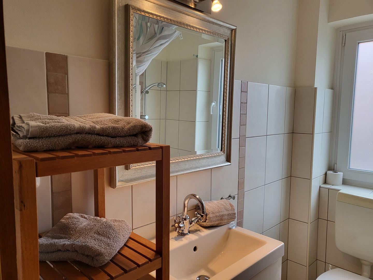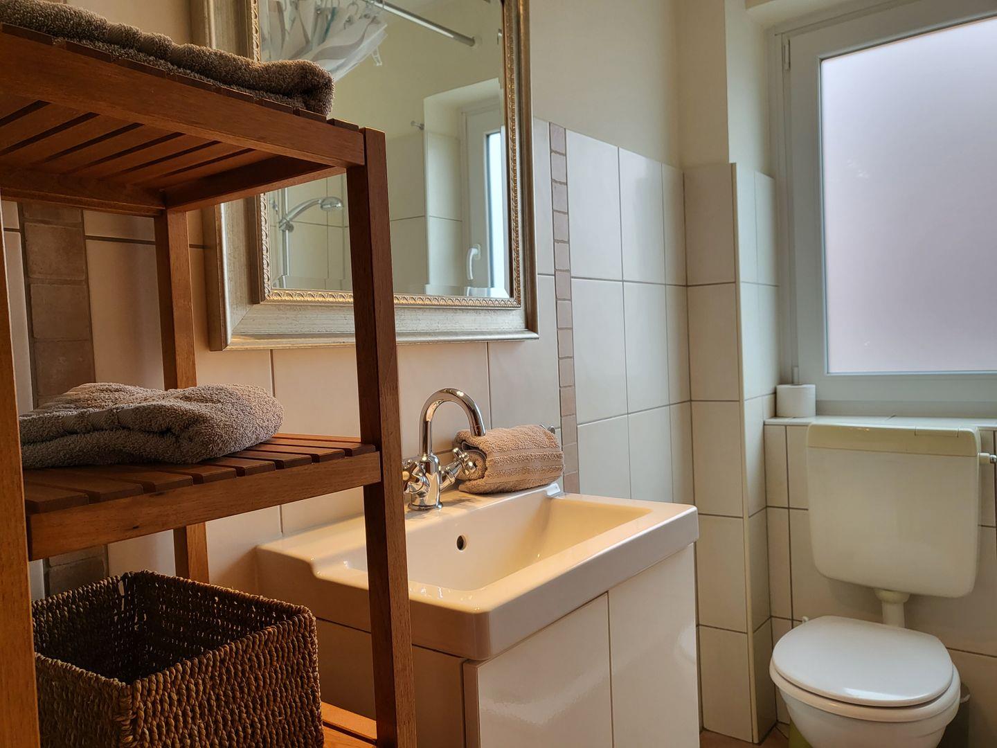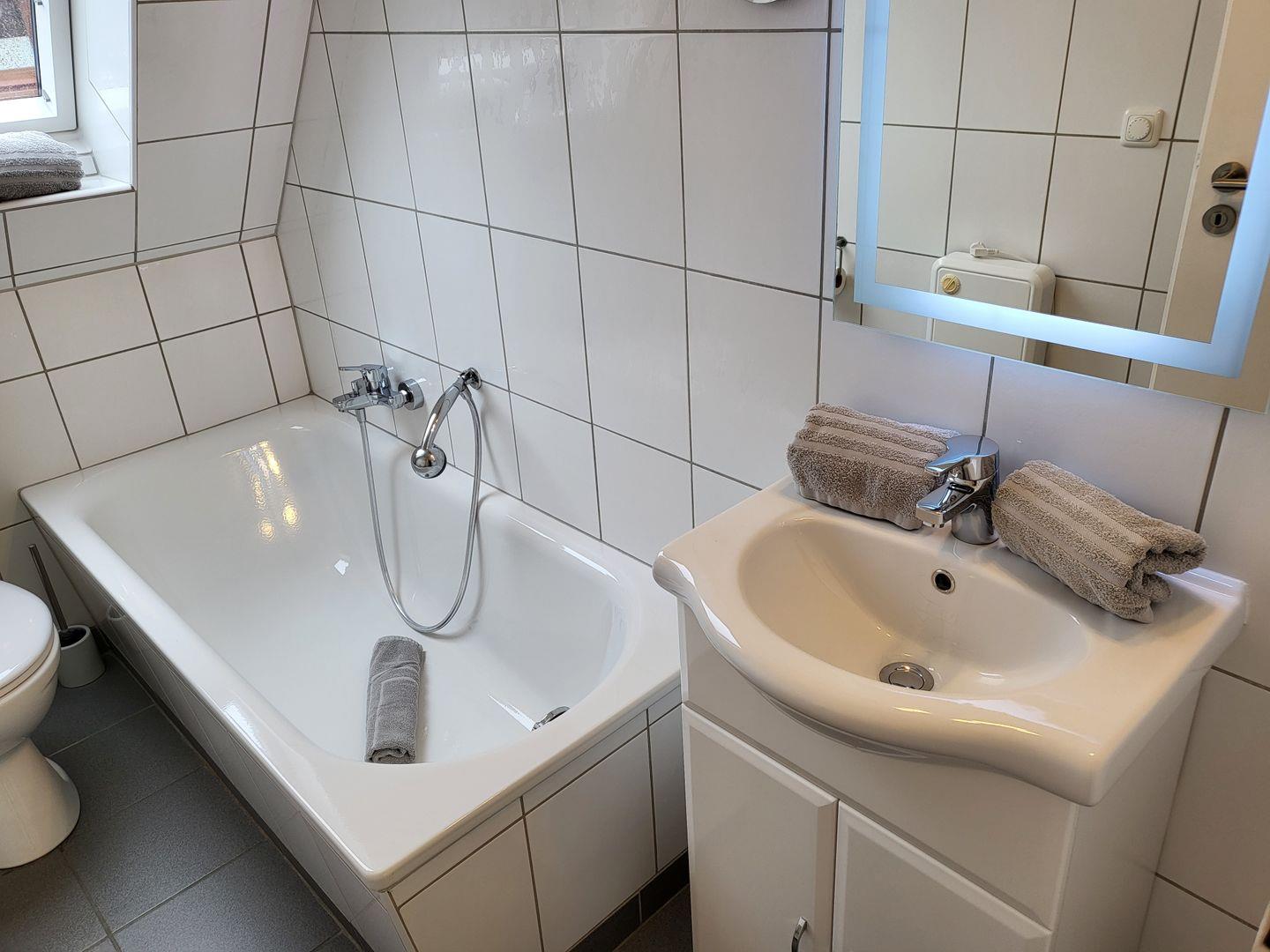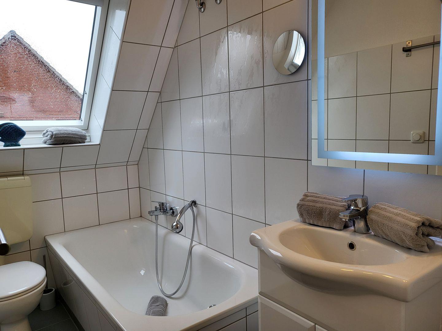 Ein Wannenbad mit WC is auf der Etage.