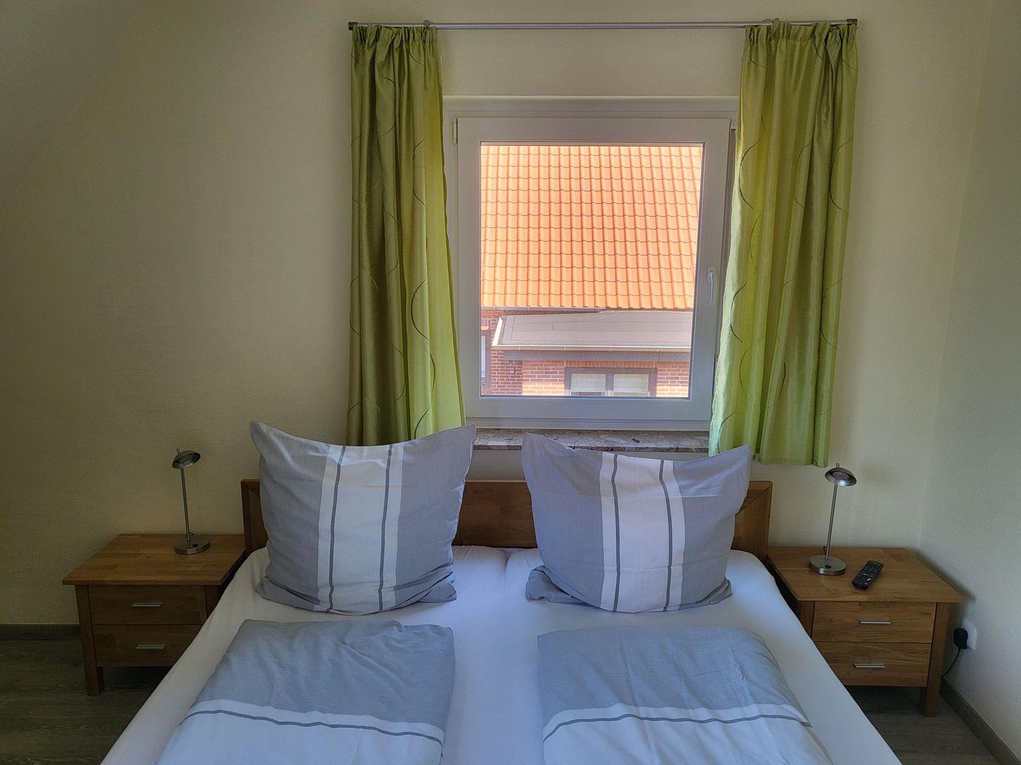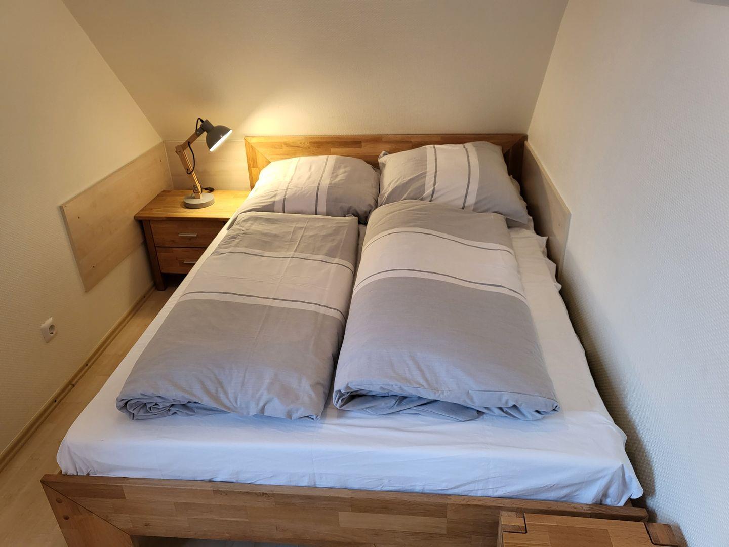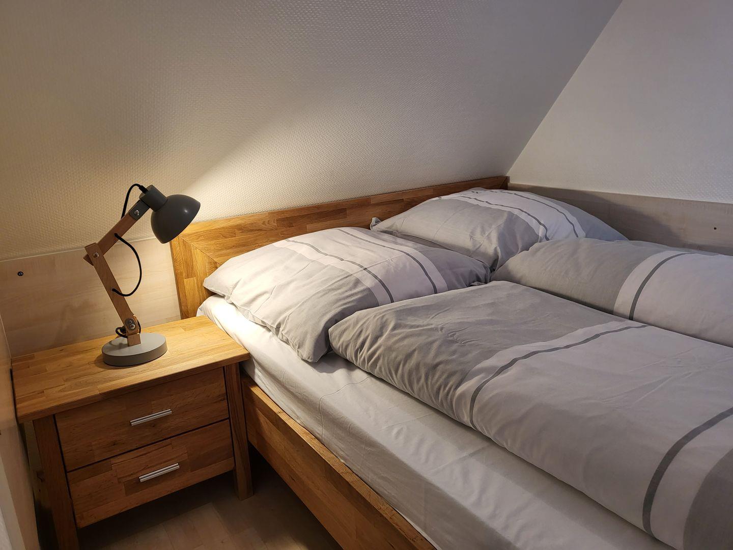 Das Obergeschoss ist ausgestattet mit zwei weiteren Schlafzimmern. Eines verfügt über ein 140x200cm Doppelbett, ein weiteres ist mit einem 160x200cm Doppelbett ausgestattet.