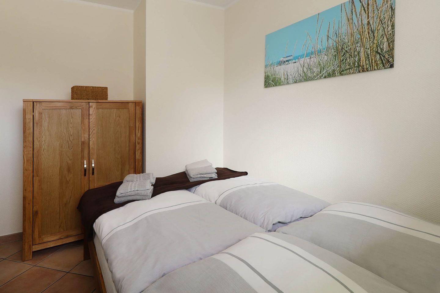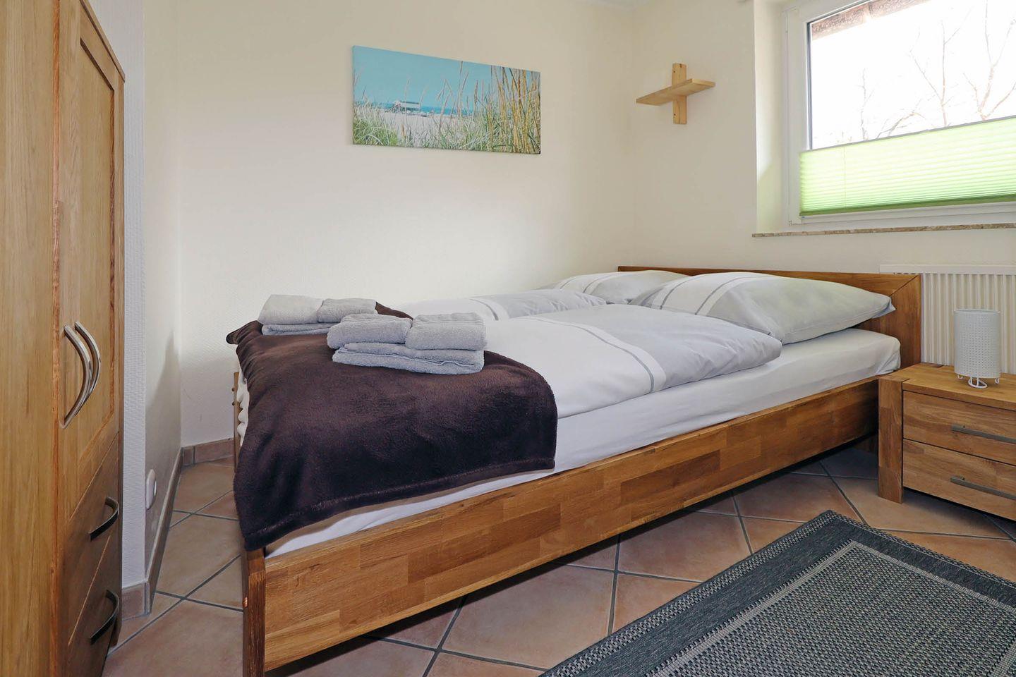 Ebenfalls im Erdgeschoss untergebracht ist ein Schlafzimmer mit komfortablem 140x200cm Doppelbett sowie ein Duschbad mit WC.