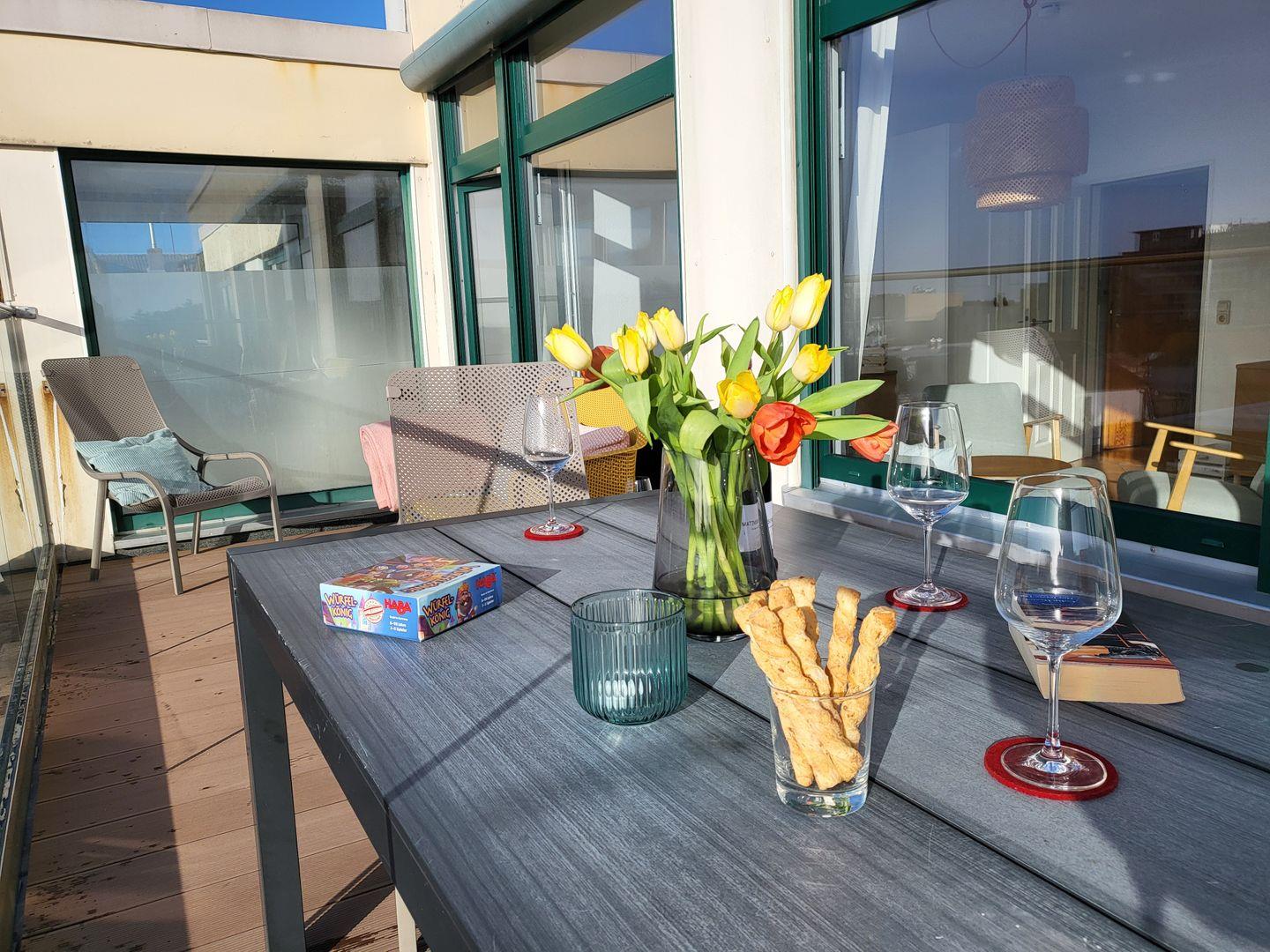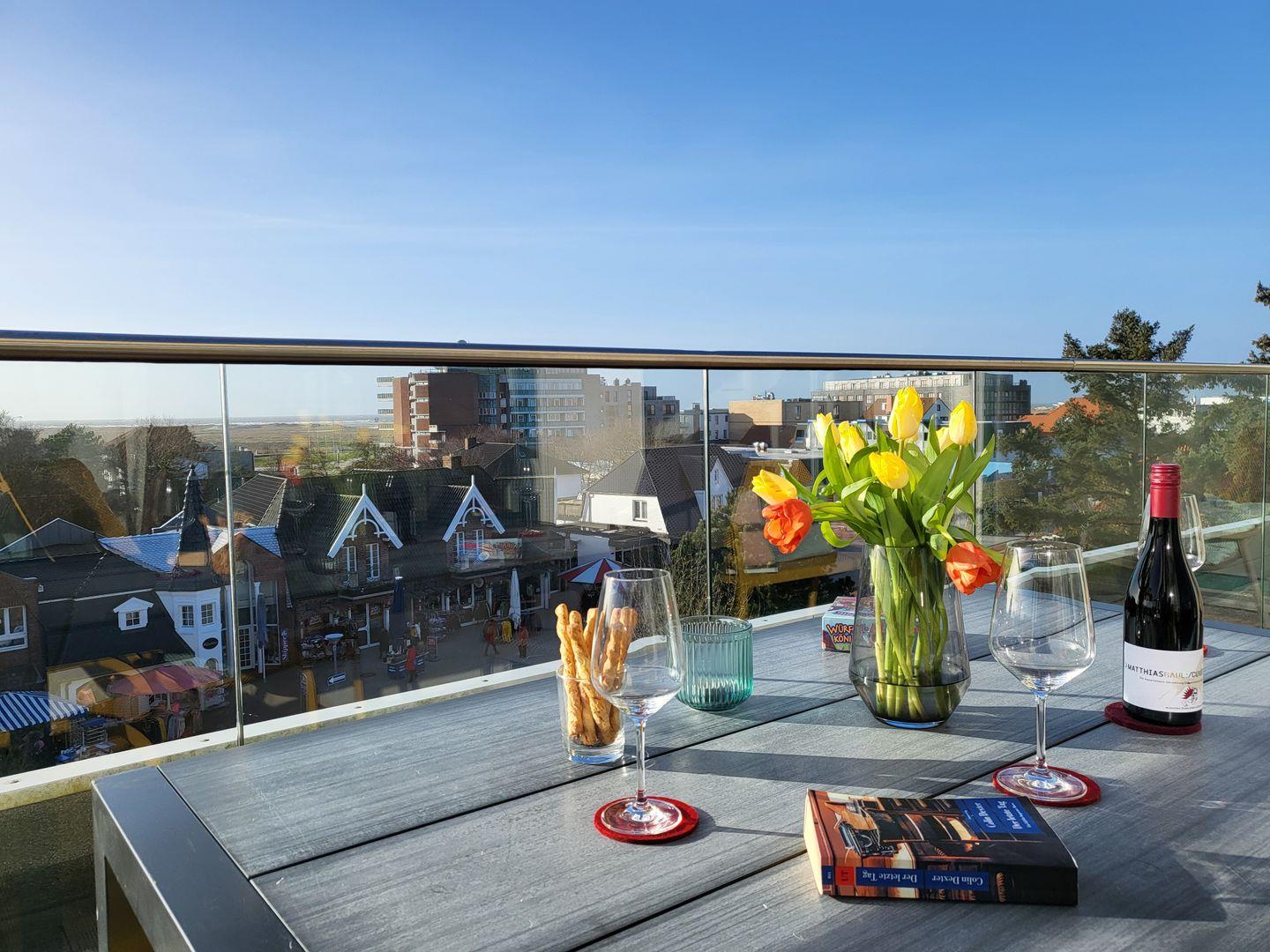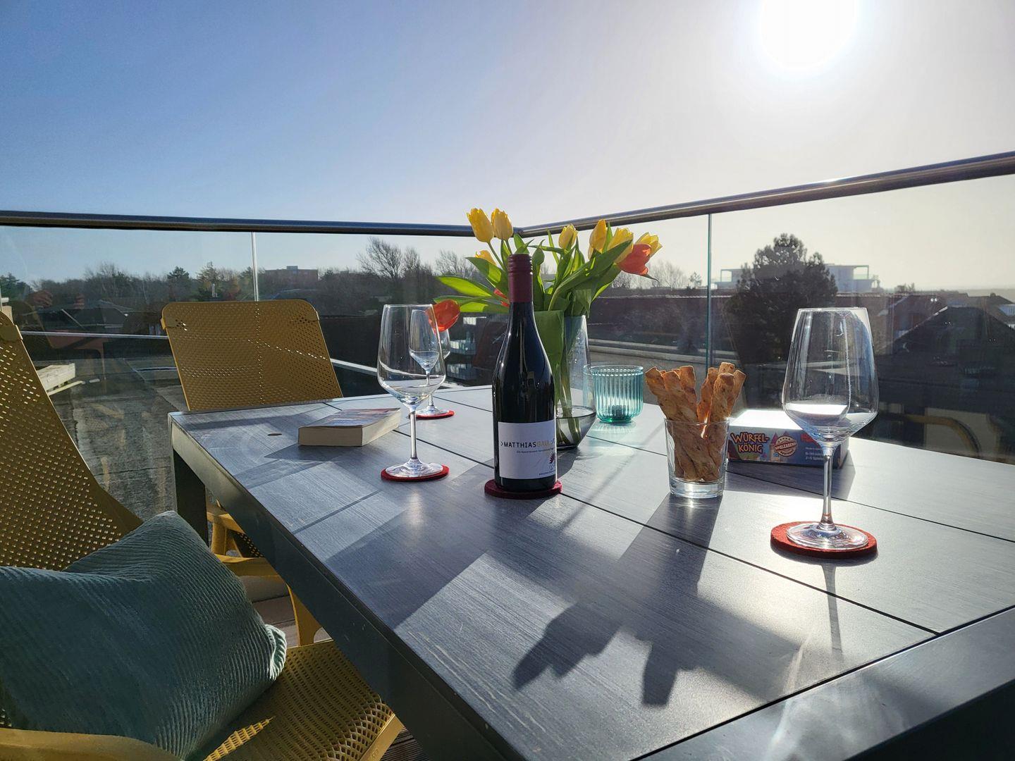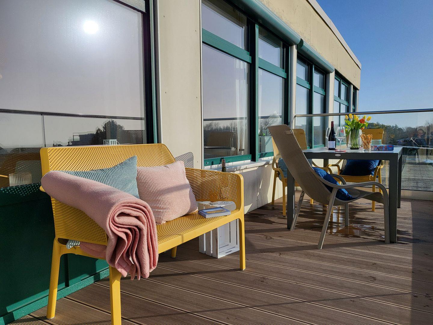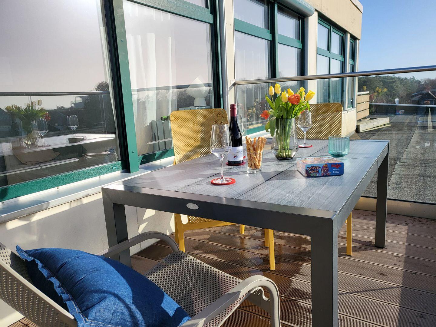 Die im Januar 2024 neu sanierte Dachterrasse lädt mit einem atemberaubenden Ausblick auf die Nordsee zum Entspannen ein. Ein perfektes Plätzchen, um den erholsamen Tag mit Blick auf den Sonnenuntergang ausklingen zu lassen.