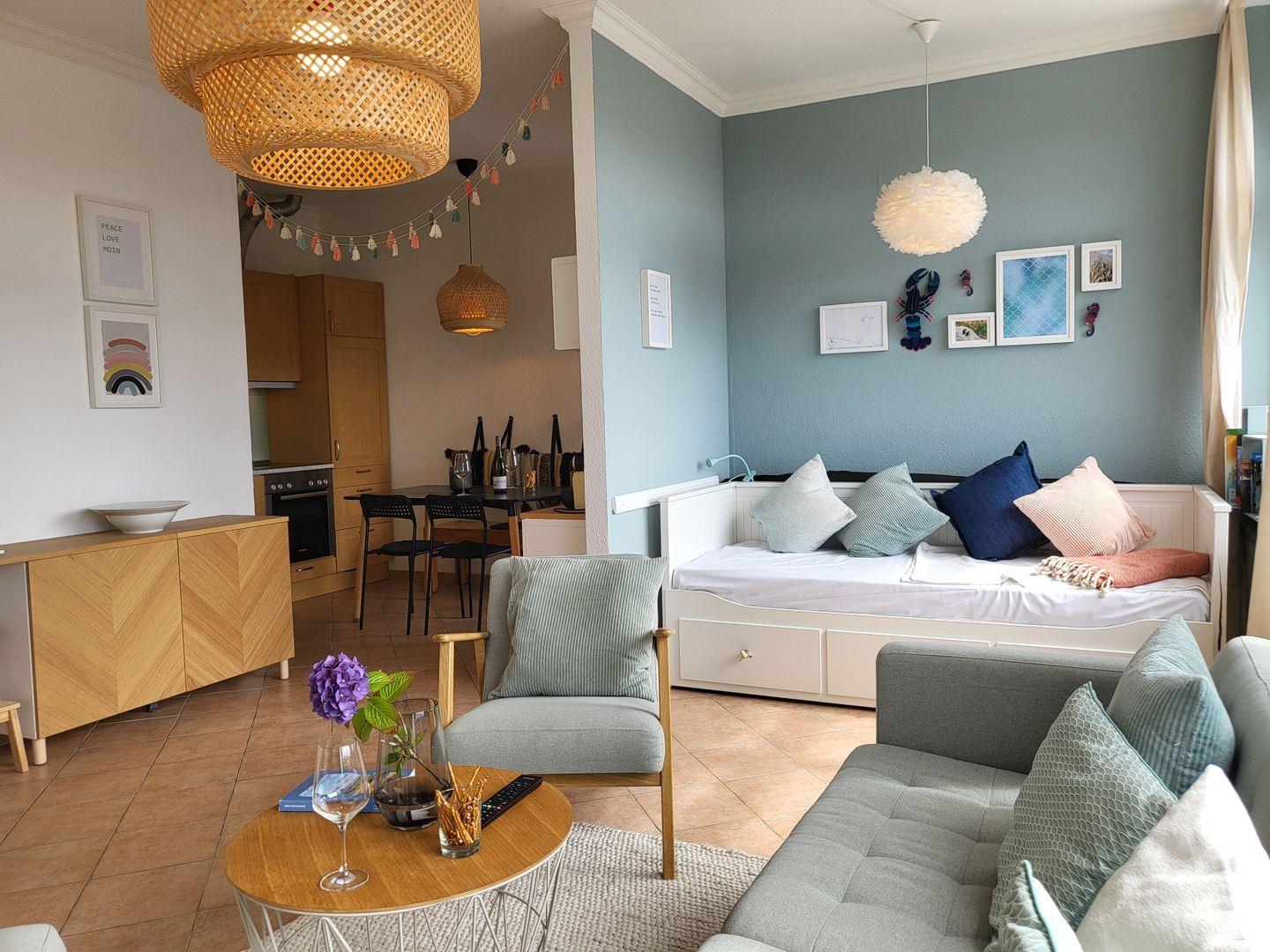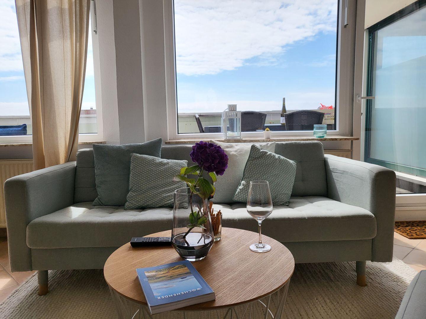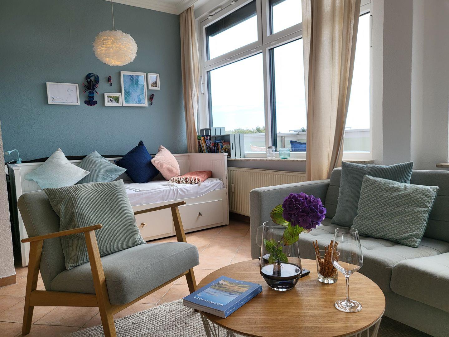 Zentrale 2-Zimmer Penthousewohnung im 3. OG für bis zu 4 Personen. Balkon mit Strandkorb und Seeblick.