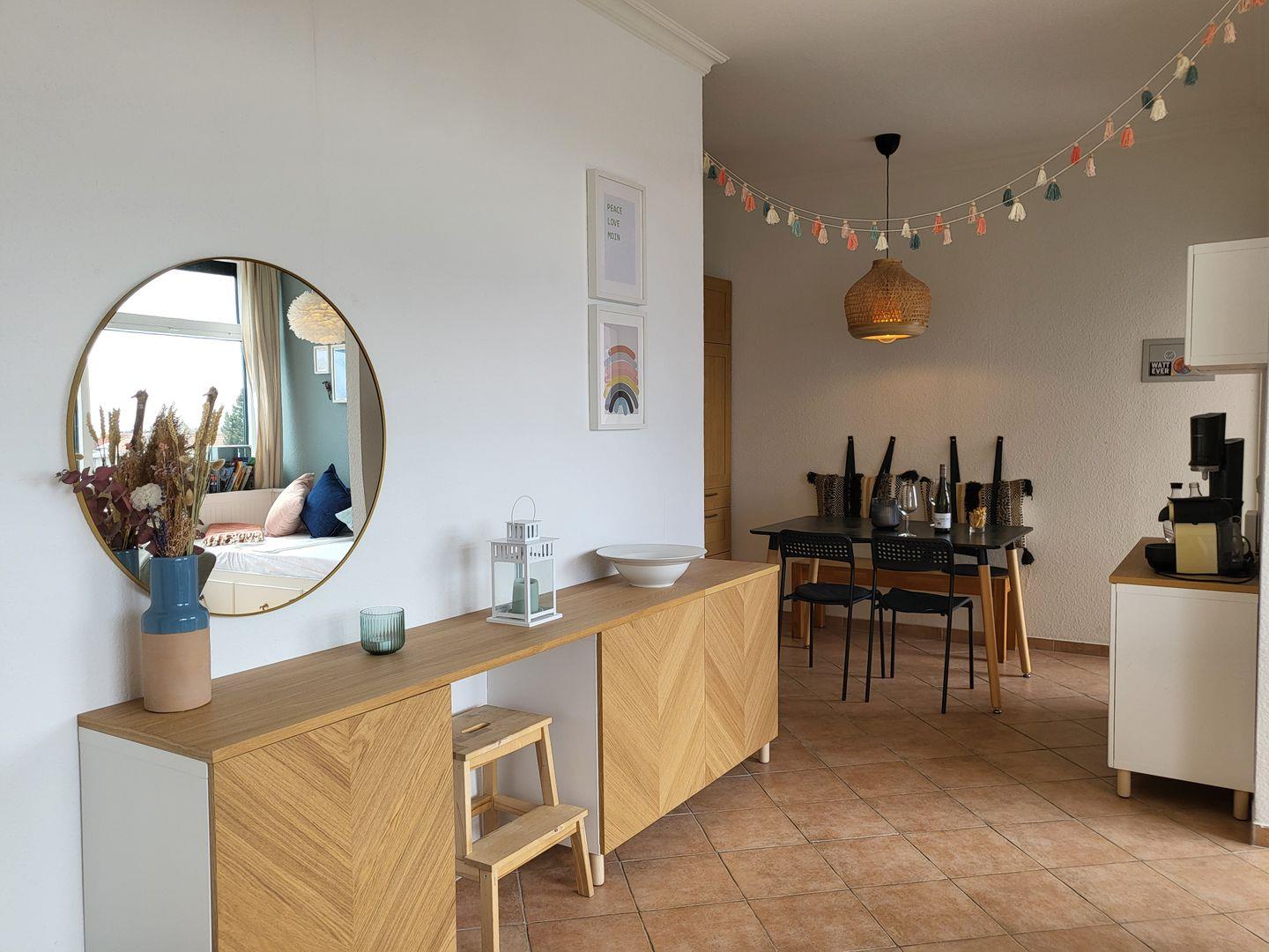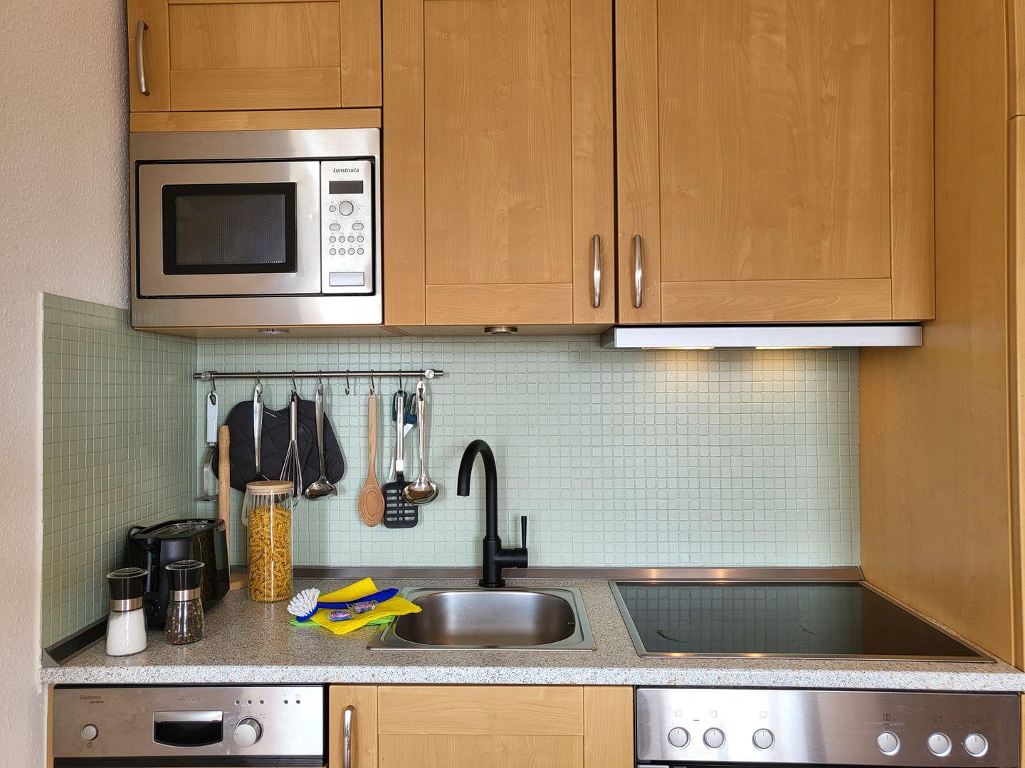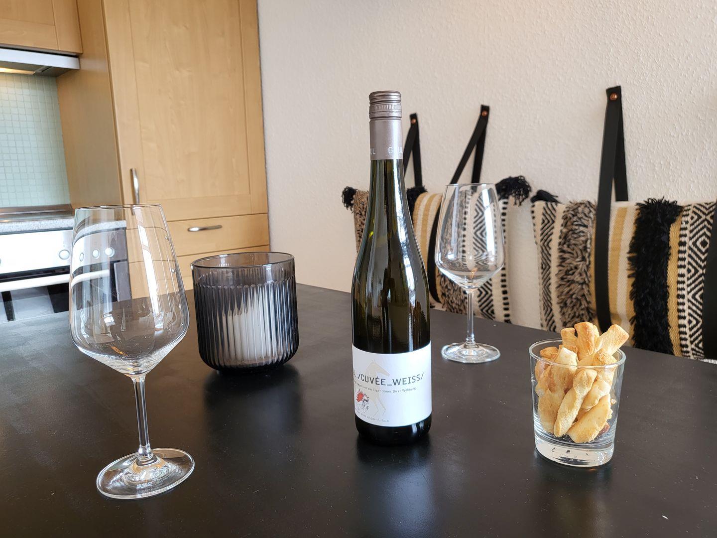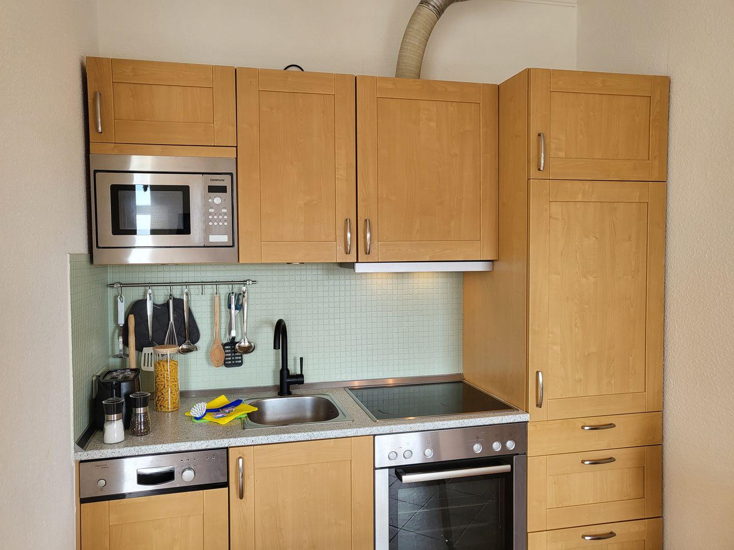 Die angrenzende Küche ist voll ausgestattet mit großem Cerankochfeld, Backofen, Kaffeemaschine, Toaster, Geschirrspüler, Mikrowelle sowie Kühlschrank mit Gefrierfach. Ein Soda-Stream ist vorhanden, eine eigene CO² Patrone mit blauem Anschlussstück dürfen Gäste gerne mitbringen.