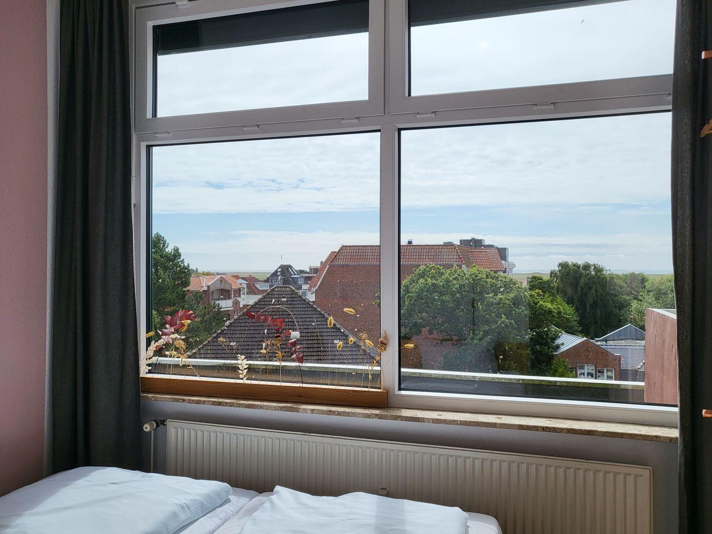 Das Schlafzimmer mit 180x200cm Doppelbett bietet einen beeindruckenden Blick über St. Peter Ording - bis hin zum Meer. Das Schlafzimmer ist gemütlich klein, der Zugang zum Doppelbett ist über eine Seite möglich - wie auf den Fotos zu sehen. Die Rückenlehne und das Fußteil des Bettes sind stufenlos höhenverstellbar, so dass Lesen mit Meerblick schon frühmorgens extra gemütlich ist.