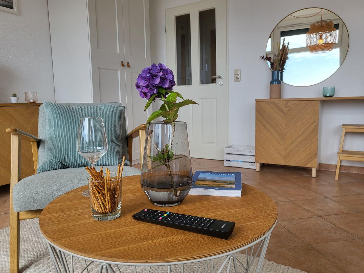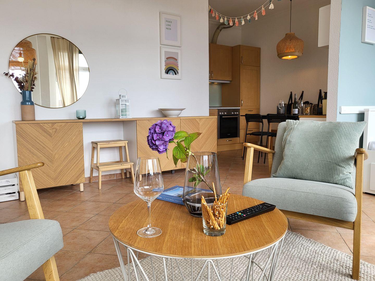 Die hell und nordisch „hyggelig“ eingerichtete, ca. 50m² große, 2-Zimmer Ferienwohnung für bis zu 4 Personen liegt in der 3. Etage und begeistert mit großem, möblierten Balkon und einem traumhaften Meerblick. Perfekt für den Urlaub in St. Peter Ording für 2-3 Erwachsene oder Familien mit 1-2 Kindern. Durch die insgesamt 8 Meter lange Fensterfront ist der modern eingerichtete, große Wohnbereich wunderbar hell und einladend. Ein komfortables 2er Sofa und zwei gemütliche Sessel laden zum Verweilen ein. Eine kuschelige Lese-Koje lädt zum Entspannen und Schmökern ein, sie lässt sich zudem zum komfortablen 160x200cm Doppelbett ausziehen. Für die multimediale Unterhaltung sorgen Flachbild-TV, eine Nintendo Wii mit Balanceboard, 4 Controllern und mehreren Spielen sowie kostenfreies W-LAN.