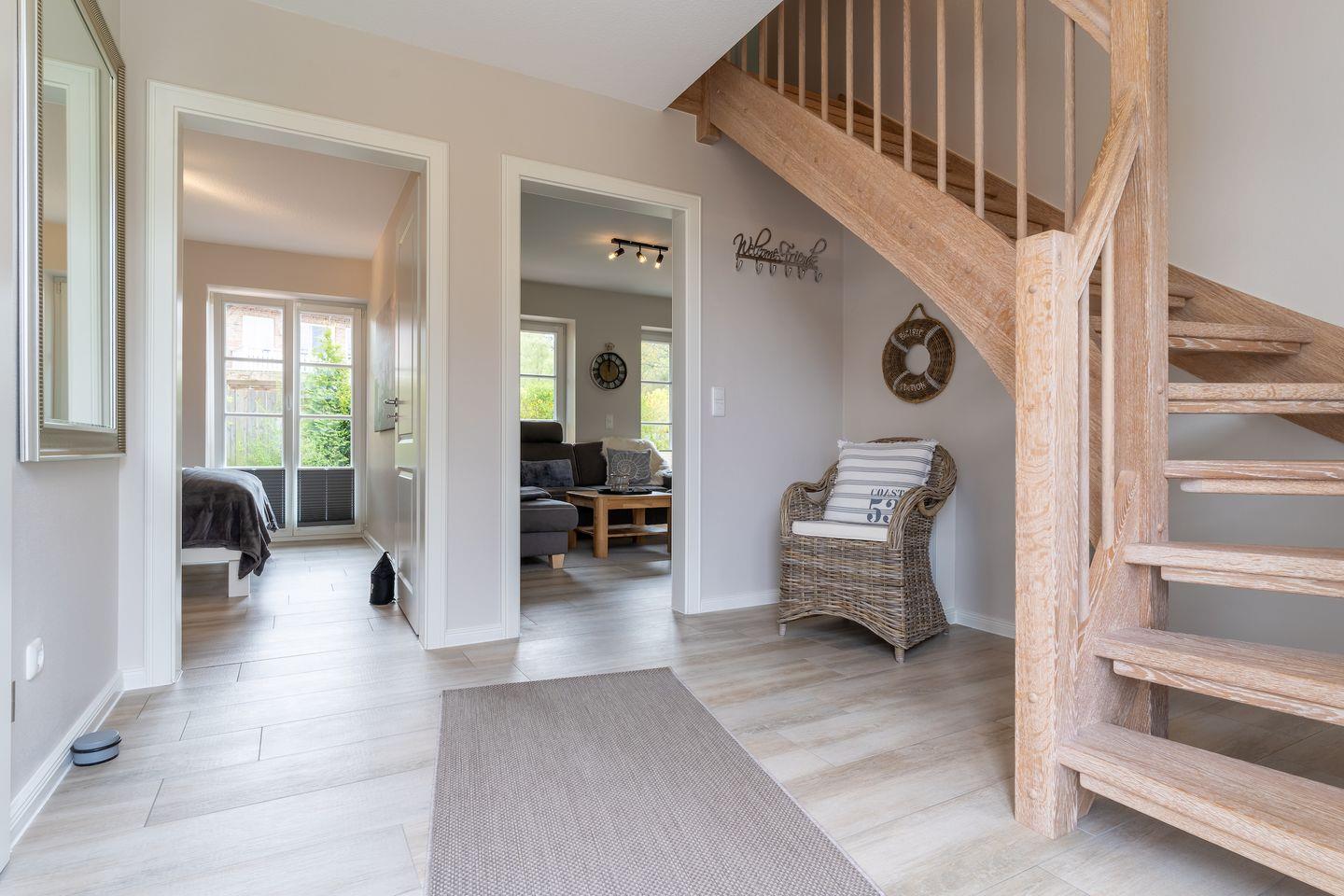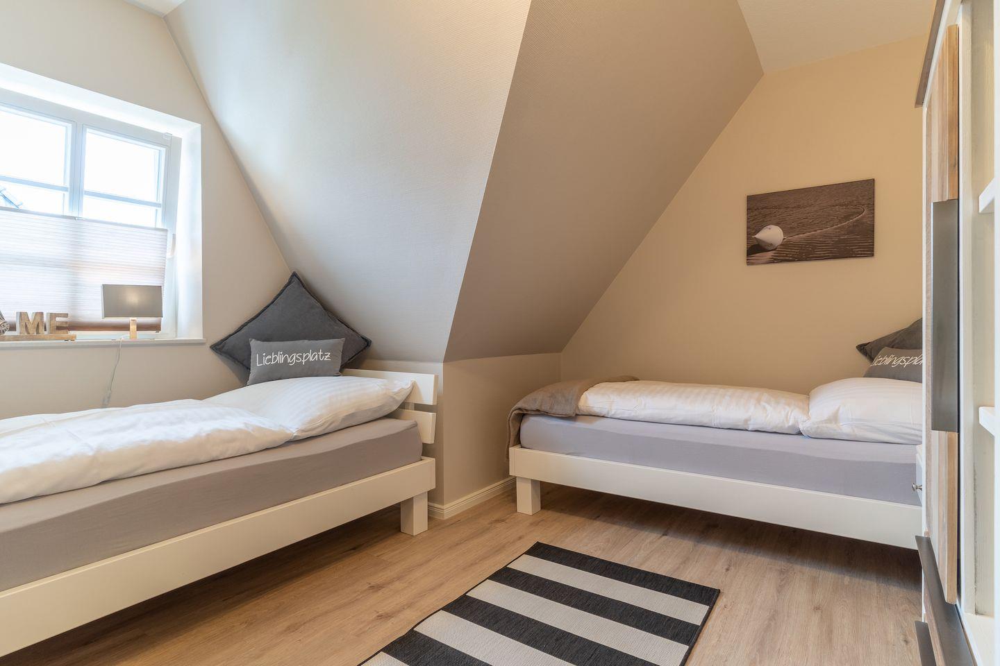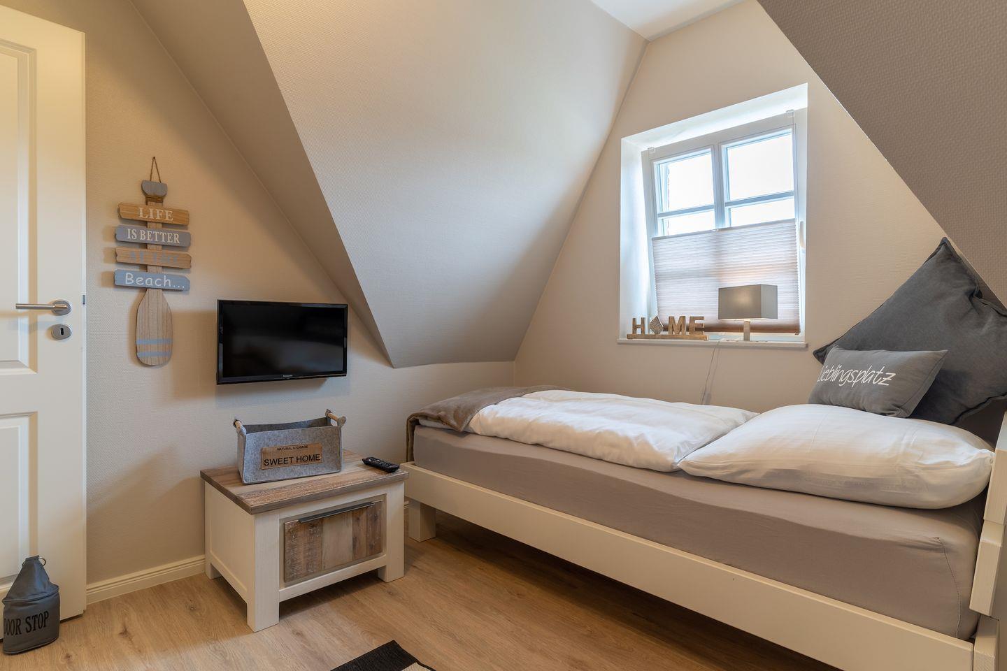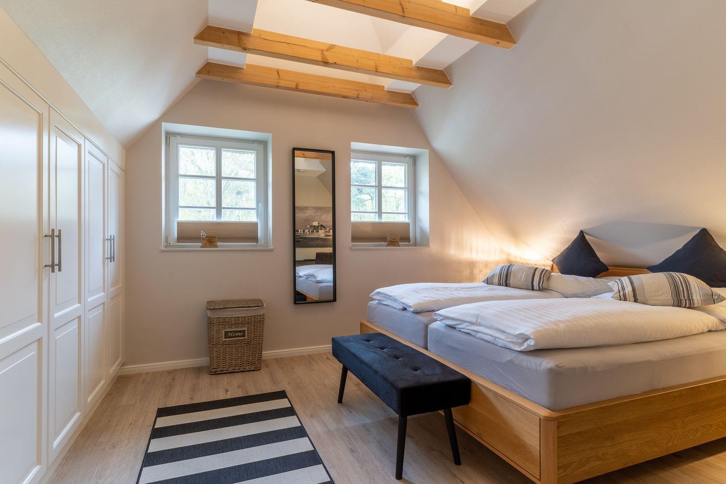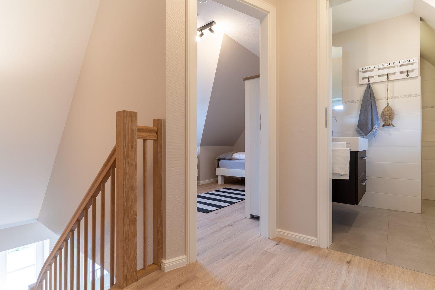 Über eine Holztreppe im Flur gelangt man in das Obergeschoss mit zwei Schlafzimmern. Ein Schlafzimmer ist mit einem Doppelbett ausgestattet und bietet jeden Komfort. Darüber hinaus befindet sich im Obergeschoss ein weiteres Schlafzimmer mit zwei Einzelbetten und einem TV. Außerdem ist im Obergeschoss ein weiteres Duschbad.