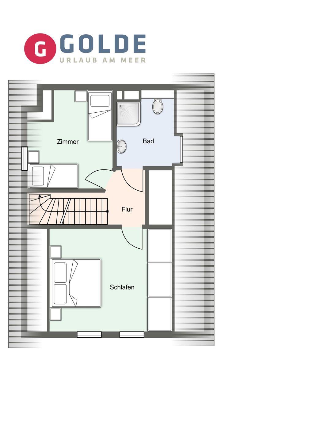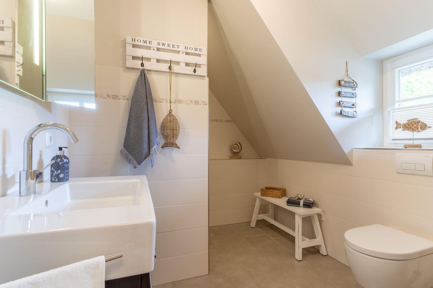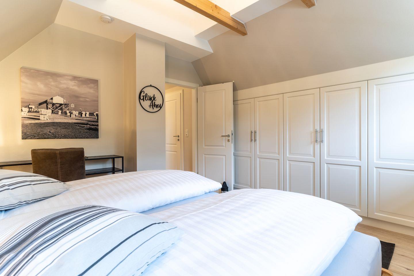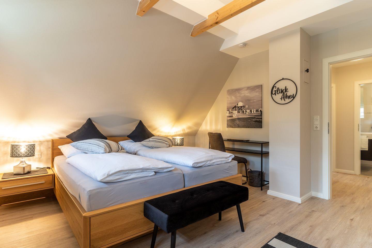 Über eine Holztreppe im Flur gelangt man in das Obergeschoss mit zwei Schlafzimmern. Ein Schlafzimmer ist mit einem Doppelbett ausgestattet und bietet jeden Komfort. Darüber hinaus befindet sich im Obergeschoss ein weiteres Schlafzimmer mit zwei Einzelbetten und einem TV. Außerdem ist im Obergeschoss ein weiteres Duschbad.