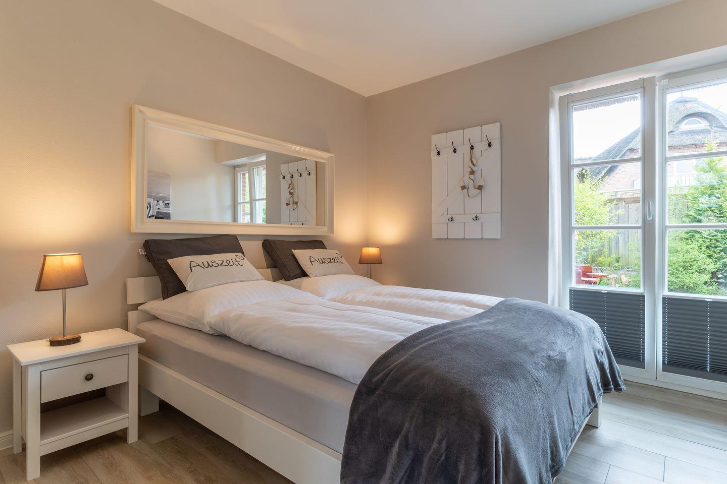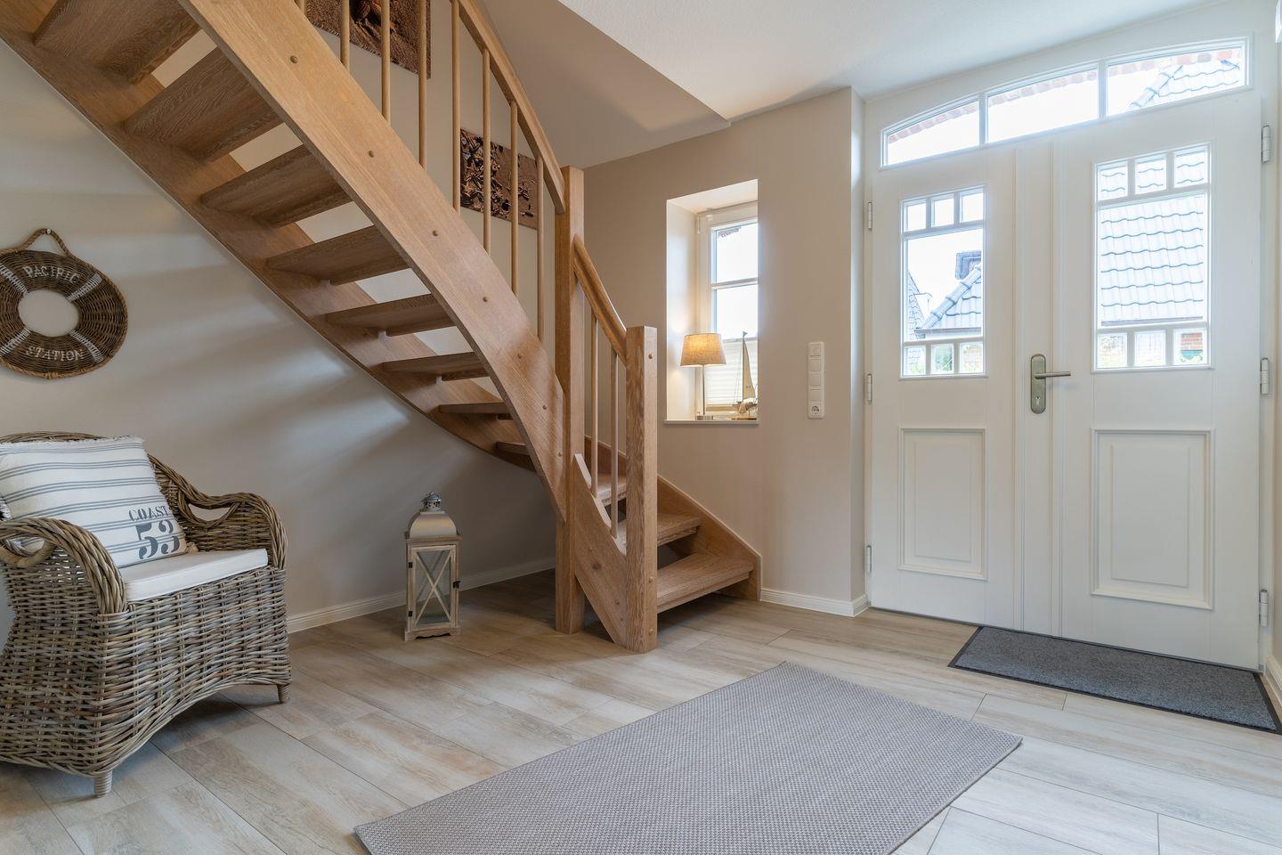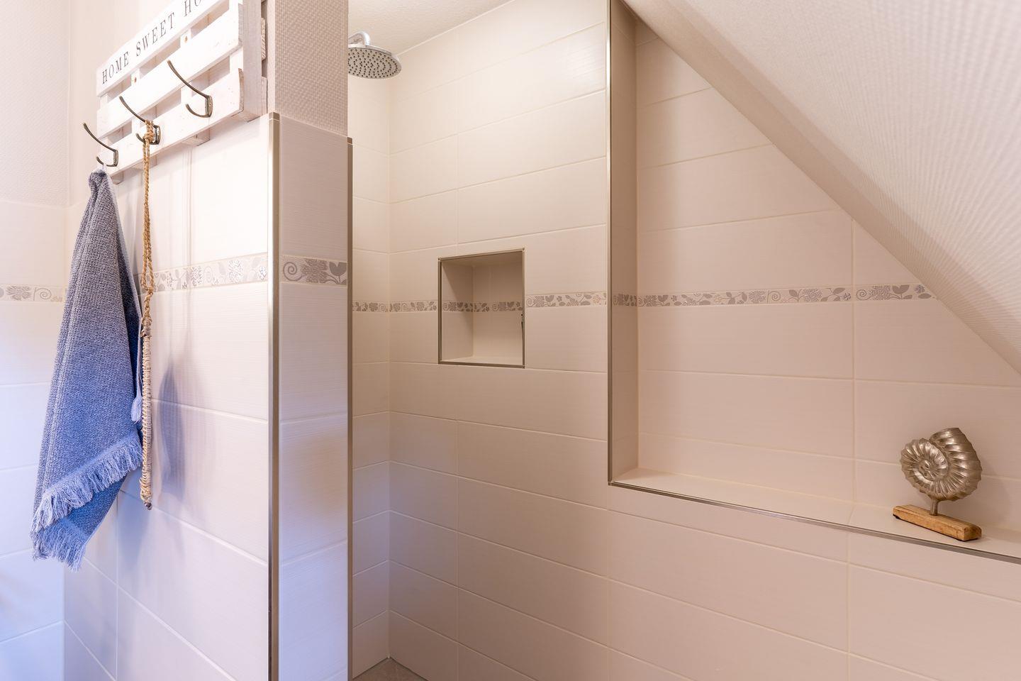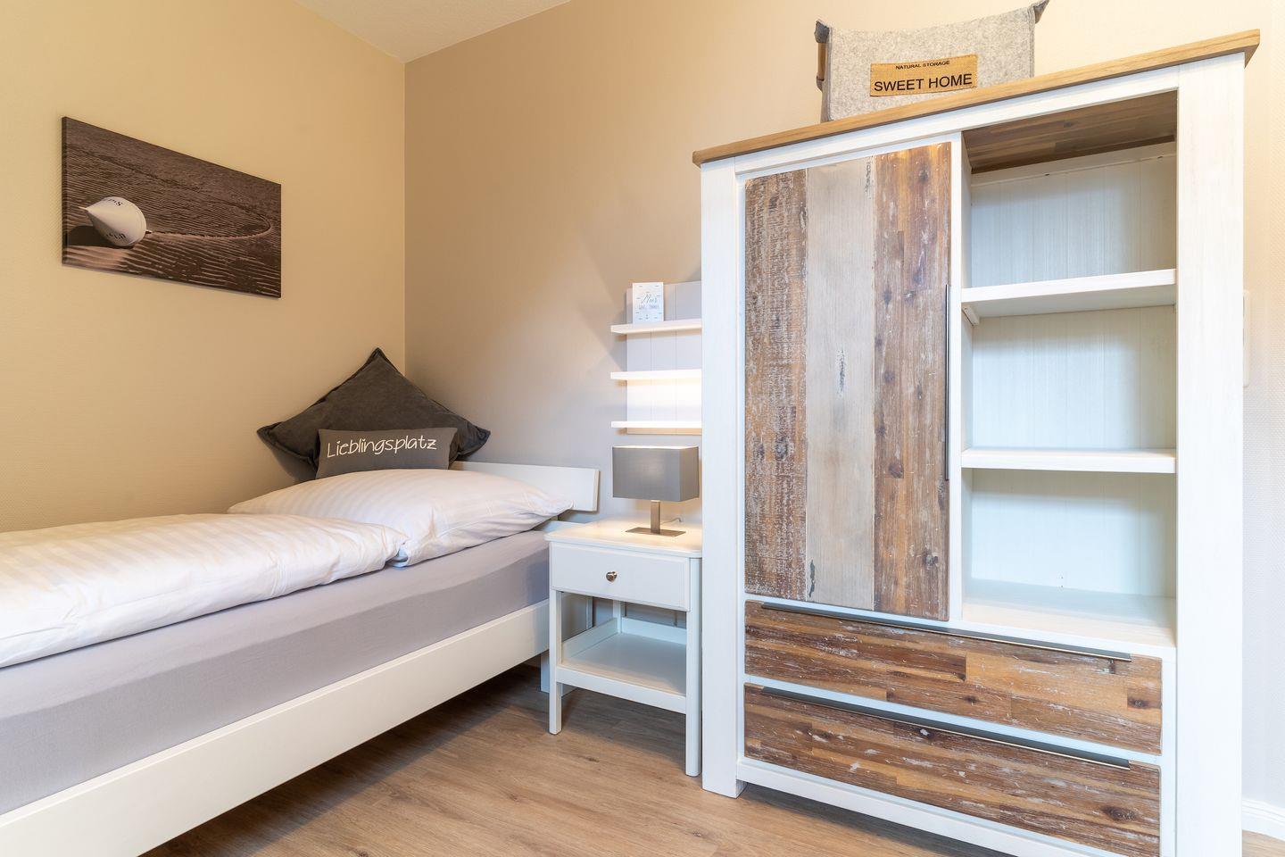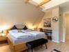 Über eine Holztreppe im Flur gelangt man in das Obergeschoss mit zwei Schlafzimmern. Ein Schlafzimmer ist mit einem Doppelbett ausgestattet und bietet jeden Komfort. Darüber hinaus befindet sich im Obergeschoss ein weiteres Schlafzimmer mit zwei Einzelbetten und einem TV. Außerdem ist im Obergeschoss ein weiteres Duschbad.