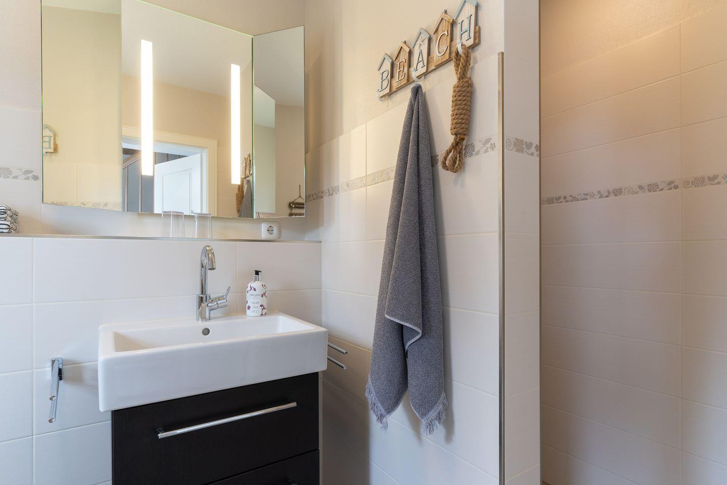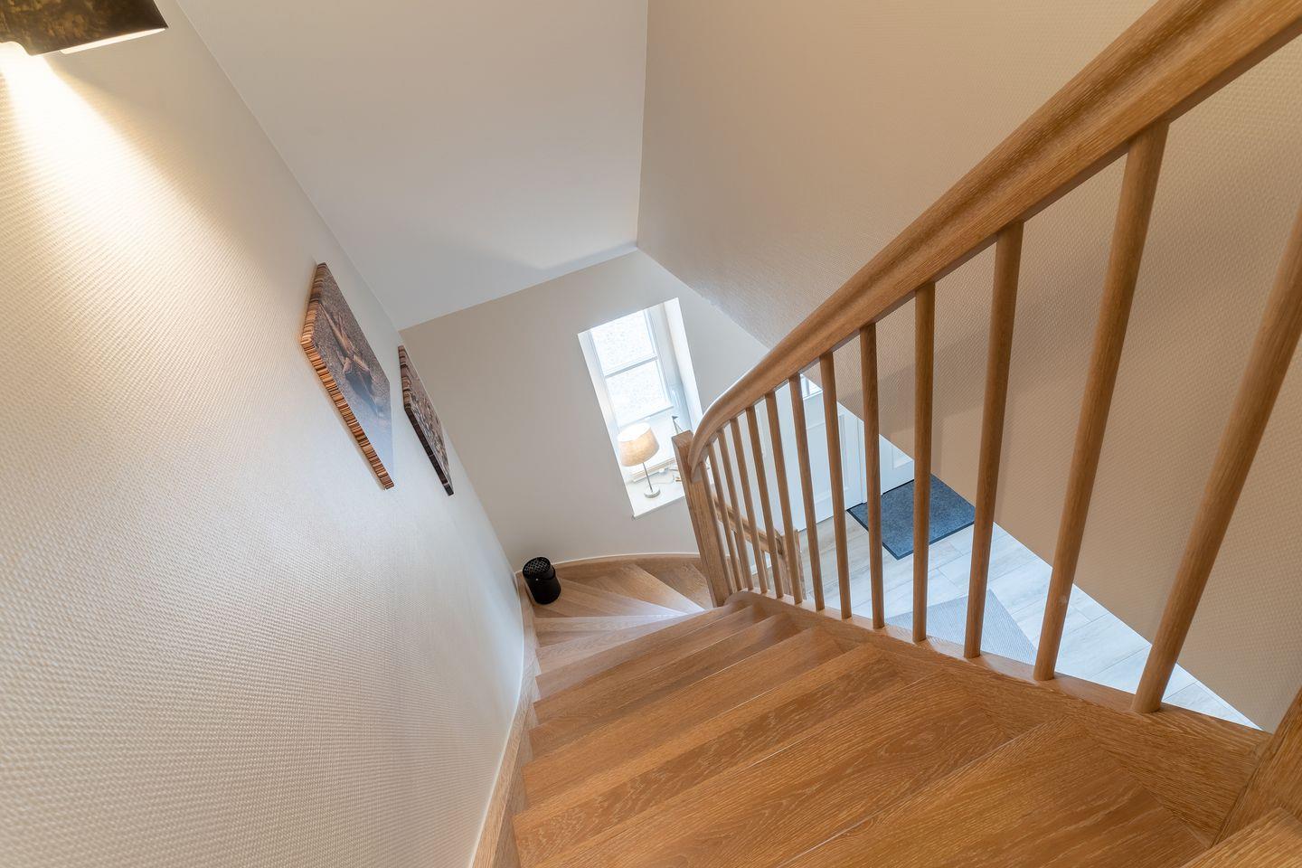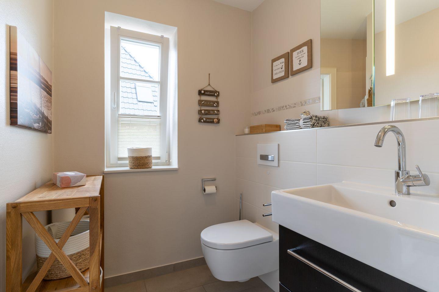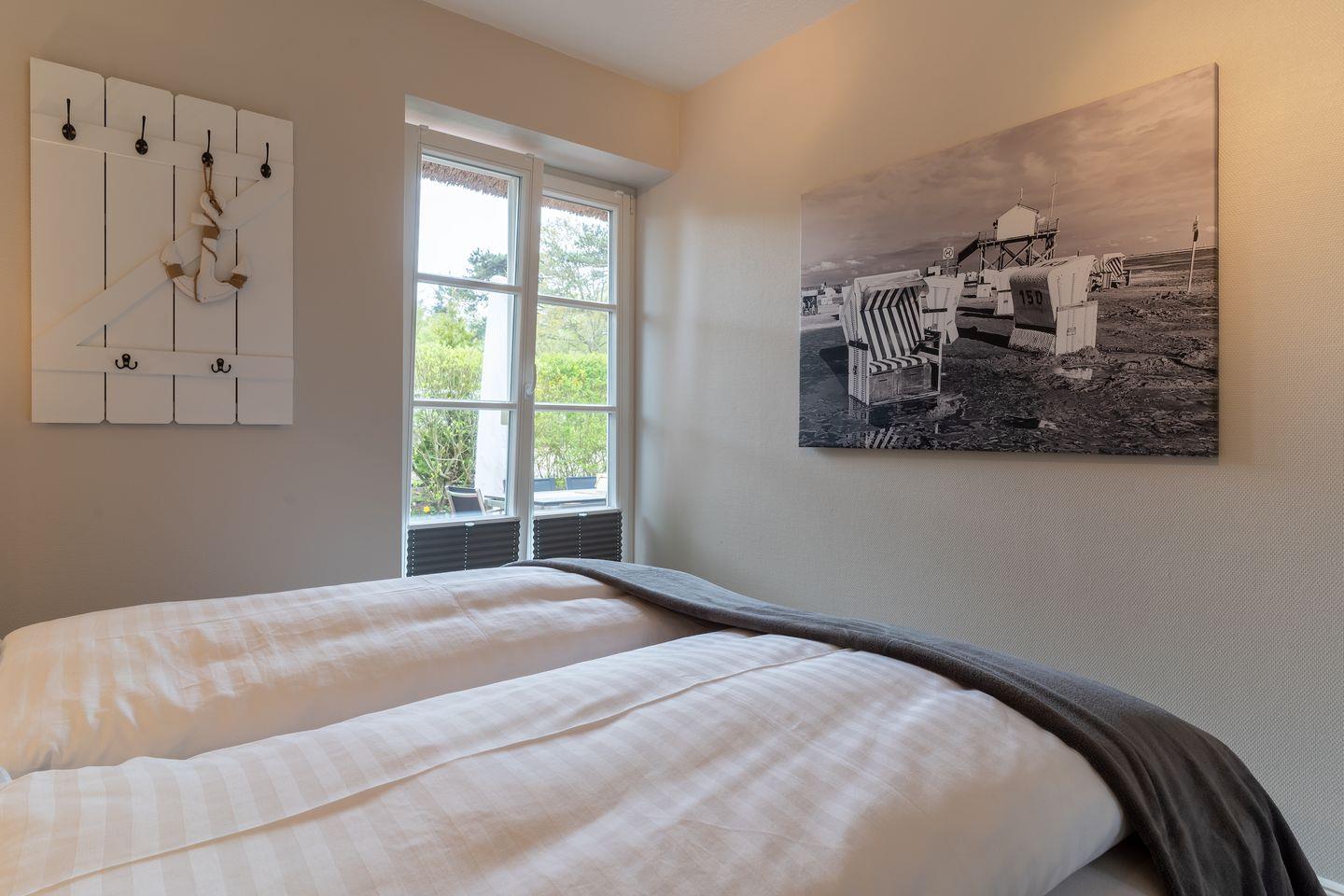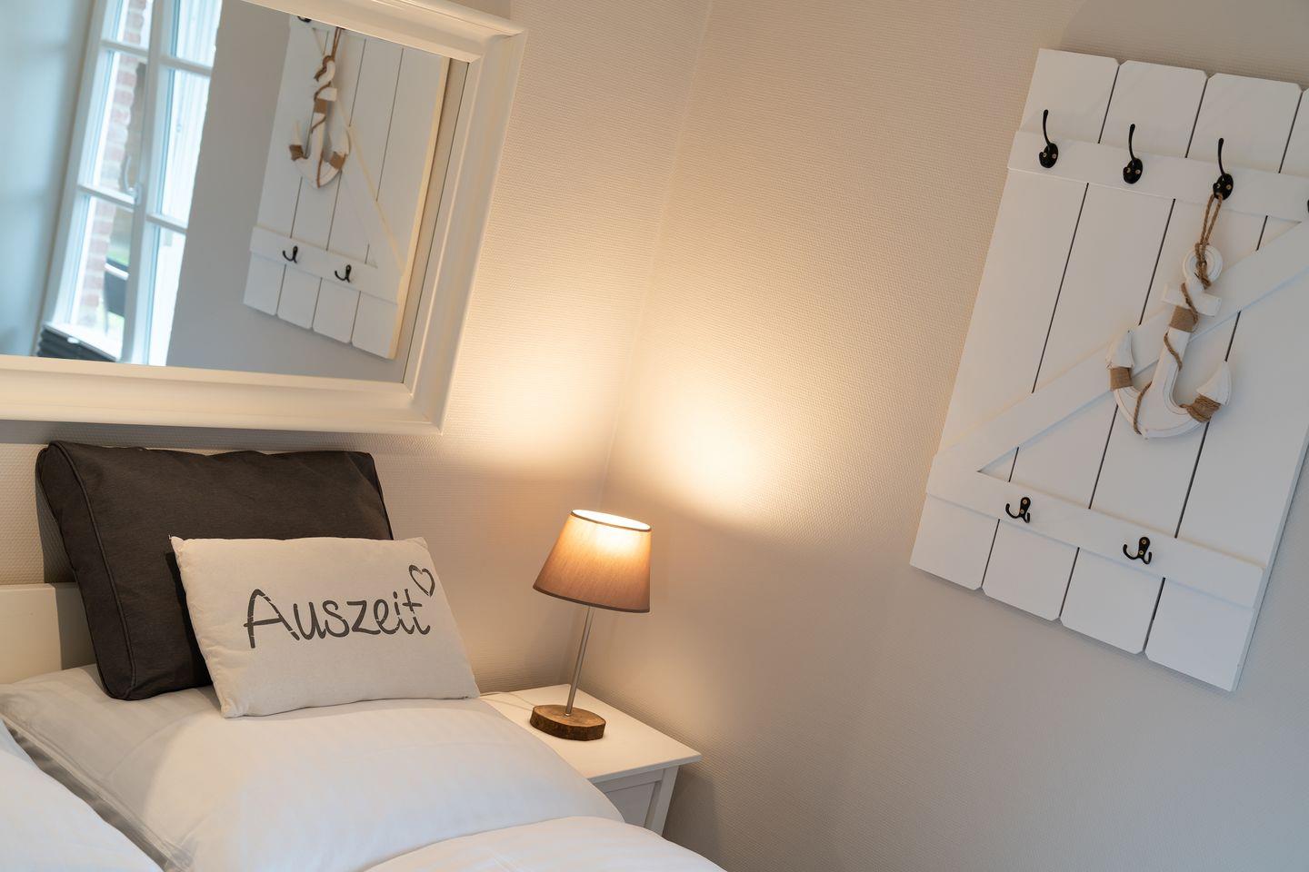 Über eine Holztreppe im Flur gelangt man in das Obergeschoss mit zwei Schlafzimmern. Ein Schlafzimmer ist mit einem Doppelbett ausgestattet und bietet jeden Komfort. Darüber hinaus befindet sich im Obergeschoss ein weiteres Schlafzimmer mit zwei Einzelbetten und einem TV. Außerdem ist im Obergeschoss ein weiteres Duschbad.