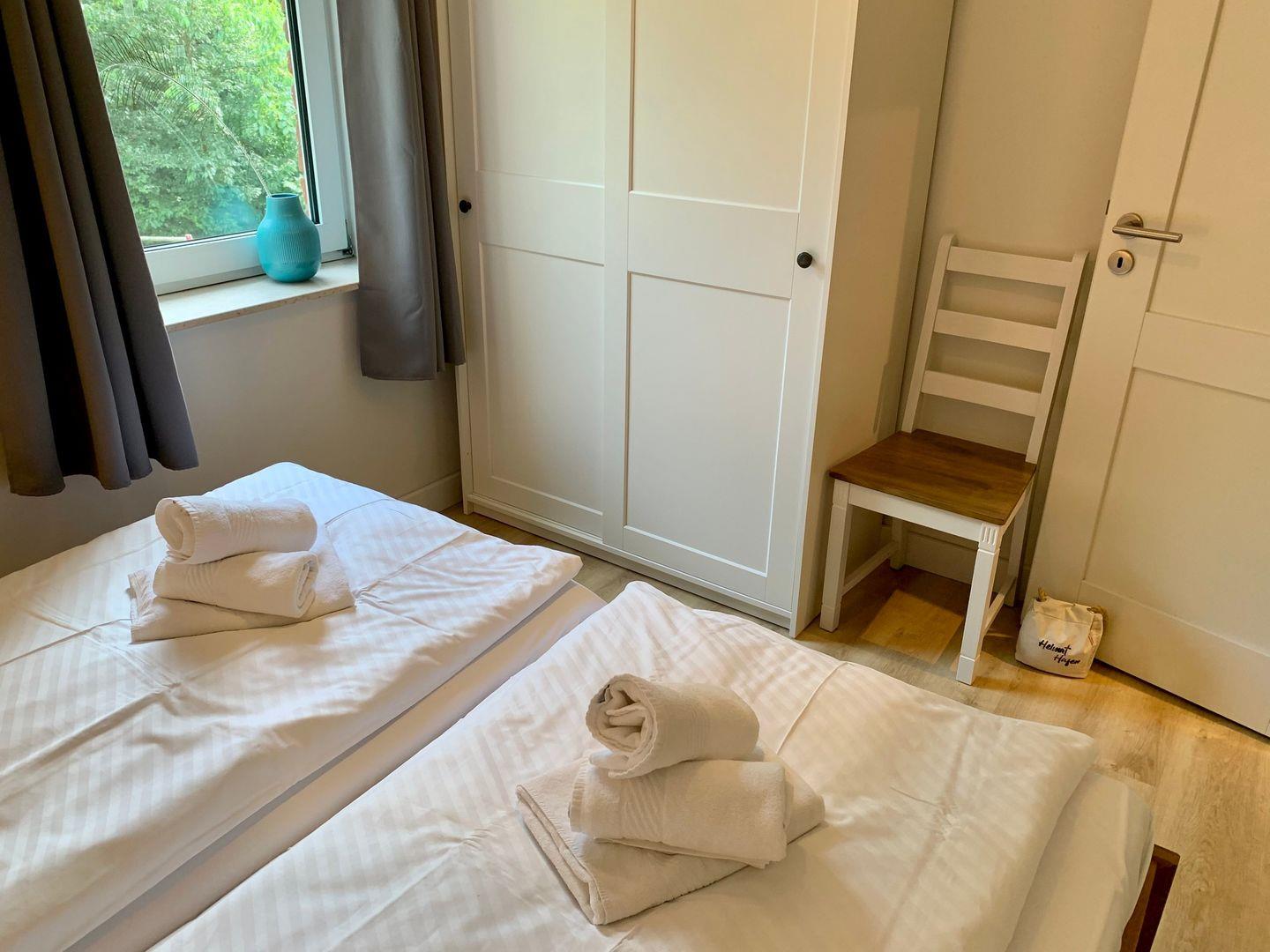 Das erste der beiden Schlafzimmer befindet sich ebenfalls im 1. OG und ist ausgestattet mit 180x200cm Doppelbett mit Einzelmatratzen.