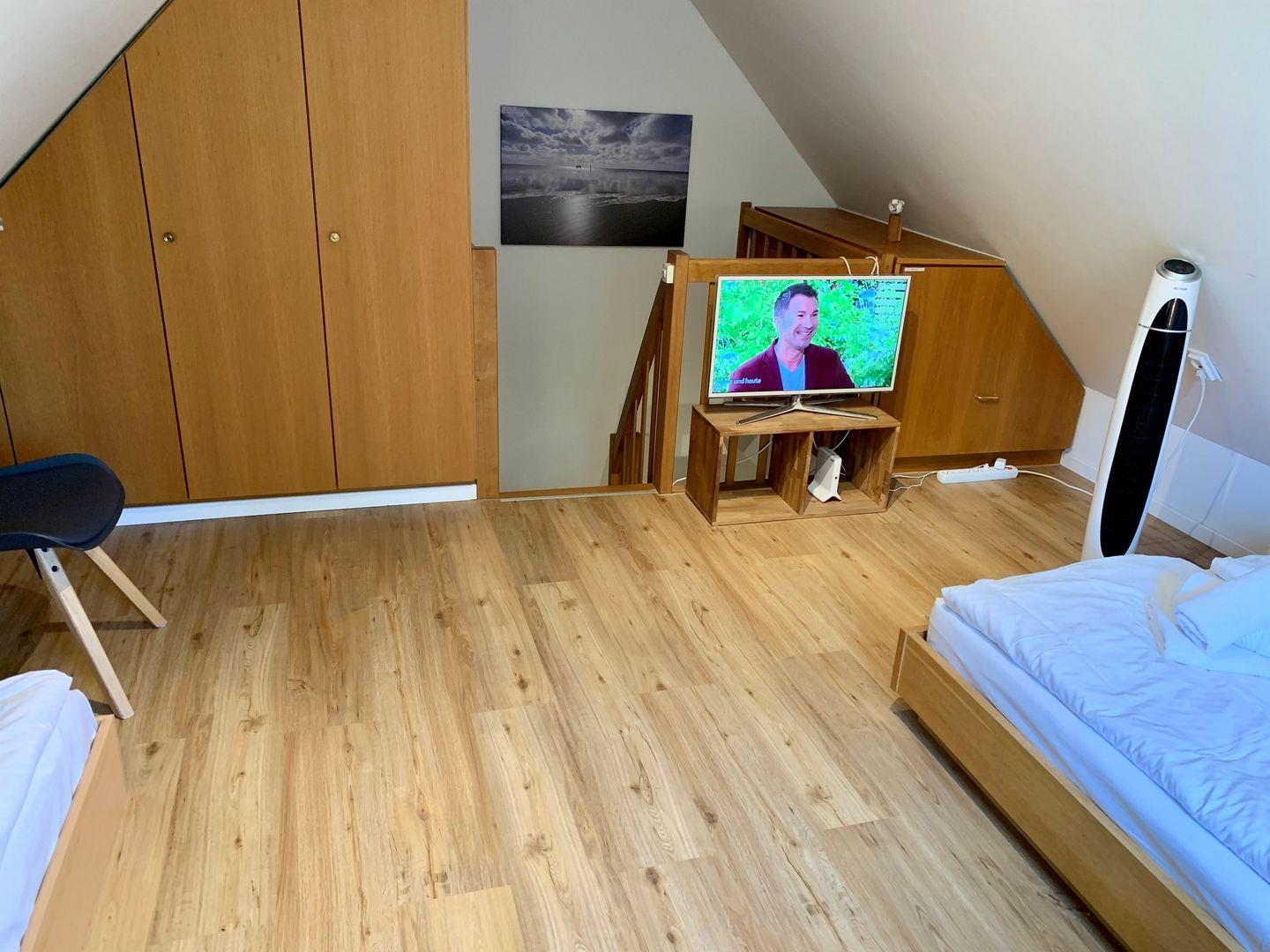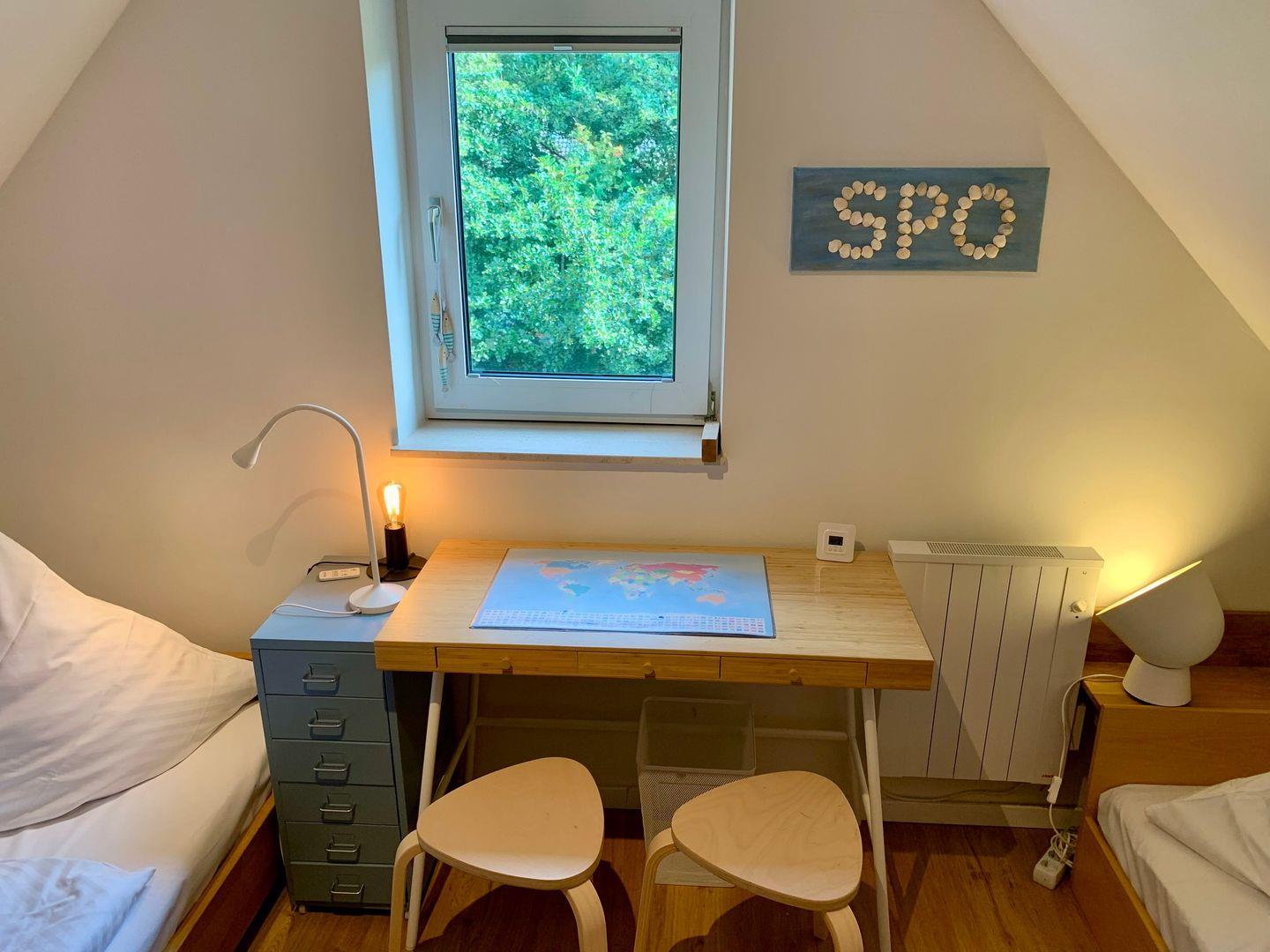 Hier steht ein weiterer Smart-TV zur Verfügung, ein Schreibtisch sowie Einbauschränke sind ebenfalls vorhanden, ein Ventilator steht zur Verfügung.