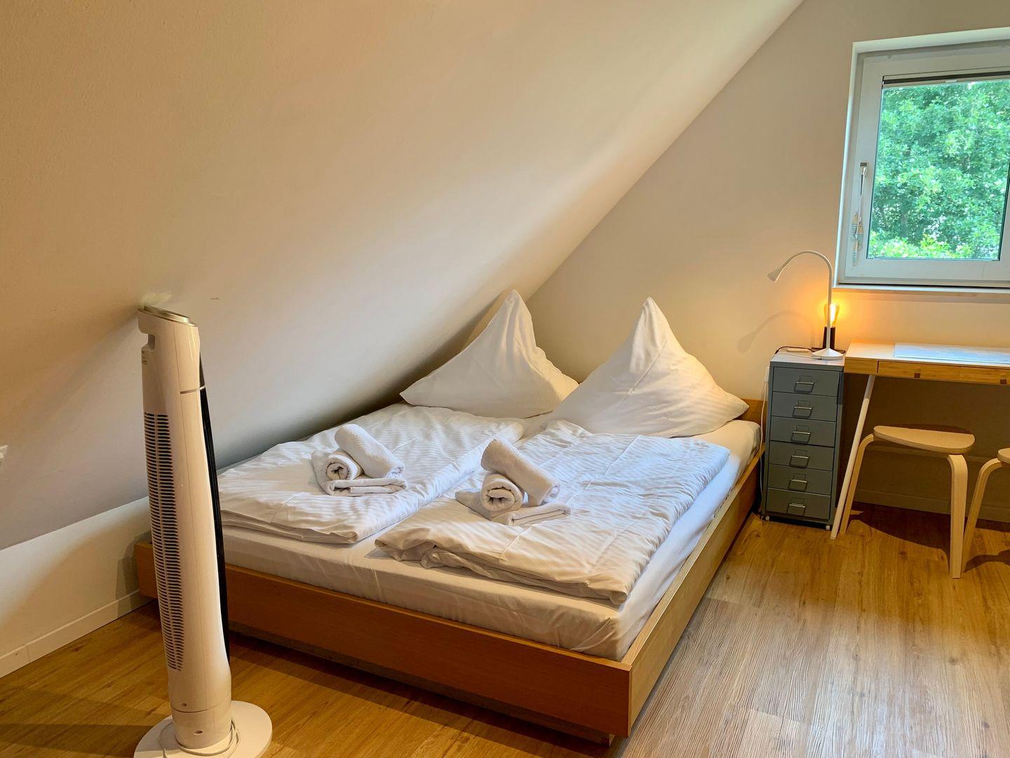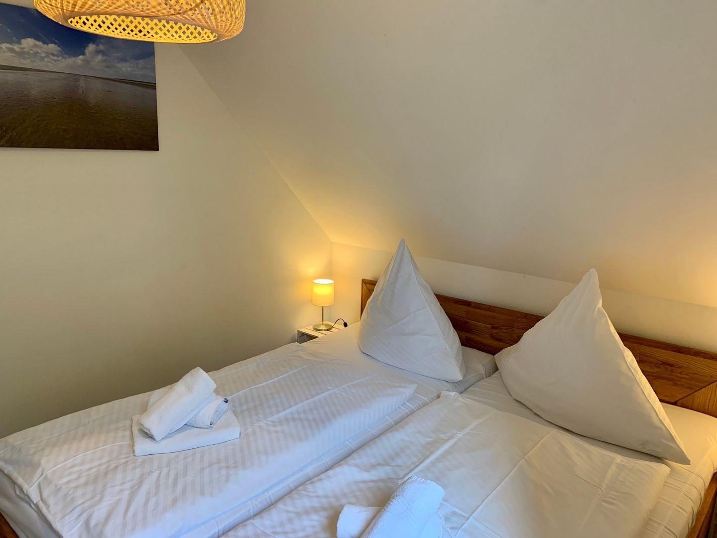 Das große Schlafzimmer im Dachgeschoss ist ausgestattet mit 160x200cm Doppelbett sowie einem Einzelbett.