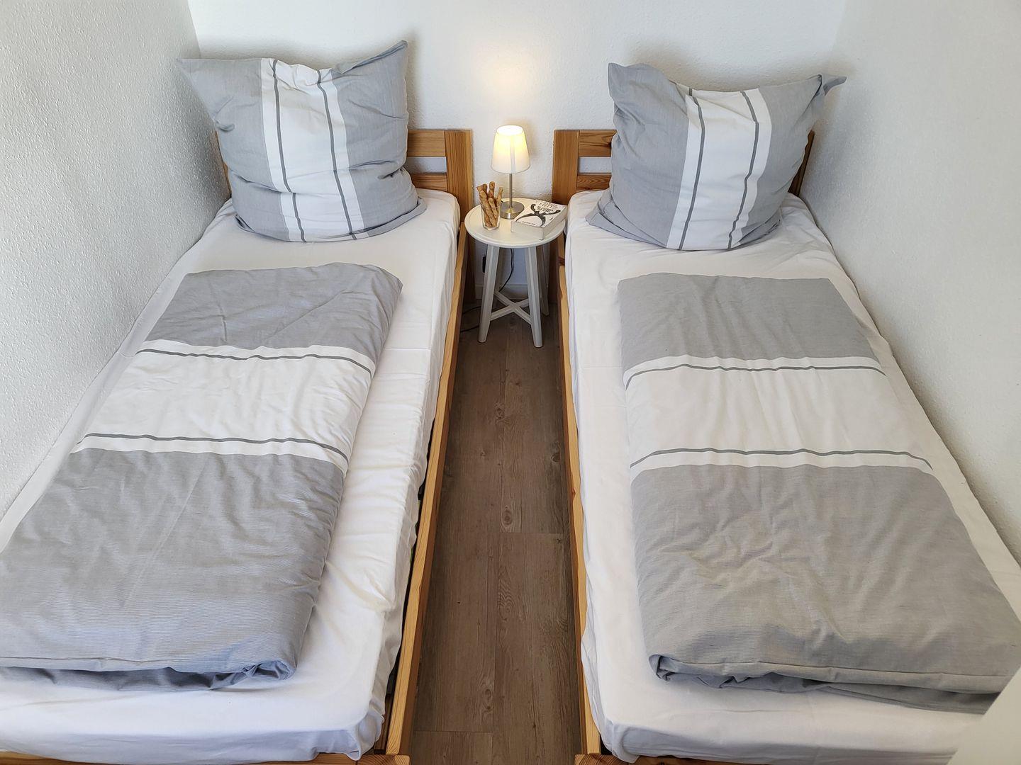 Zwei separate Schlafzimmer sind mit jeweils 2 Einzelbetten ausgestattet, zur Ferienwohnung gehört zudem ein modernes Duschbad mit WC.