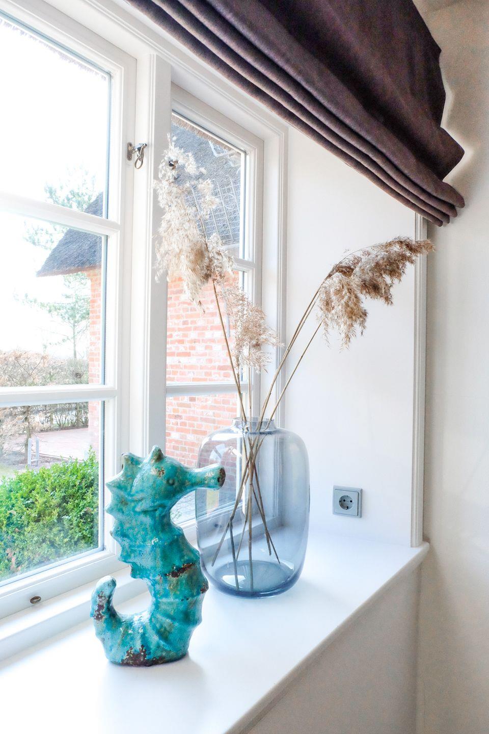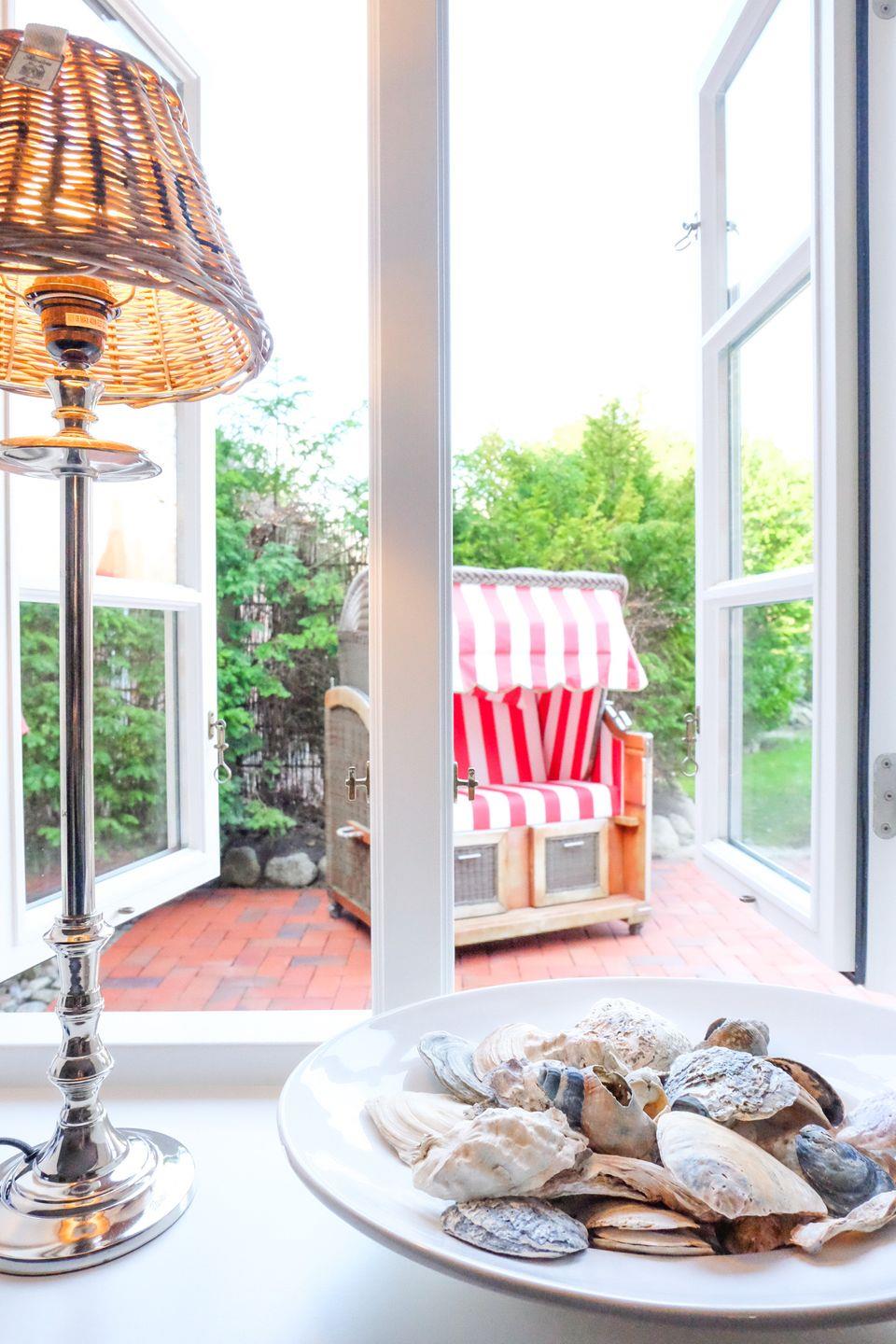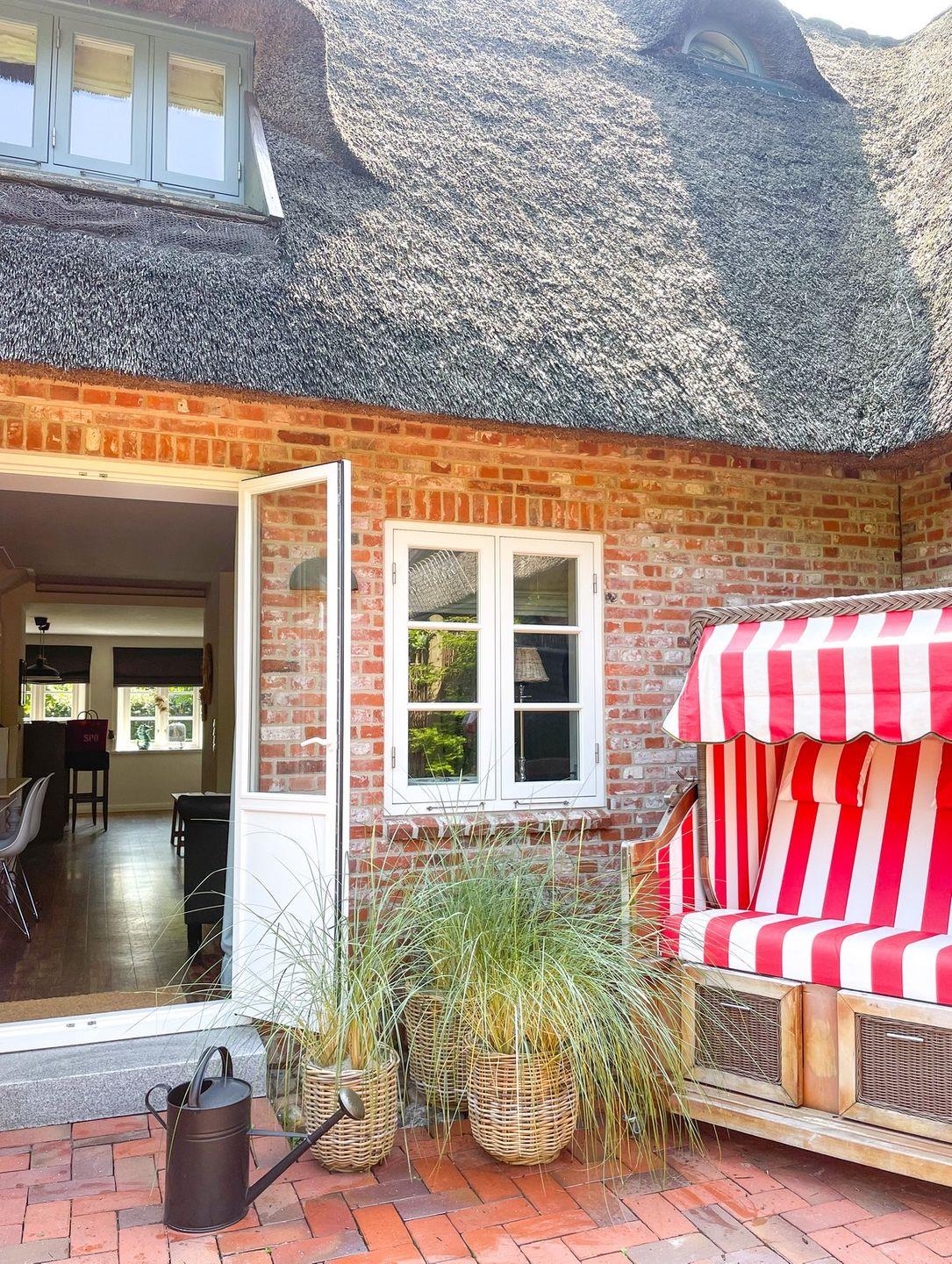 Durch den Übergang zur Terrasse wirkt der modern und lebendig gestaltete Wohnraum wunderbar hell und einladend. Durch die Holzsprossenfenster bietet sich ein toller Ausblick auf den Garten und das Reetdach.