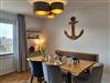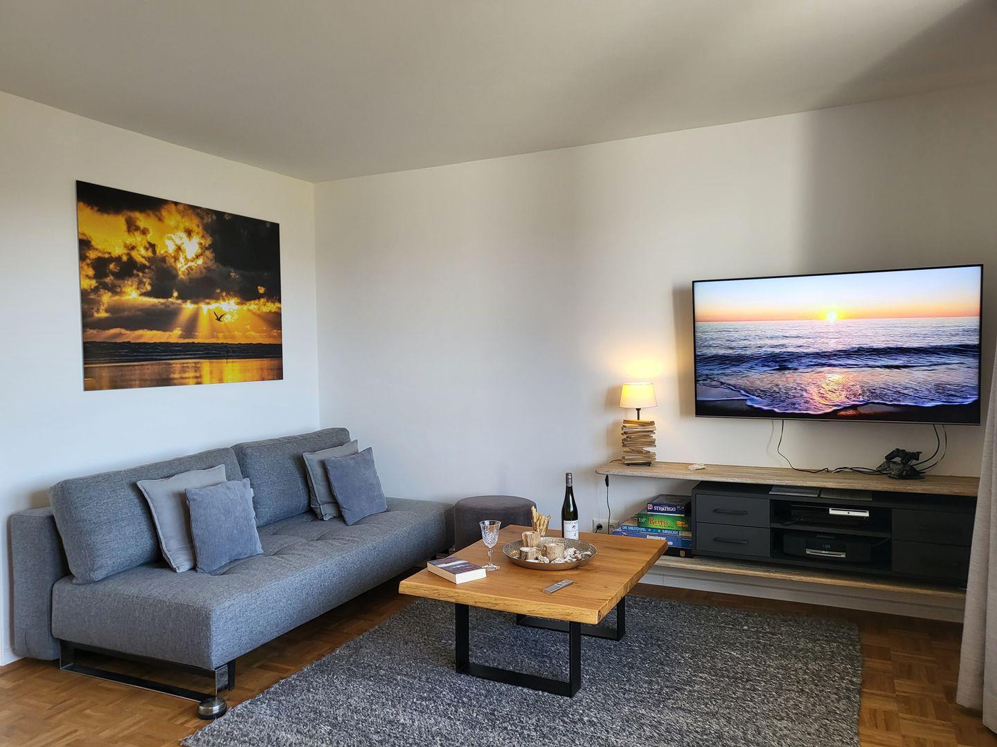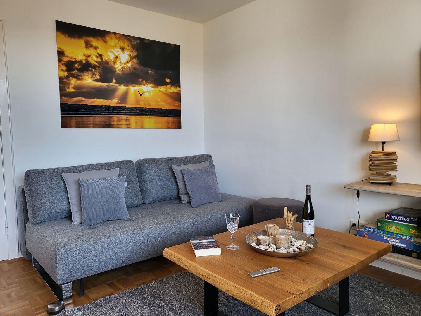 Kunstvoll verarbeitetes Treibholz, elegant drapierte Muscheln und andere Eindrücke aus der Region Nordfriesland liefern ein wunderbares Nordseefeeling. Ein einladender Essbereich sowie ein großer Flachbild-TV mit DVD- und Blu-Ray-Player, Playstation und Sky (Sport- und Entertainment) und DAZN (Sportkanal) sorgen für viele schöne, gemeinsame Stunden, eine Auswahl an Büchern und Spielen eröffnet zusätzliche Möglichkeiten der Freizeitgestaltung. Das komfortable Sofa lässt sich mit wenigen Handgriffen zur gemütlichen Schlafcouch mit Federkernmatratze umwandeln. Angrenzend an den Wohnraum befindet sich die kompakte, offene Küche des Apartments.