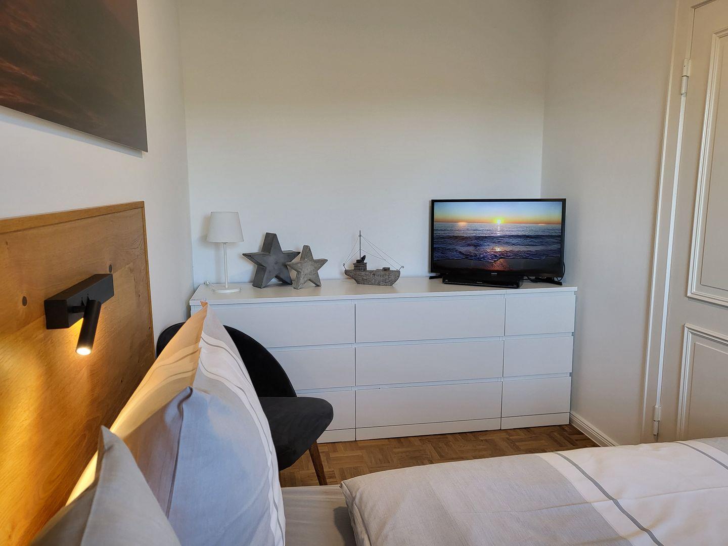 Ein zusätzlicher großer Flachbild-TV gehört ebenfalls zur Ausstattung des maritim eingerichteten Schlafzimmers.
