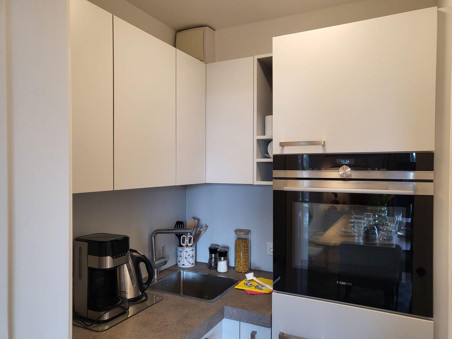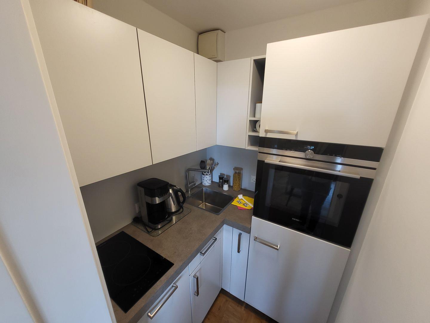 Die Küche ist hochwertig ausgestattet und verfügt unter anderem über Cerankochfeld, Backofen, Geschirrspüler, Kühlschrank mit Gefrierfach sowie einen Wasserkocher und eine Kaffeemaschine.