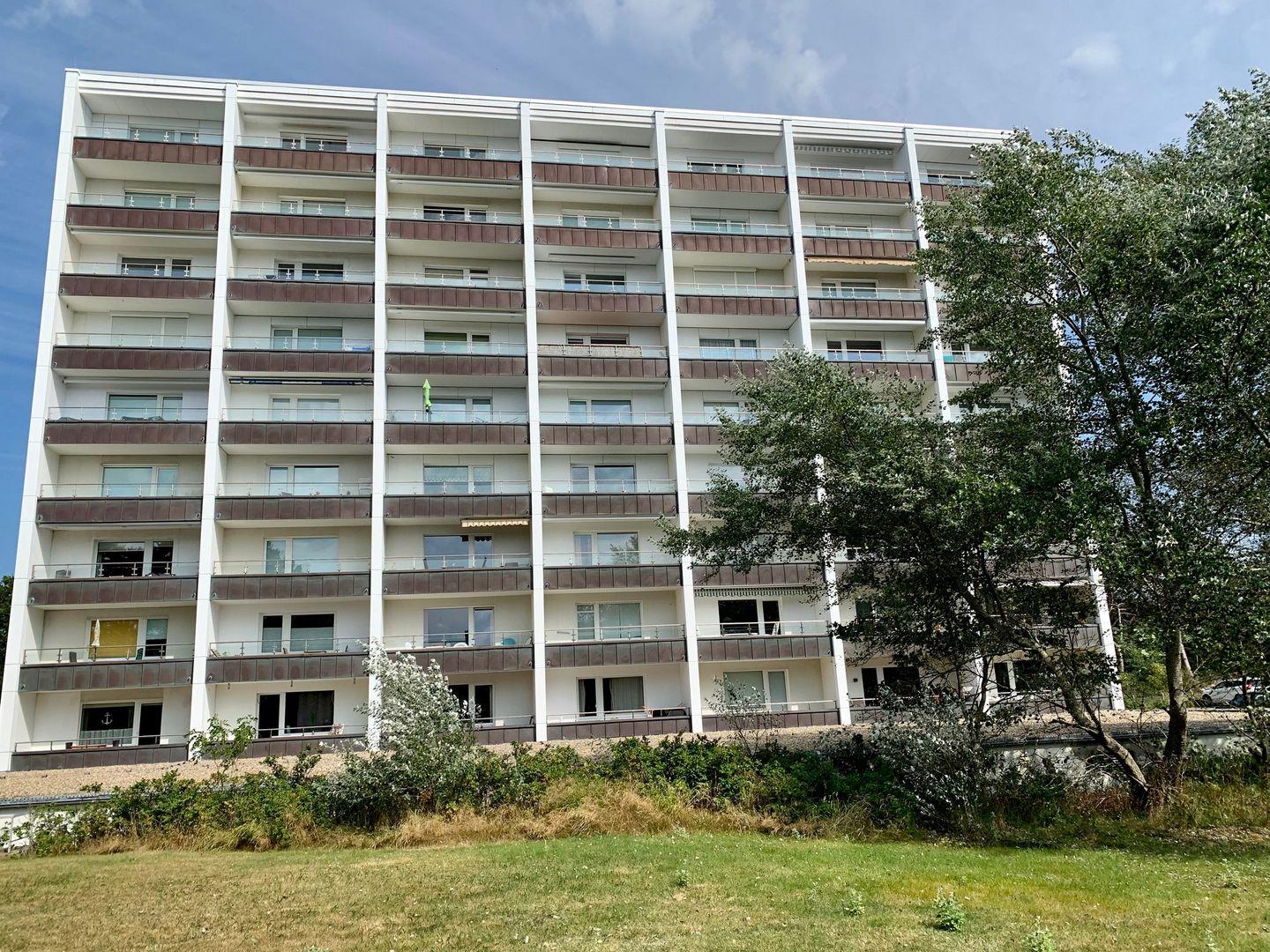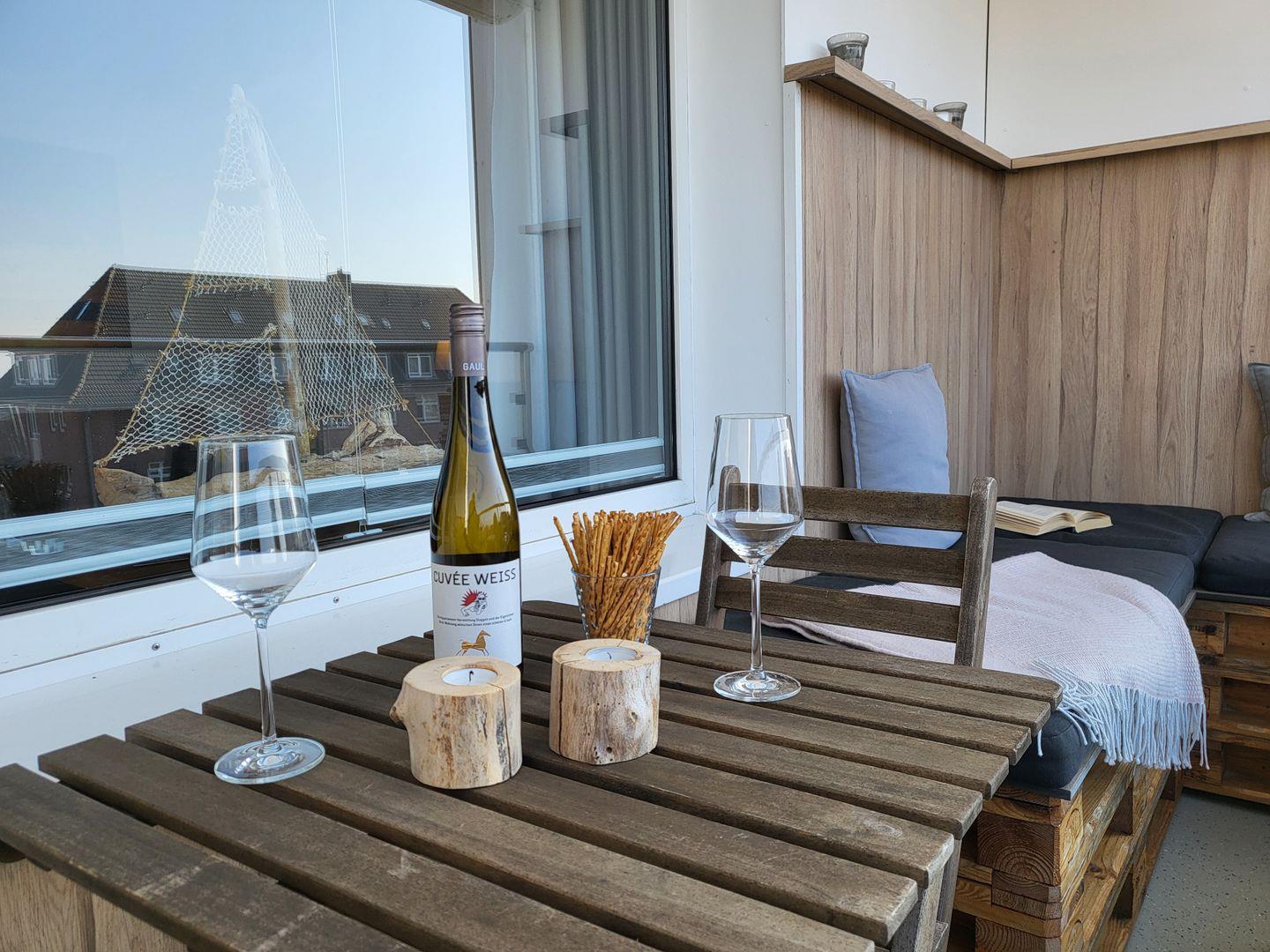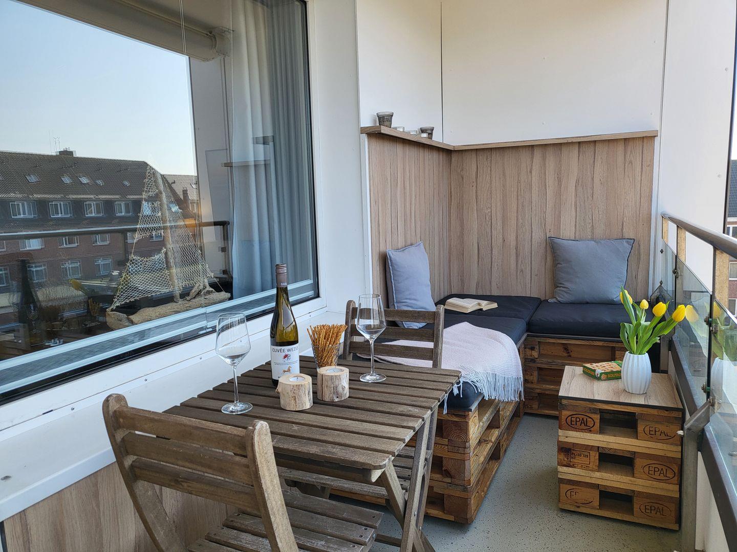 Durch die große Fensterfront und den Übergang zum Balkon wirkt das maritim und modern eingerichtete Wohnzimmer wunderbar hell und einladend. Eine neue Markise (aus 2021) ist auf dem Balkon vorhanden.