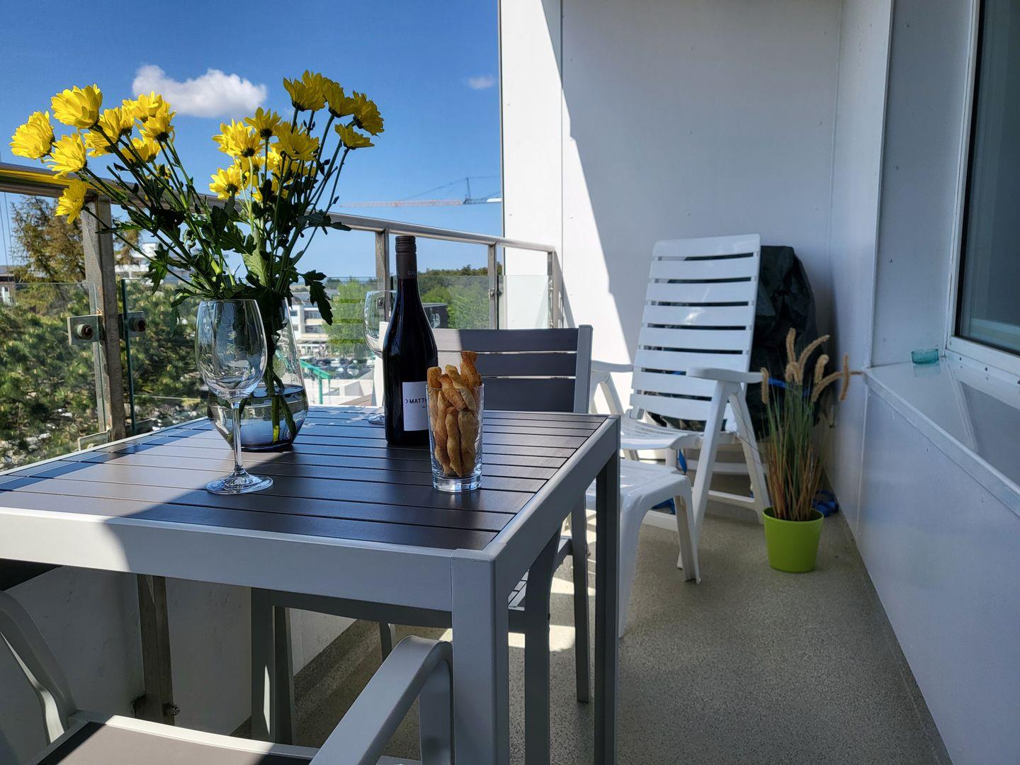 Zentrale 2-Zimmer Ferienwohnung im 4. OG für bis zu 4 Personen. Möblierter Balkon mit Meerblick.