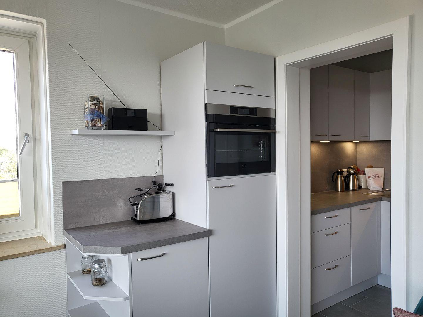 Unter anderem stehen hier Cerankochfeld und Backofen zur Verfügung, ein Kühlschrank mit Gefrierfach, eine Mikrowelle sowie Wasserkocher und Kaffeemaschine stehen ebenfalls bereit.