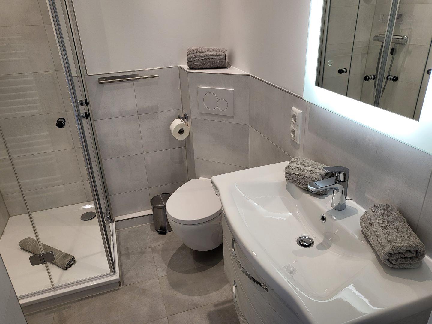 Modernes Duschbad mit WC. PKW-Stellplatz, W-LAN und gemeinschaftlicher Waschraum vorhanden. Fahrstuhl im Haus.