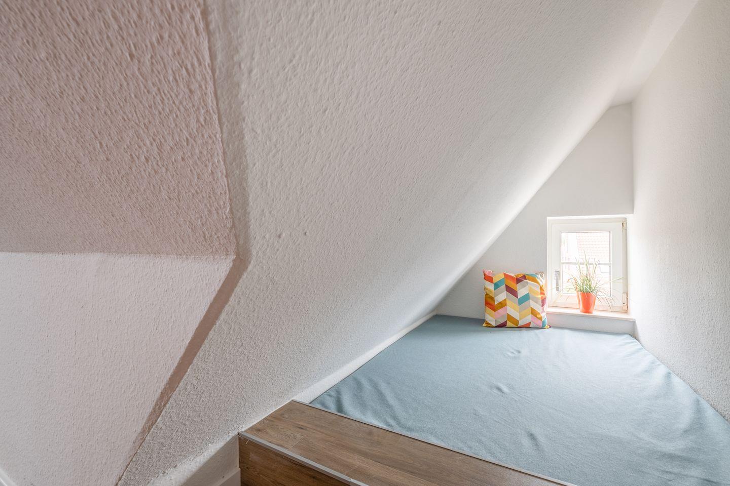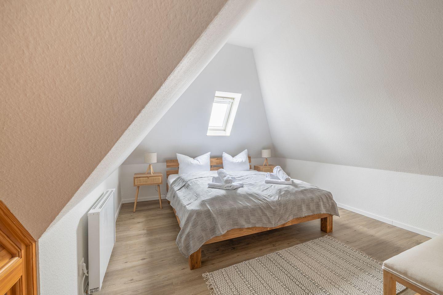 Das Schlafzimmer mit Doppelbett (180 x 200) und einem begehbaren Kleiderschrank erreichen Sie über eine steilere offene Treppe aus dem Wohnraum heraus. Auf Anfrage können bis zu 2 kleine Kinder zusätzlich in der offen mit dem Schlafzimmer verbundenenen Schlafnische übernachten. Ein weiteres Schlafzimmer mit einem Etagenbett steht Ihnen im 1. OG zur Verfügung.