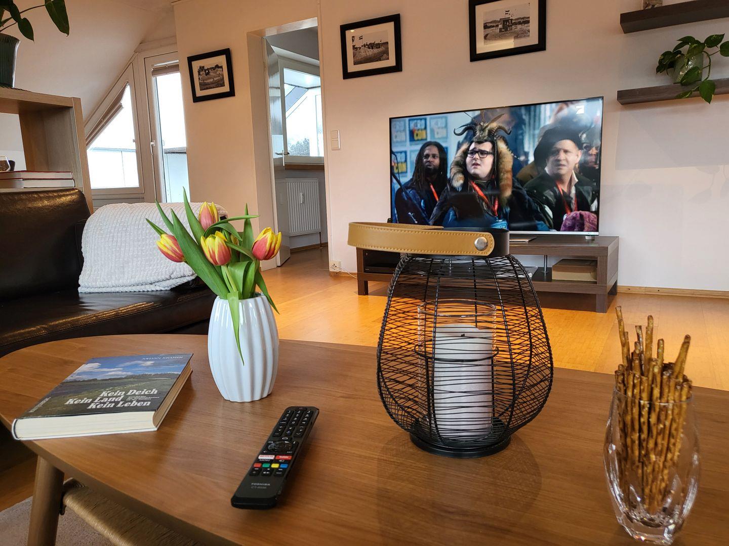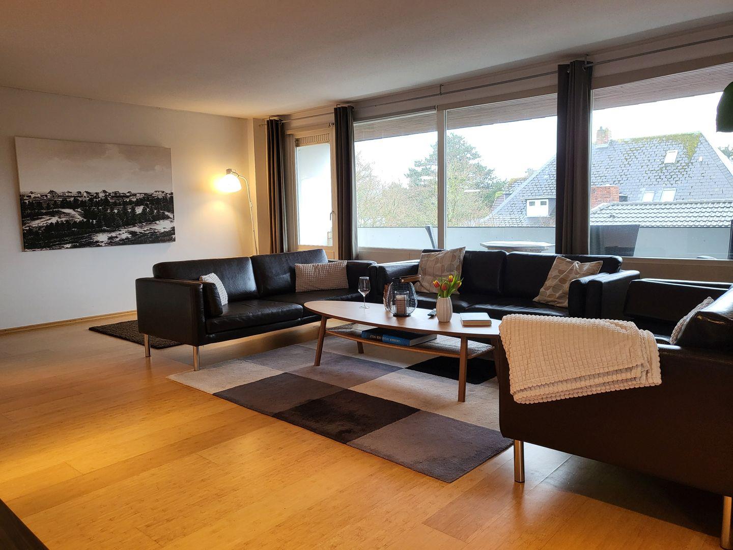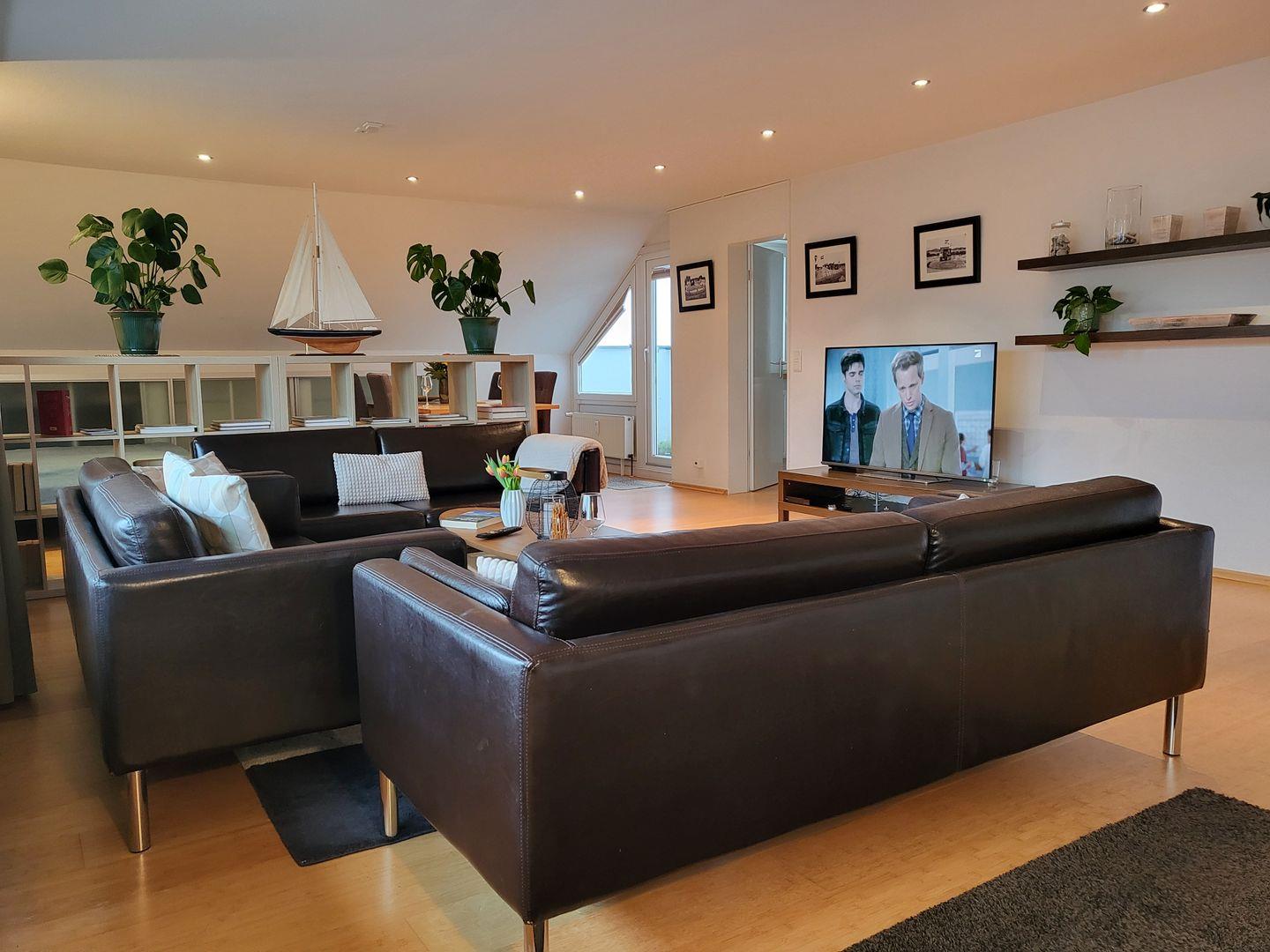 Durch das Panoramfenster und den Übergang zum Balkin wirkt der moderne Wohnraum wunderbar hell und einladend. Dort steht eine große, einladende Sofagarnitur zur Verfügung, ein großer Flachbild-TV ist vorhanden.