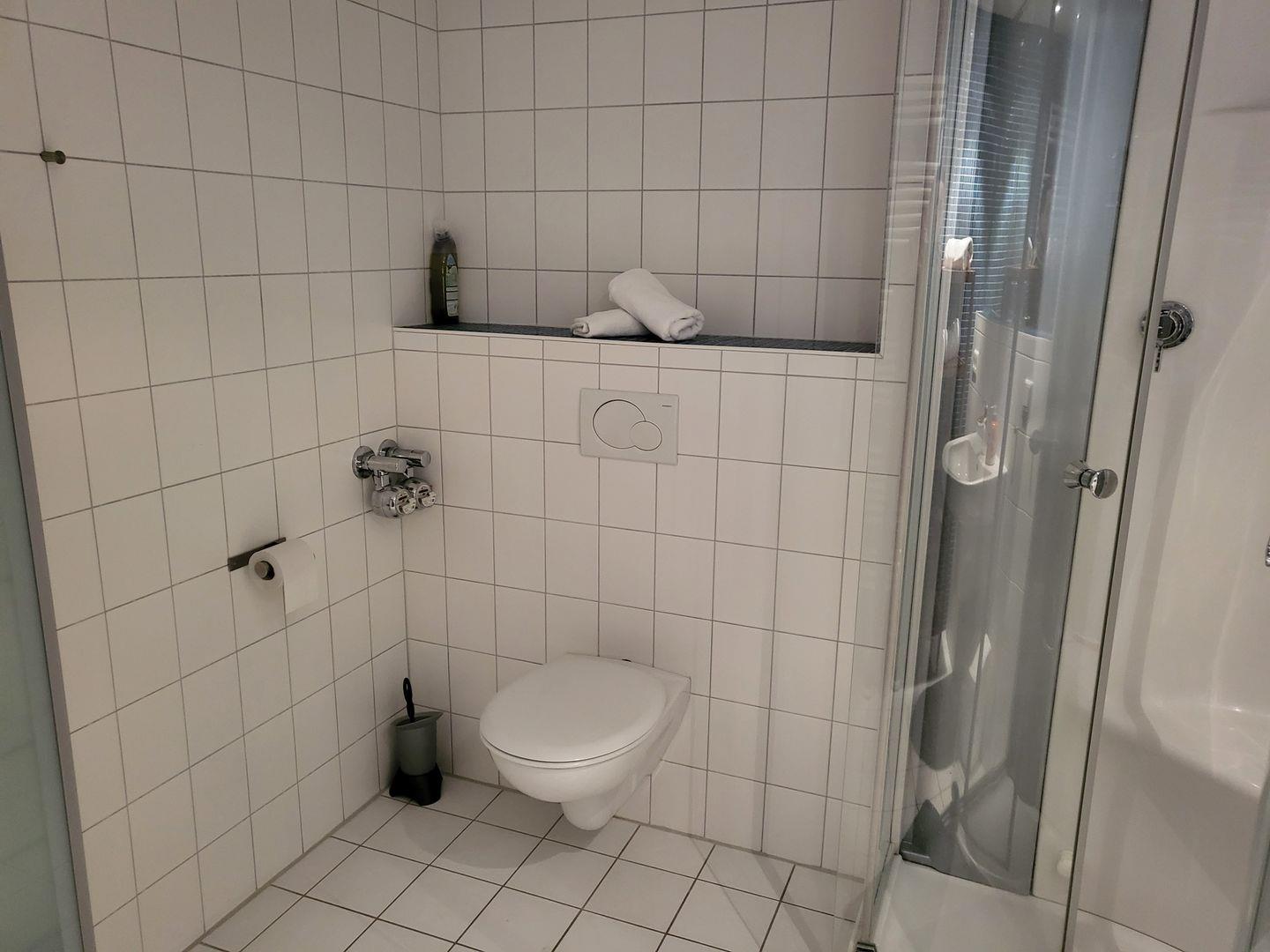 Das moderne Badezimmer ist ausgestattet mit Dusche und WC.