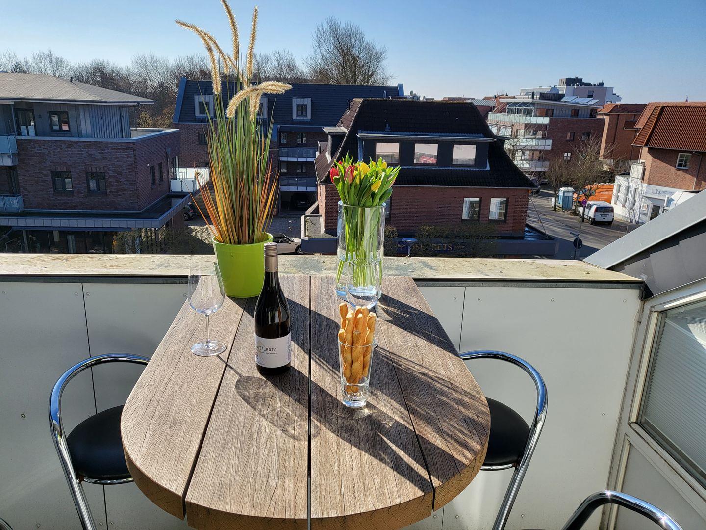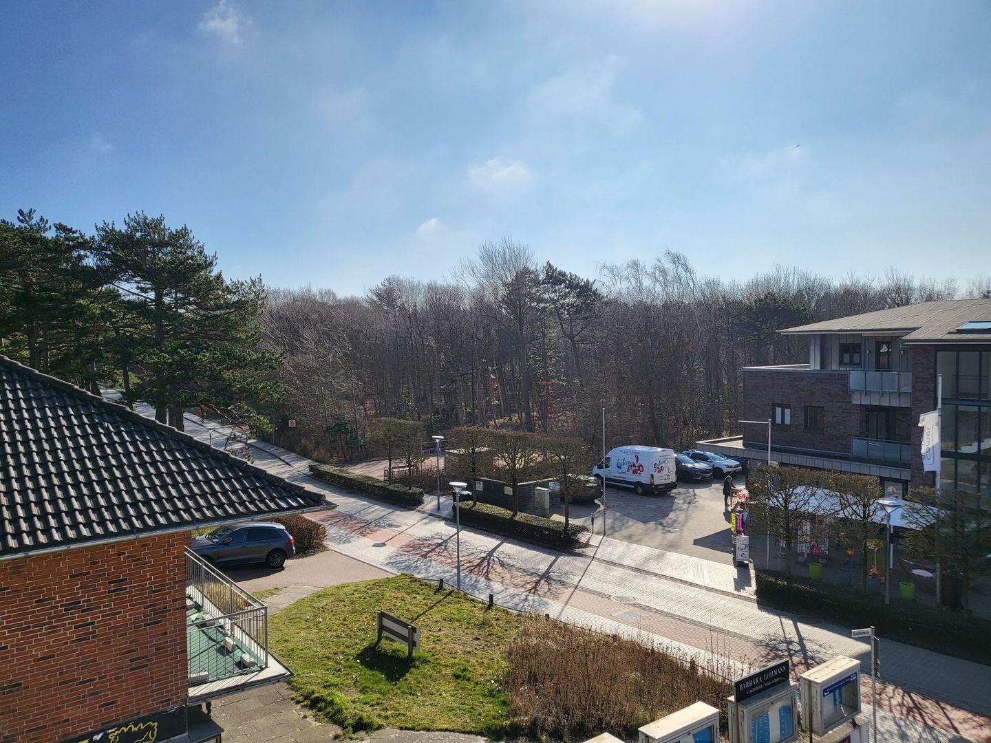 Zur zentral gelgenen Ferienwohnung gehören zwei möblierte Balkone. Einer bietet einen grandiosen Ausblick über die Flaniermeile und den Kiefernwald, der zweite, überdachte Balkon bietet ist seitlich ausgerichtet und überdacht.